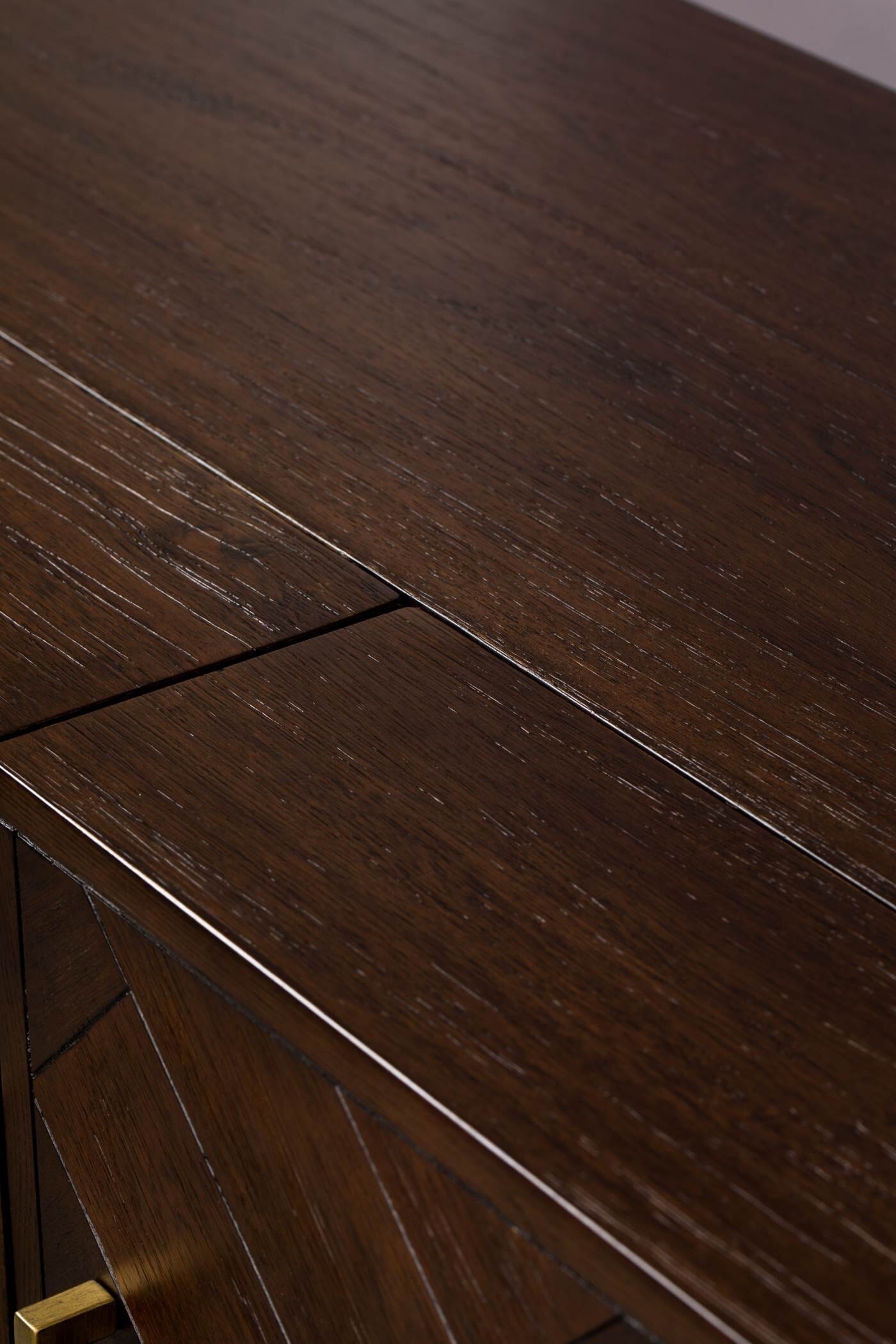 Antik Messing ist aber auch noch als Nostalgiefaktor mit im Spiel, an schönen Details mangelt es aber auch nicht: Ein feines Fischgrätmuster aus Akazie paart sich mit den smarten Griffen aus Metall.