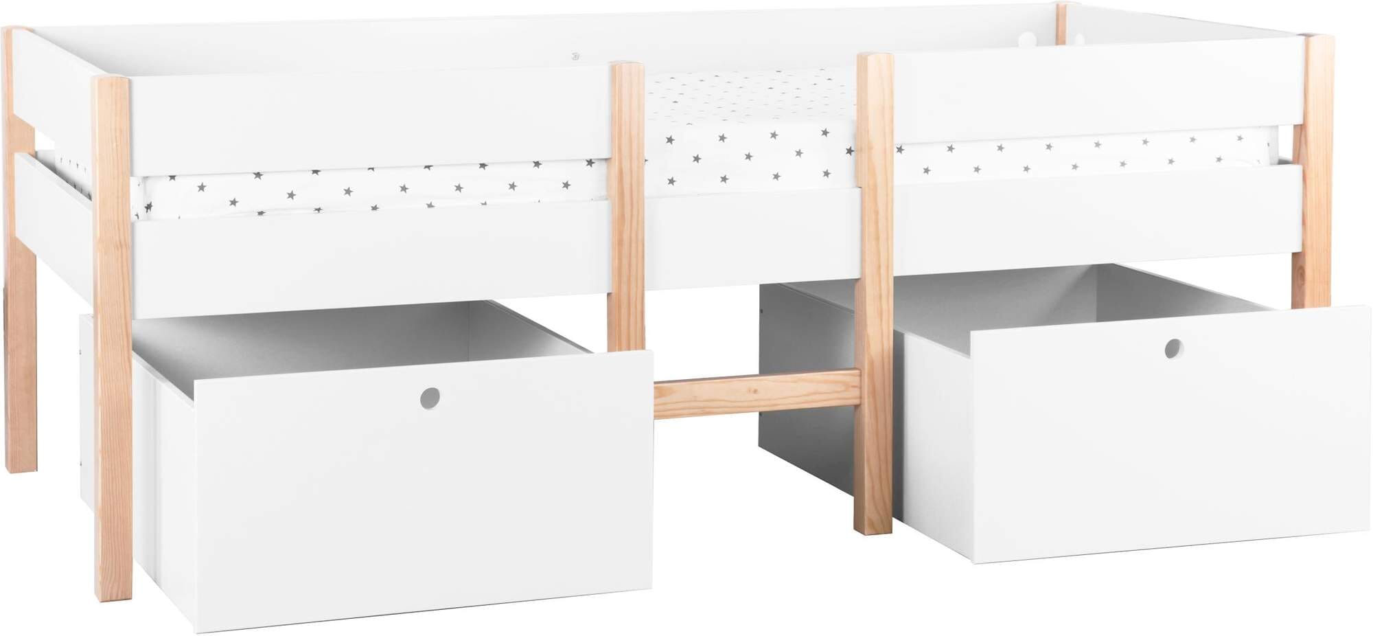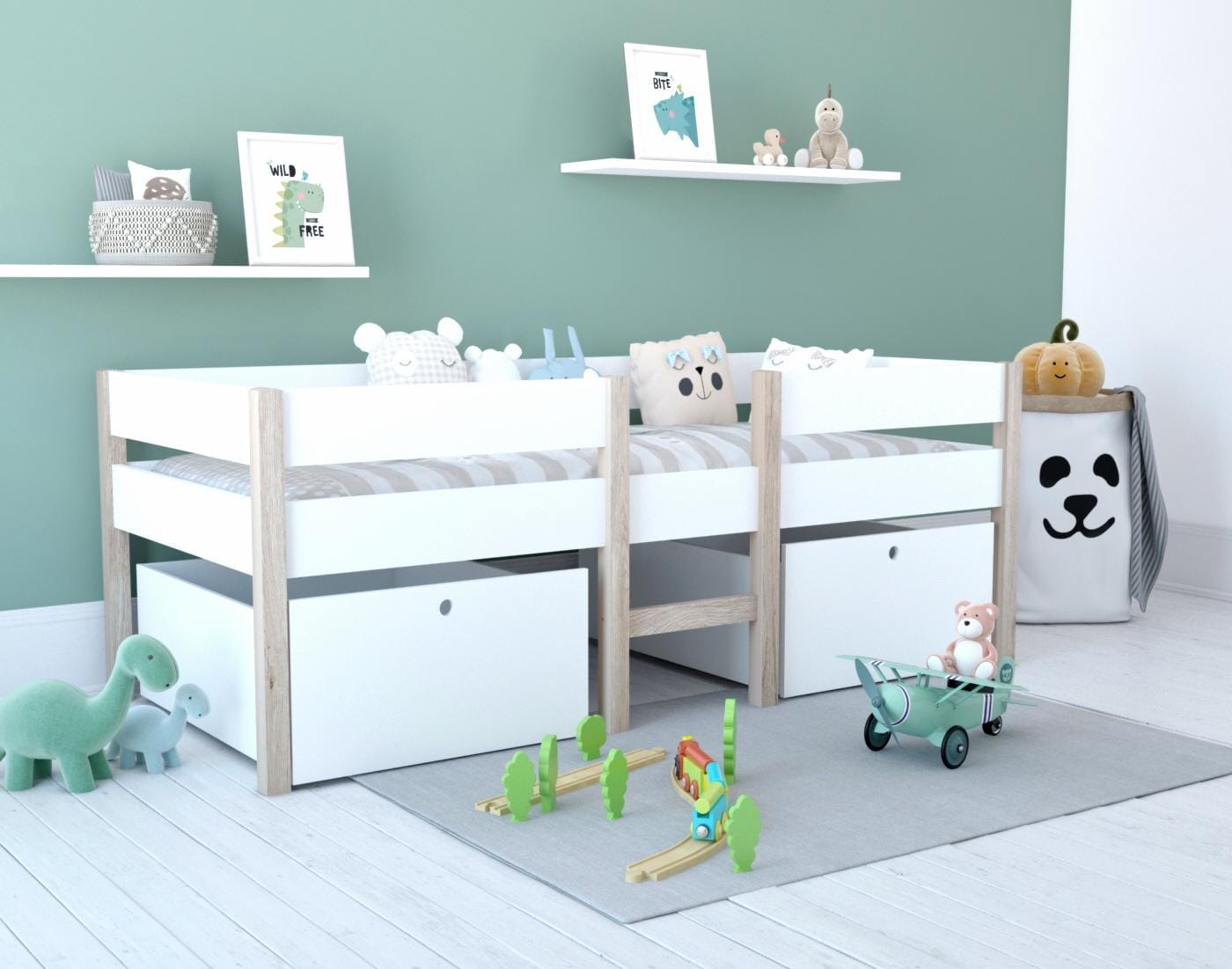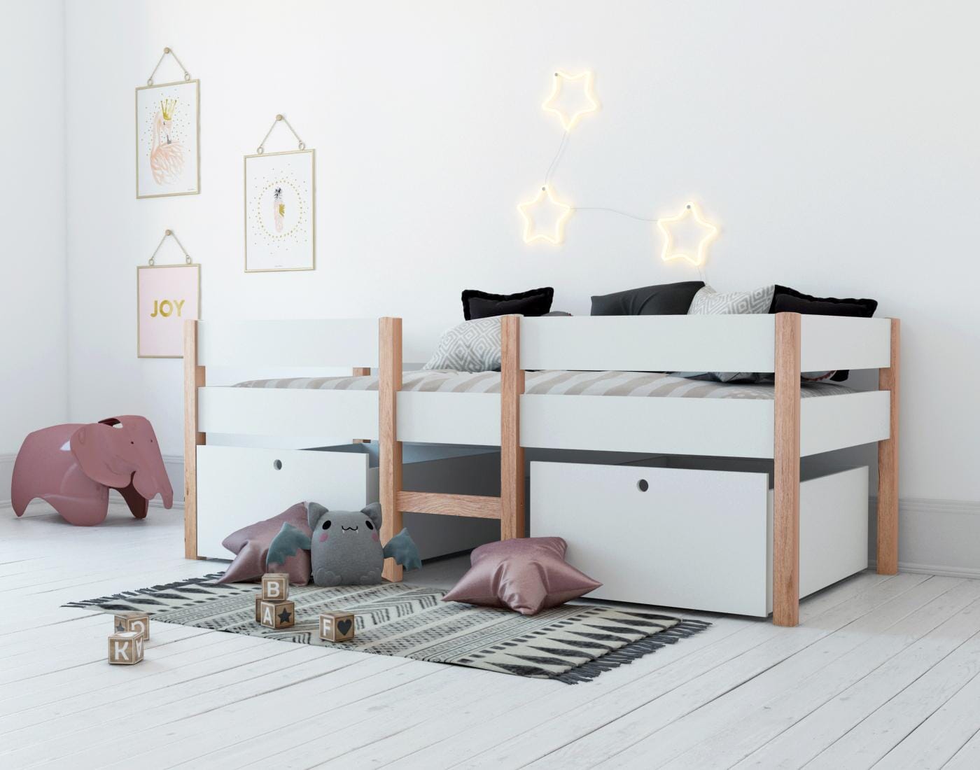 Zwei große Schubladen sorgen für Ordnung und bieten genügend Stauraum für Spielsachen und Co. Das Hochbett überzeugt mit seiner skandinavisch schlichten Eleganz und bietet eine moderne Unisex Lösung für ein breites Spektrum an Kinderzimmereinrichtung und Altersstufen.