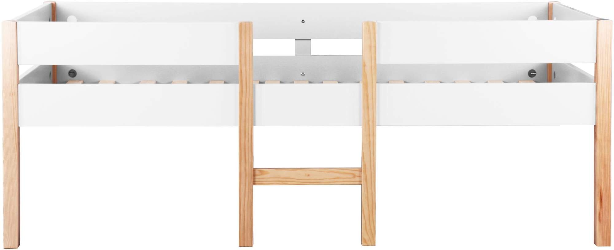 Der Lattenrost für eine Matratzengröße von 90 x 200 cm ist im Lieferumfang enthalten. Das Bett besteht aus weiß lackiertem MDF und Pinienholz.
