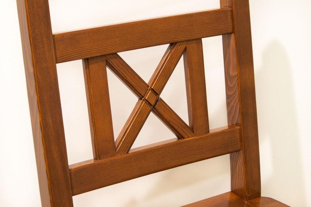Der Esszimmerstuhl von Rossetti ist aus massiver Fichte gefertigt. Zwischen den waagerecht angebrachten Querfriesen findet sich die typische Kreuzsprosse. Alle Sprossen und Querverbindungen mit Stuhlbeinen und Lehne sind gedübelt. Die Sitzfläche ist von unten auf den Stuhlrahmen geschraubt.