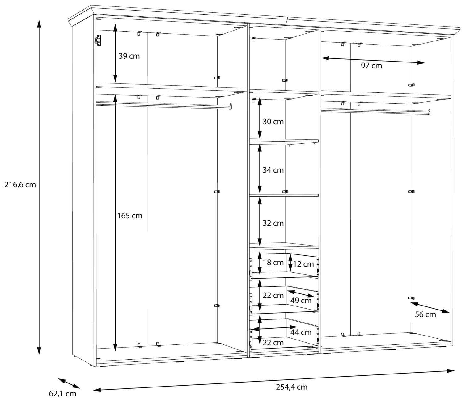 - Maße: B/H/T 254,4 x 216,6 x 62,1 cm