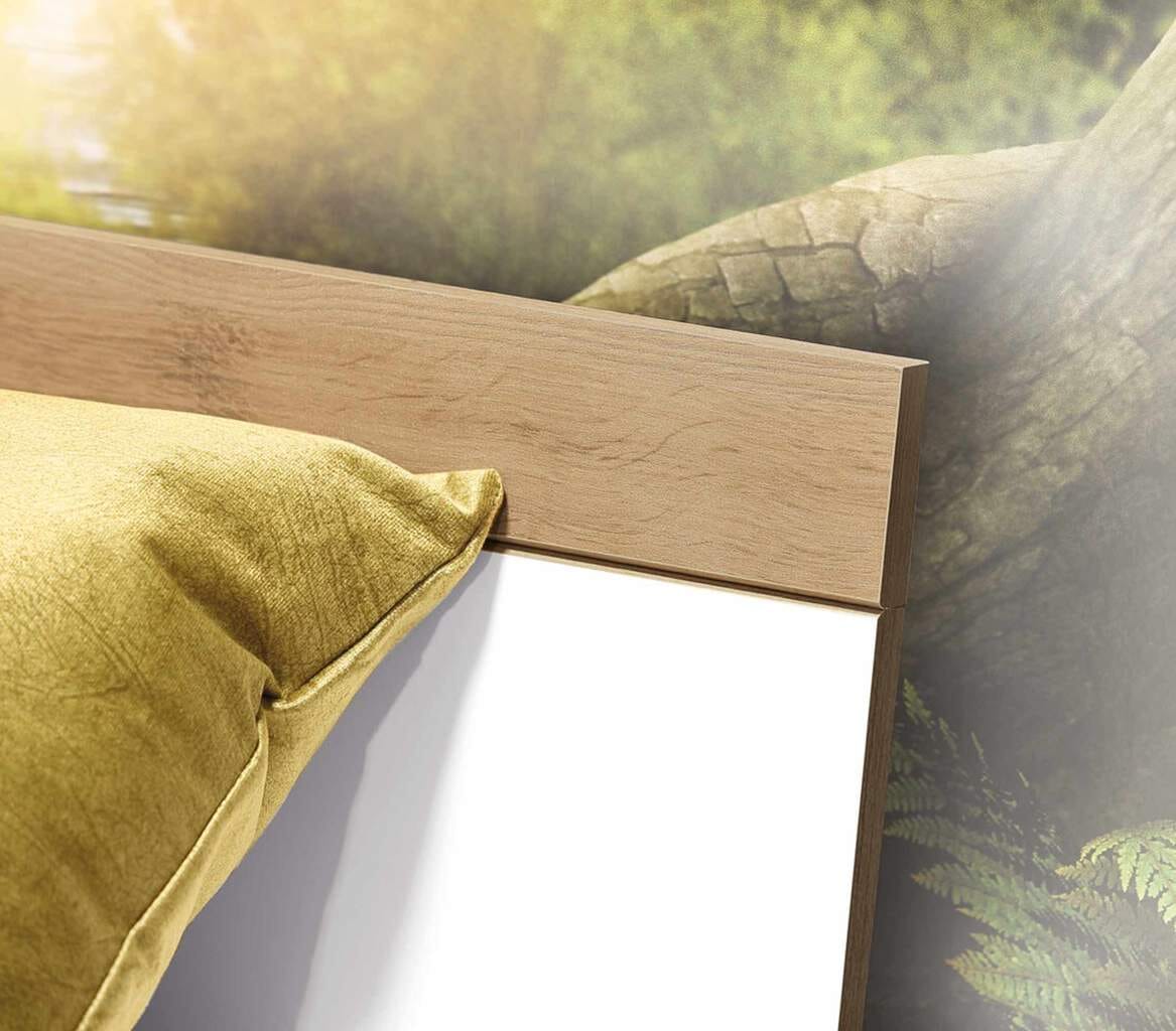Ein Kopfteil sorgt für den universellen Einsatz des Betts. Gemütlich im Bett fernsehen, ein bisschen am Laptop arbeiten und surfen, das gute Buch lesen: So wird das Bett zur Playstation und natürlich zu gegebener Zeit zum Ruheort, an dem man sich auf den nächsten Tag einstimmen kann. Zur Verstärkung eilen noch Metallbeschläge herbei, die Excenter-Verbindungen sorgen dafür, das alles hält. Sweet dreams, in diesem breiten Bett werden sie möglich!