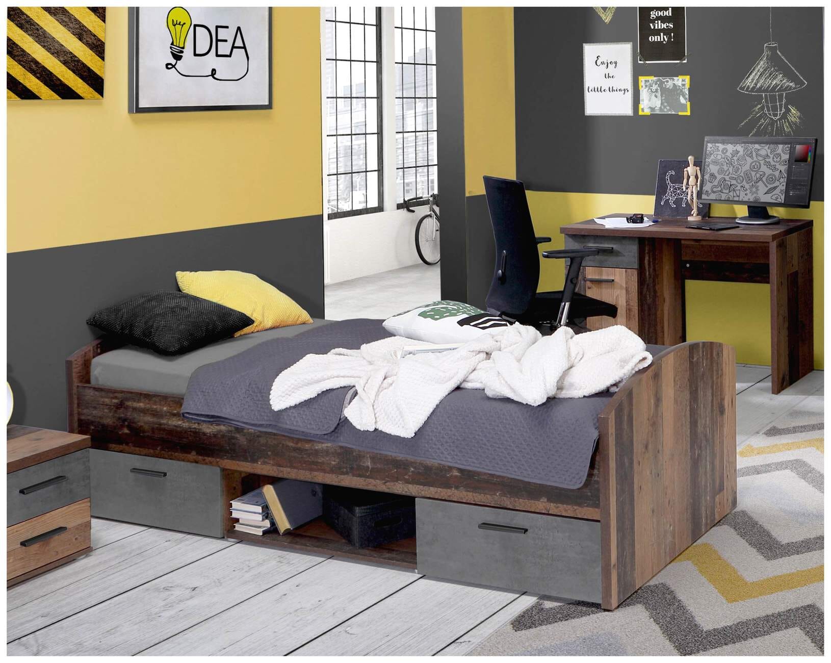 Mit seiner rustikalen Optik zieht das Einzelbett WINNIE neugierige Blicke auf sich. Die Optik aus Beton und altem gebrauchten Holz ist eine tolle Kombination, die nicht nur die Freunde des Industriedesigns anspricht. Sie ist puristisch, aber nicht kalt und zeigt sich darüber hinaus auch mit einer gewissen Zeitlosigkeit. Im unteren Bereich ist das Bett mit zwei geräumigen Schubladen ausgestattet, die praktischen Stauraum für Spielzeug, Kleidung und Co. zur Verfügung stellen und so das Ordnunghalten im Kinderzimmer erleichtern.