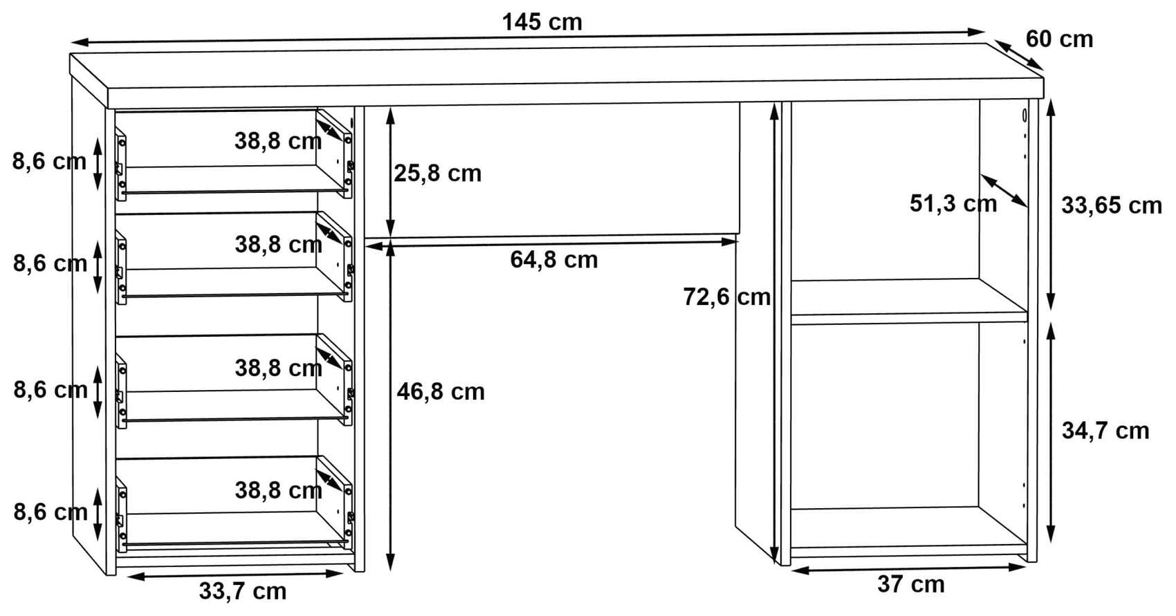 - Schreibtisch Netbob: 1 Tür, 4 Schubladen, B/H/T 145 x 76,3 x 60 cm