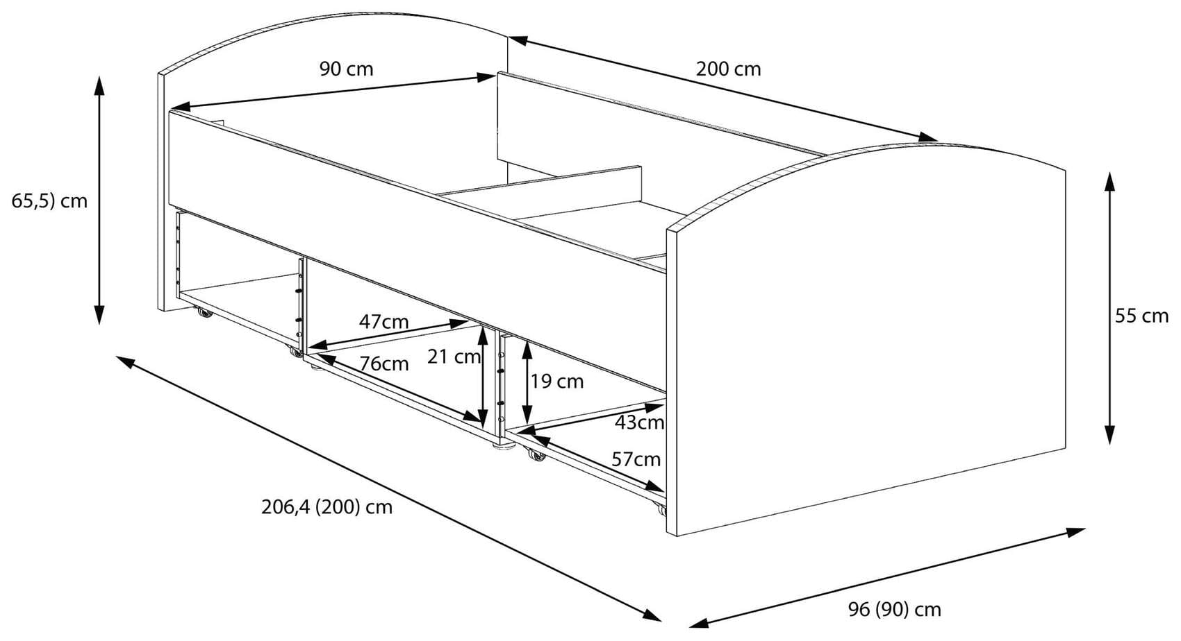 - Jugendbett Winnie 90 x 200 cm: mit 2 Schubladen, B/H/T 96 x 65 x 206,4 cm