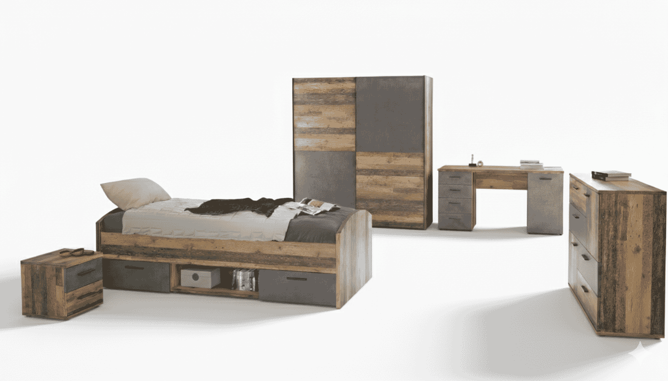 Ihr Kind wird begeistert sein von dieser schönen Ausstattung. Hier passt alles zusammen. Die Möbel in Old Wood Vintage, kombiniert mit dunkelgrauer Betonoptik, machen das Jugendzimmer zu einer Wohlfühloase.