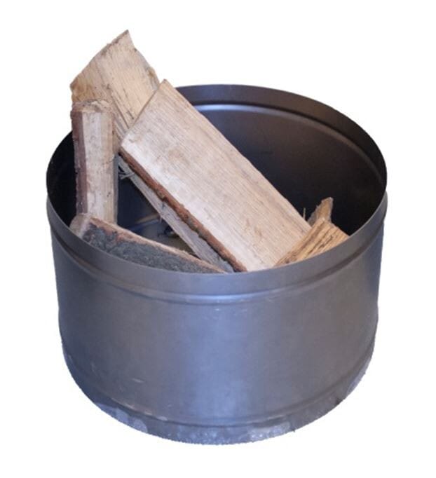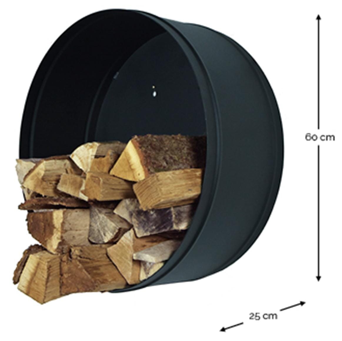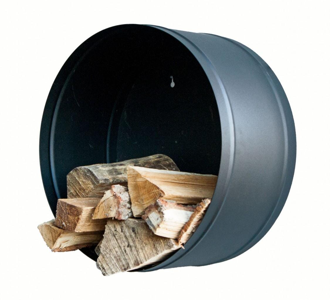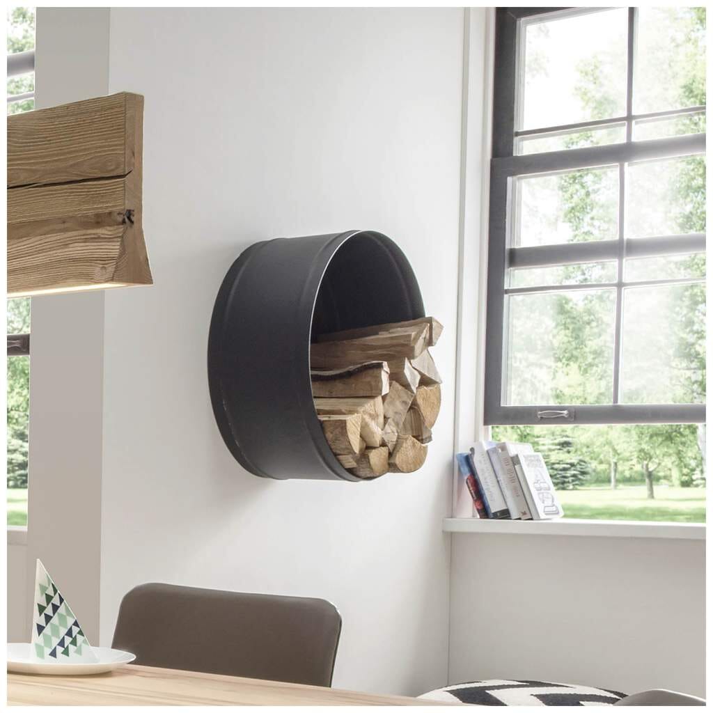 Die runde Metall-Ablage kann nicht nur für Kaminholz genutz werden, sondern auch als offenes, dekoratives Wandregal.