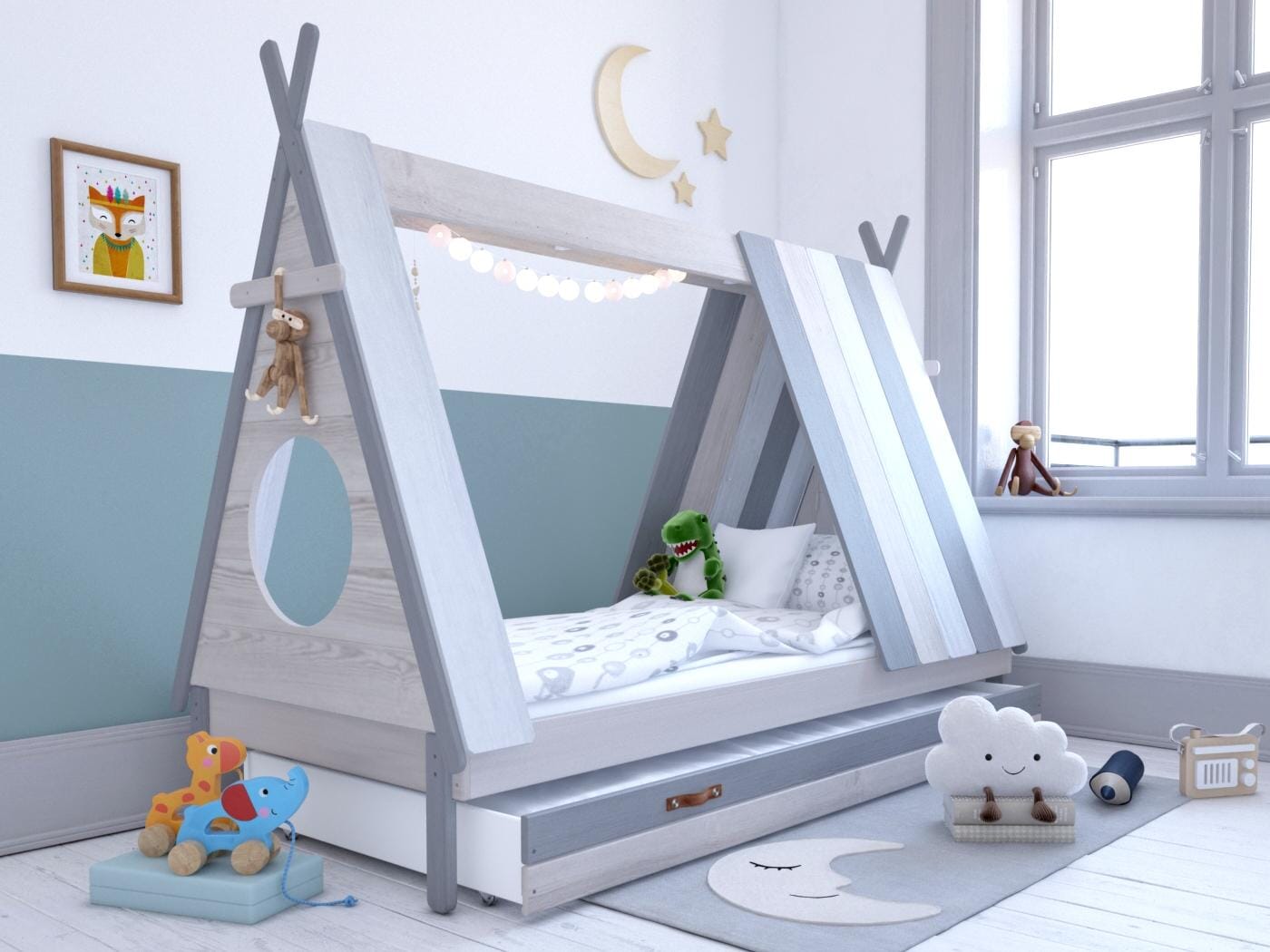 Dieses Bett sorgt durch seine einzigartige Form nicht nur für schöne Träume, sondern ist tagsüber auch ein schöner Spielort für Ihren Liebling. Die Holzlatten in gedeckten Blau- und Grautönen harmonieren optimal mit verschiedensten Einrichtungsstilen und Farbkonzepten. Ob zu schlichten Möbeln in weiß oder grau oder als Ruhepol zu farbigen Möbeln, dieses Kinderbett ist eine moderne Unisex Lösung für das Kinderzimmer. Die beiden runden Fenster vorne und hinten im Bett sorgen für zusätzlichen Spielspaß.