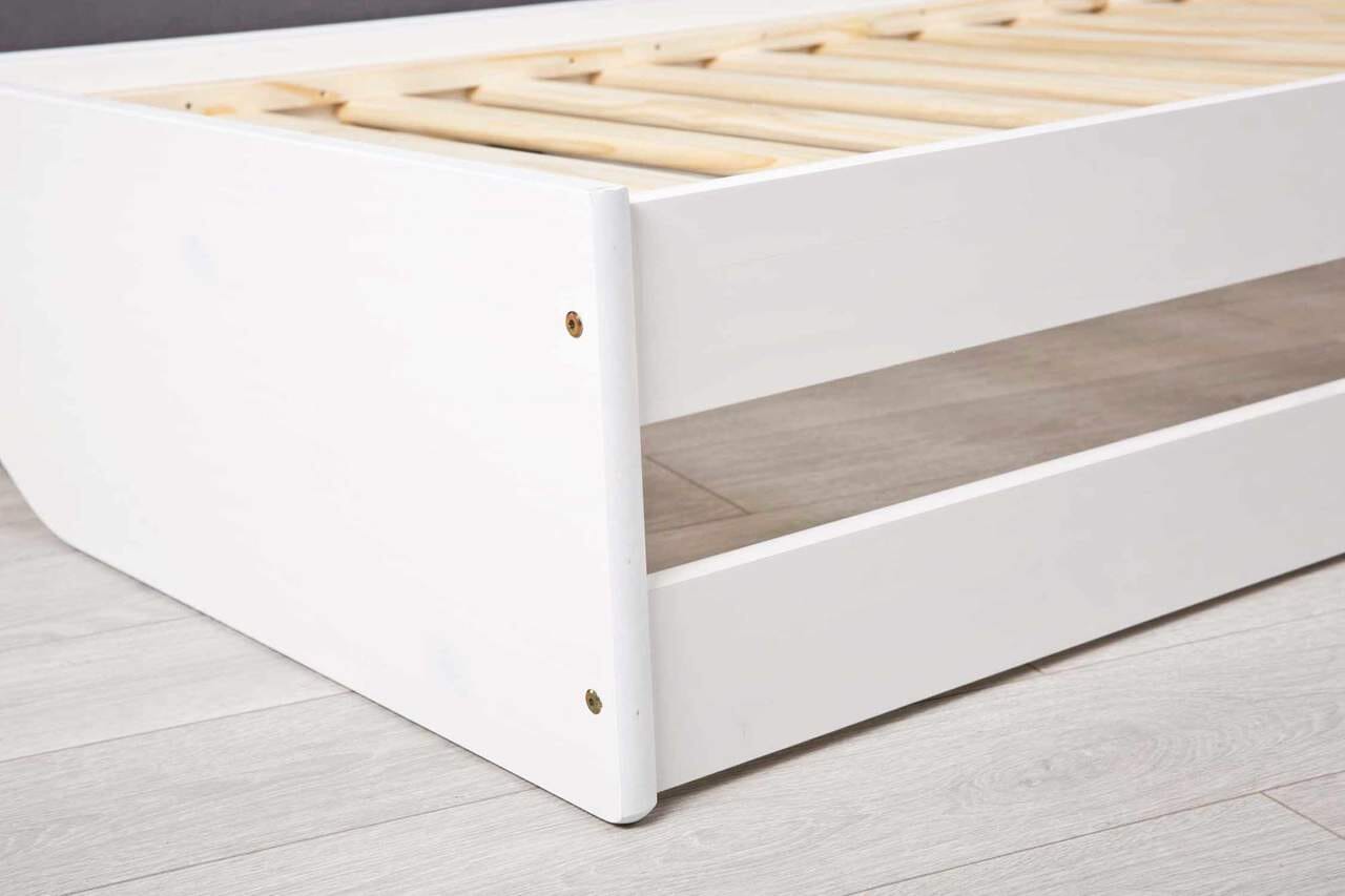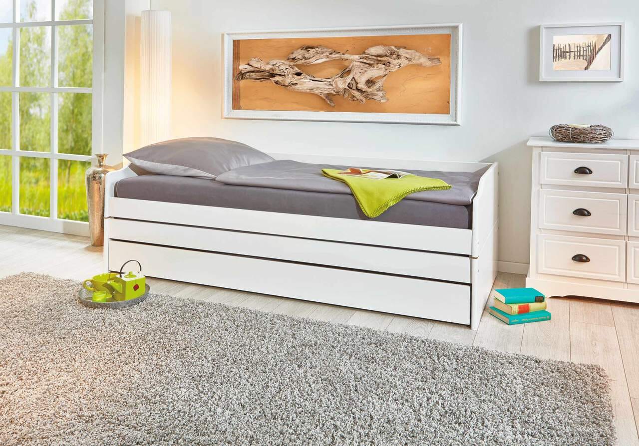 Die ausziehbare Schublade ist mit einer Bodenplatte ausgestattet und kann wahlweise als Liegefläche oder als Stauraum für z.B. Bettwäsche verwendet werden. Ein Lattenrost wird für die Schublade nicht benötigt.