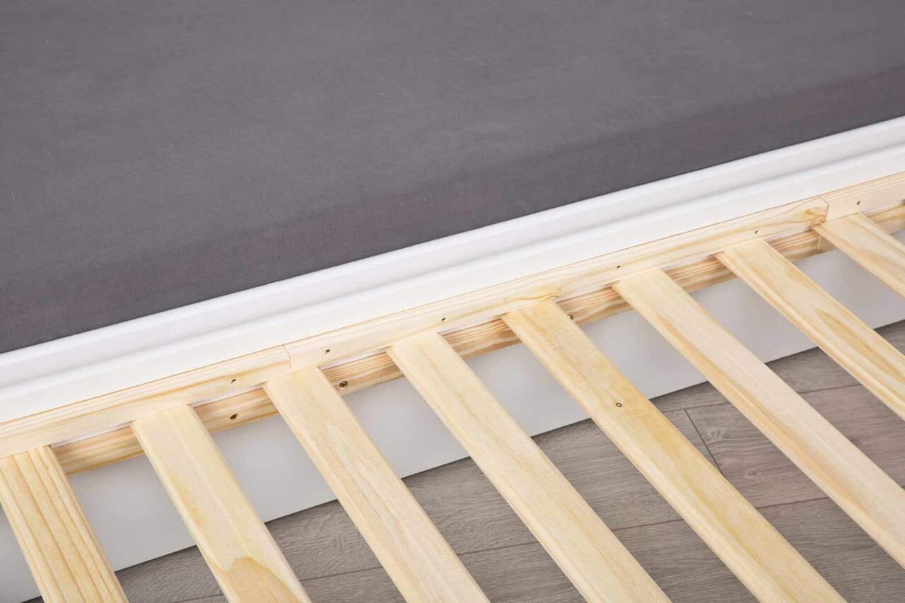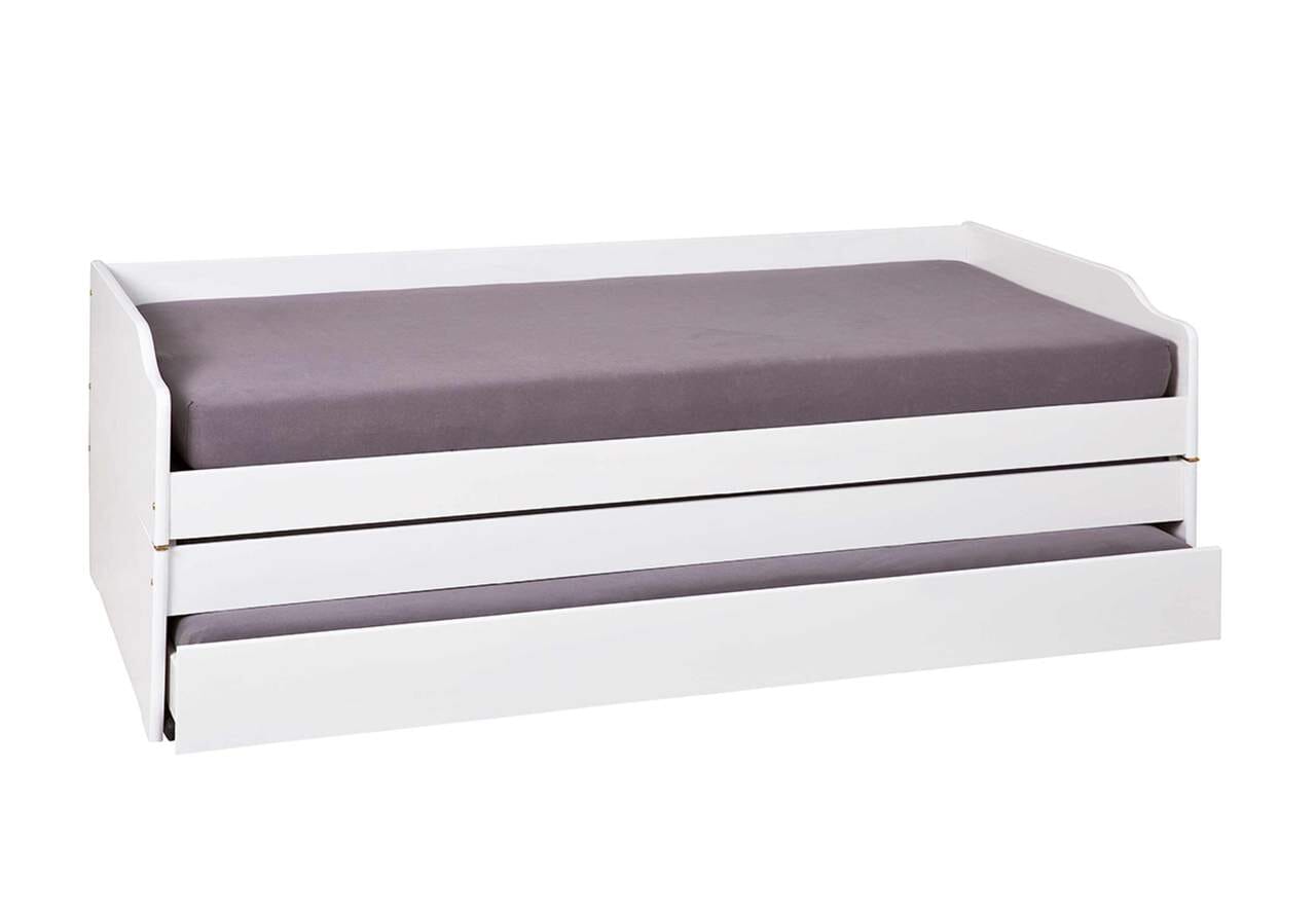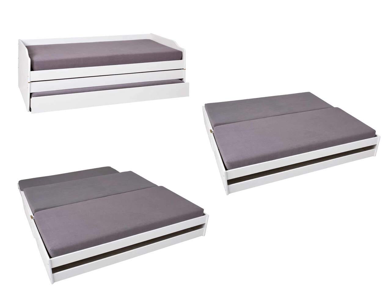 Das weiße Gästebett aus Kiefer Massivholz mit Klappfunktion wird, zur einfachen Selbstmontage, ohne Matratzen mit drei Roll-Lattenrosten geliefert.