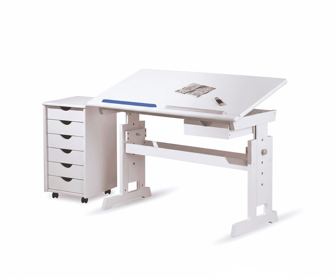 Als besonderen Clou besitzt der Kinderschreibtisch eine schwenkbare Tischplatte. Die Platte ist neigbar und ermöglicht ein ermüdungsfreies Schreiben oder Zeichnen. Stauraum für die Stifte, Lineal und Co. findet sich rechts unter der Platte in Form eines herausziehbaren Fachs mit Griffmulde.