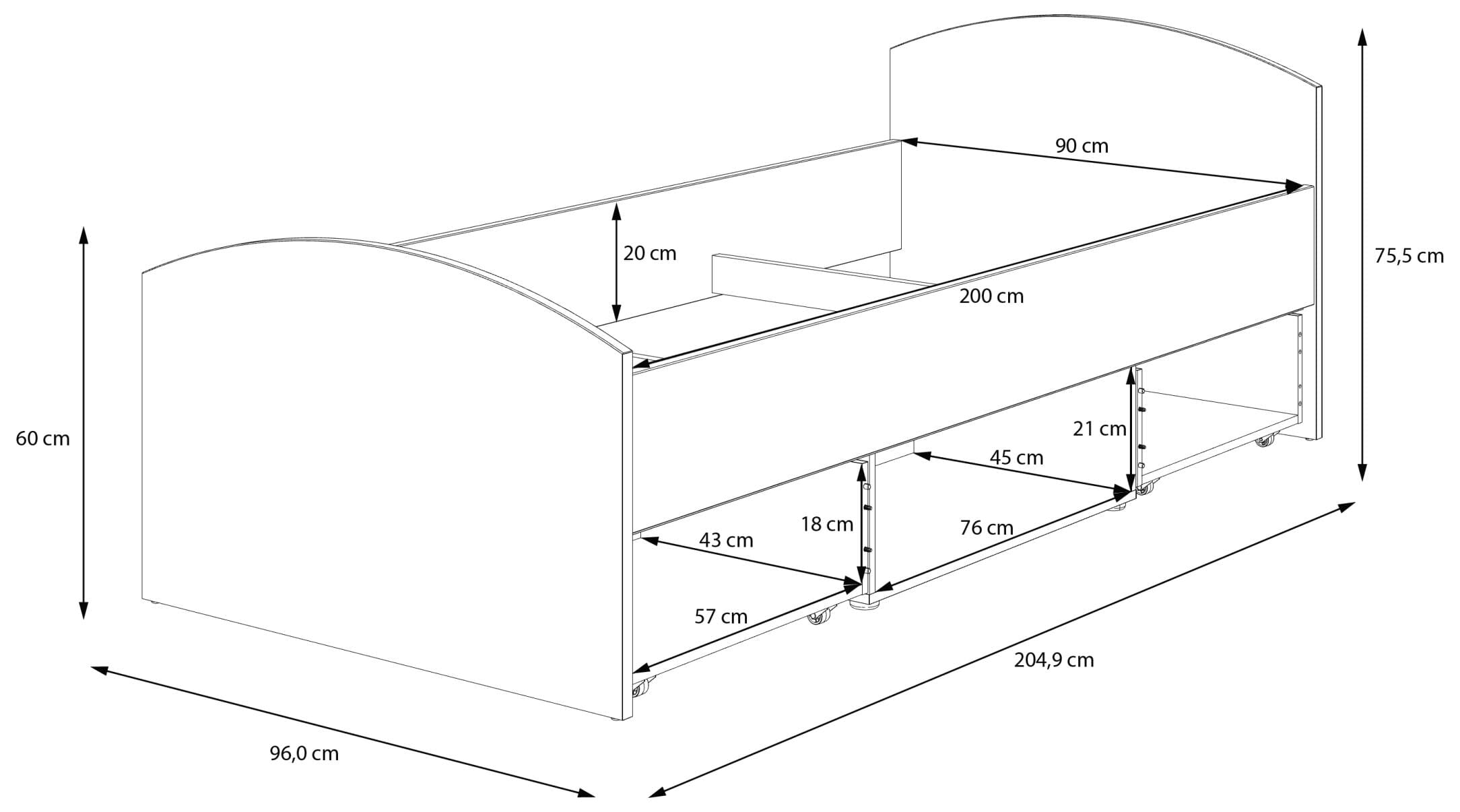 - Jugendbett 90 x 200 cm: mit 2 Schubladen,B/H/T 96 x 75,5 x 204,9 cm
