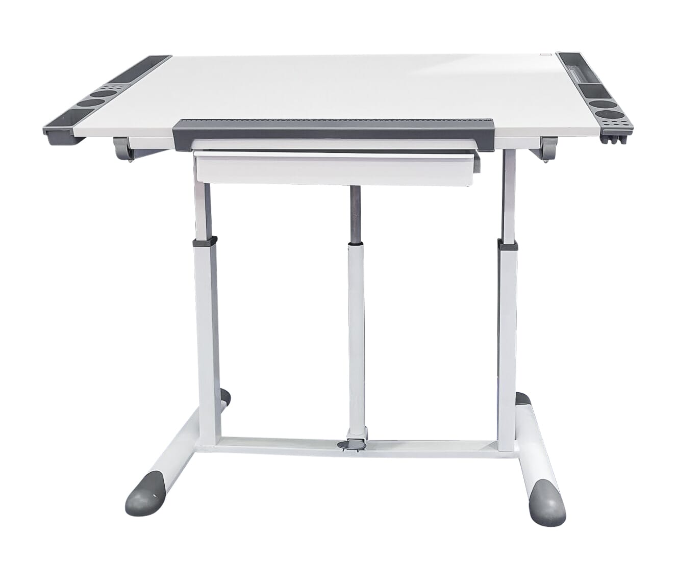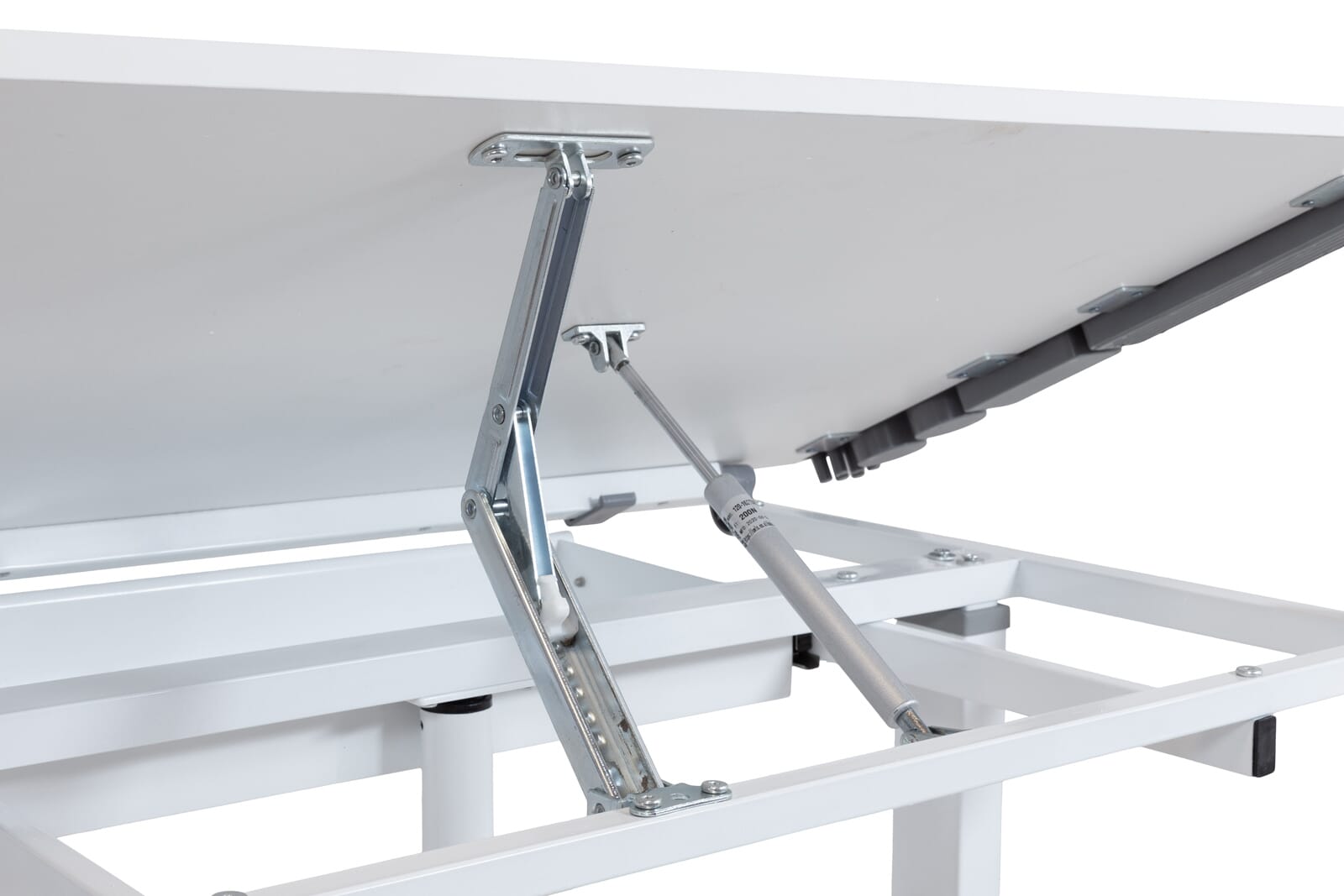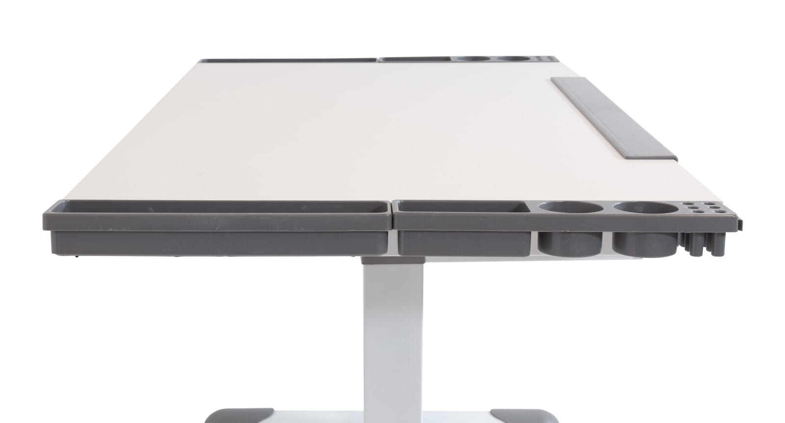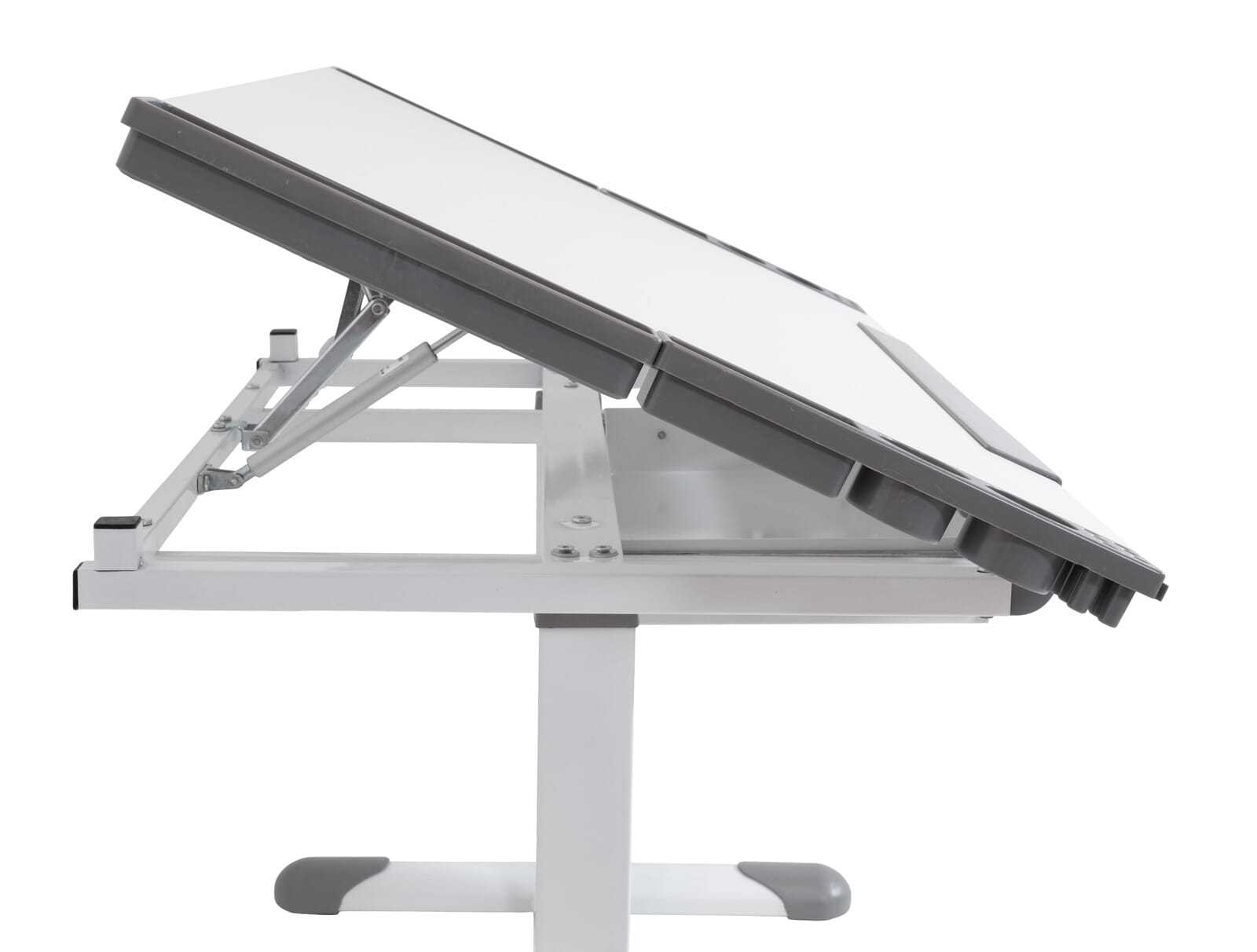 Der weiße Kinderschreibtisch mit grauen Kunststoffverblendungen hat eine große mit Melamin beschichtete Tischplatte, die über einen Pedal-Gas-Lift stufenlos höhenverstellbar ist.