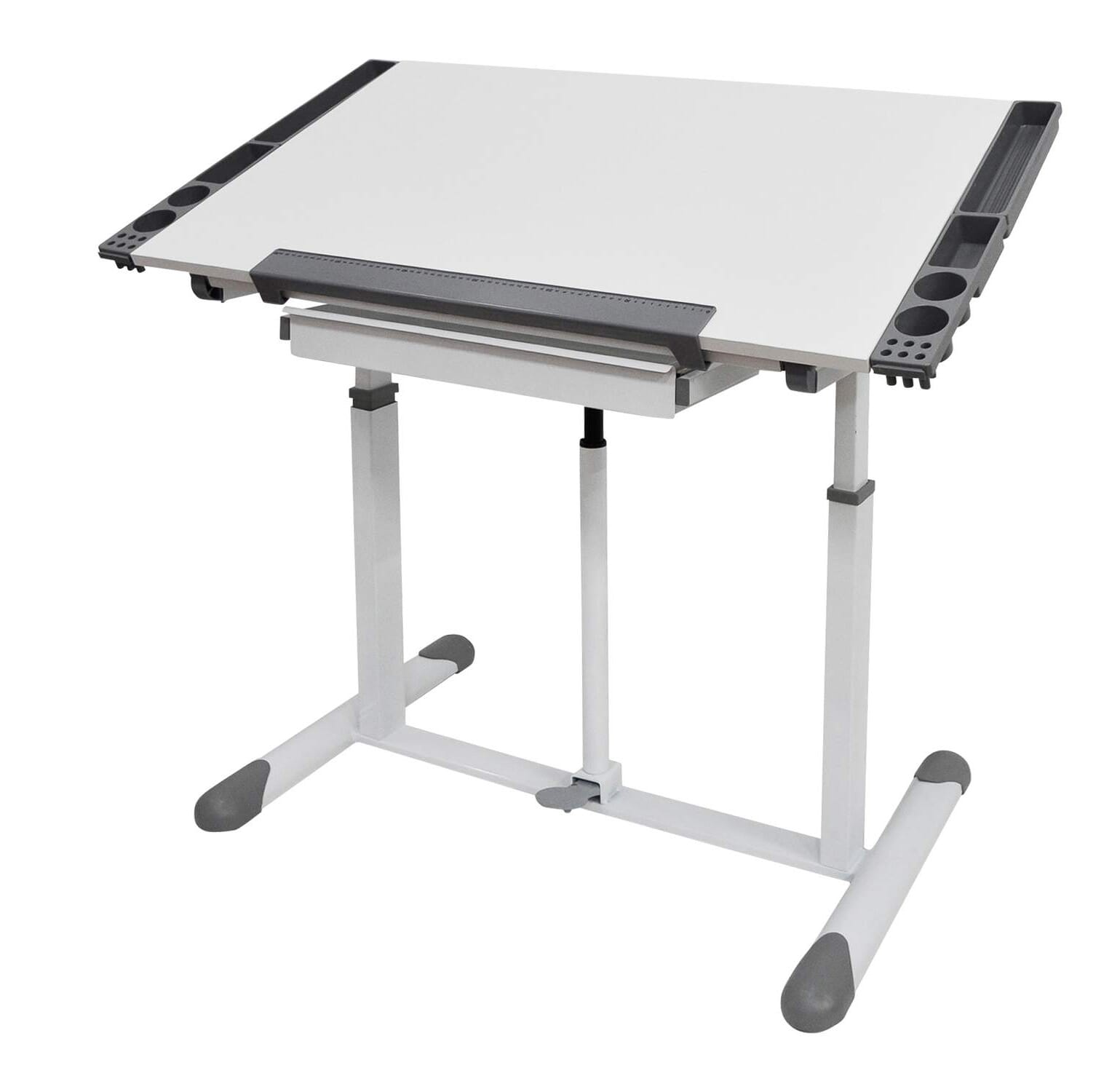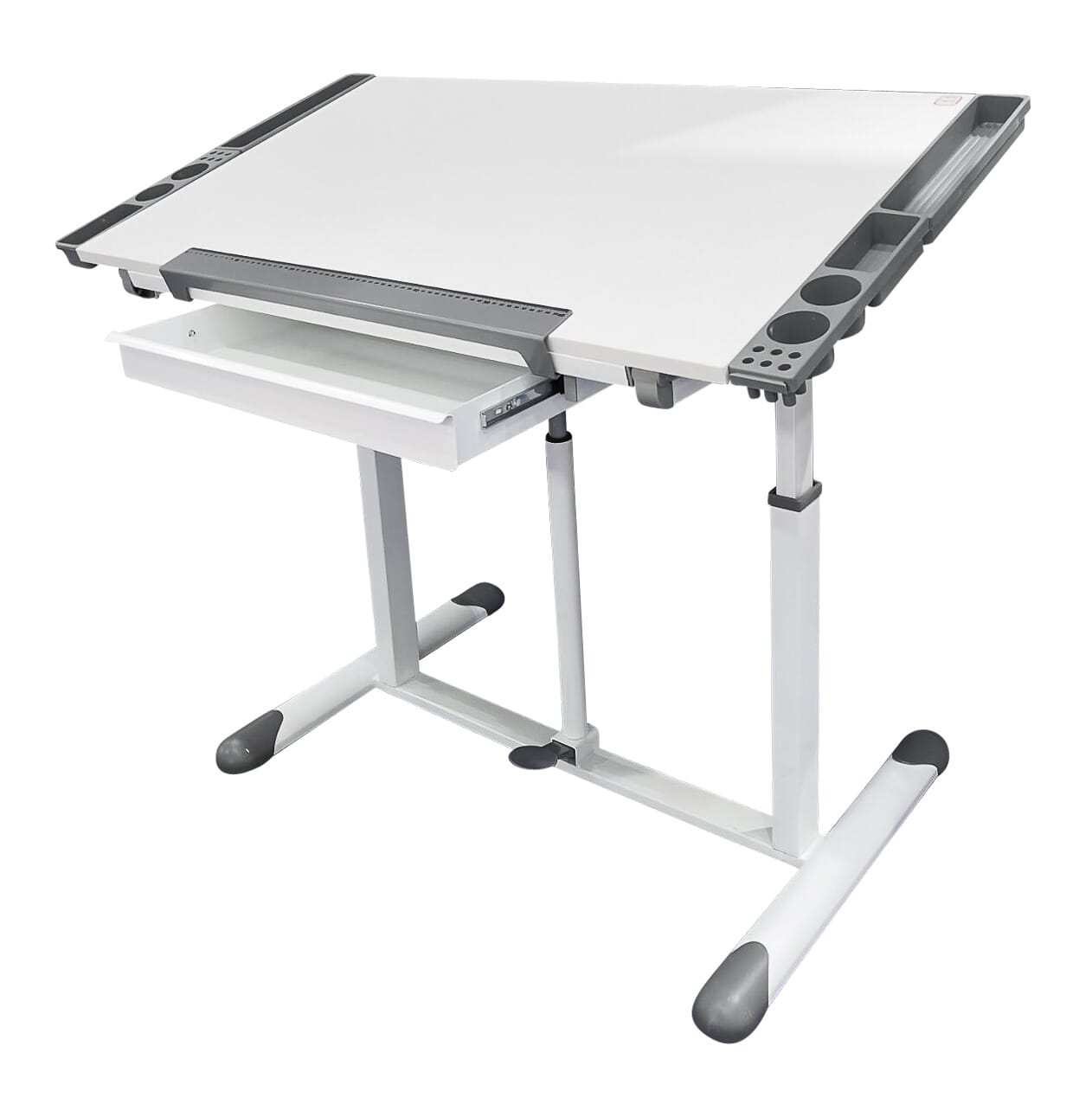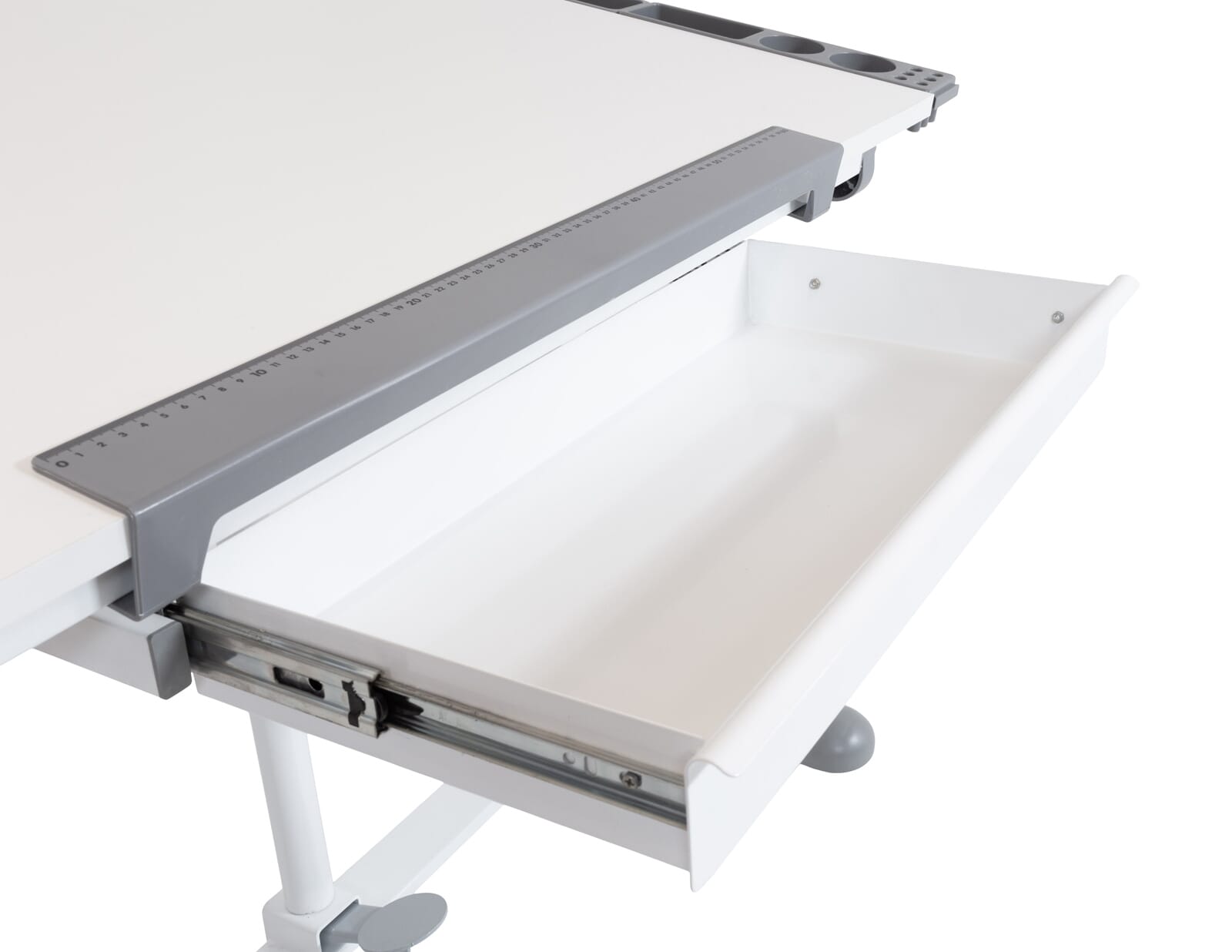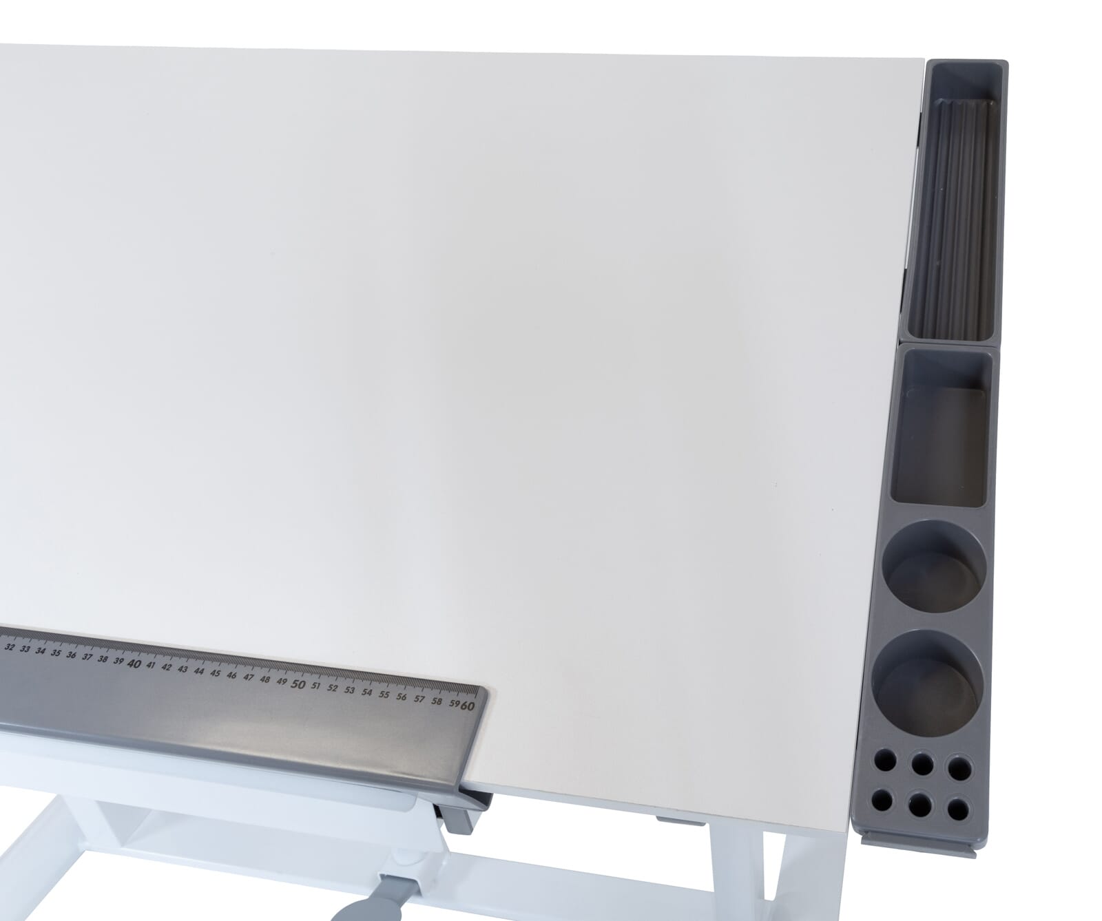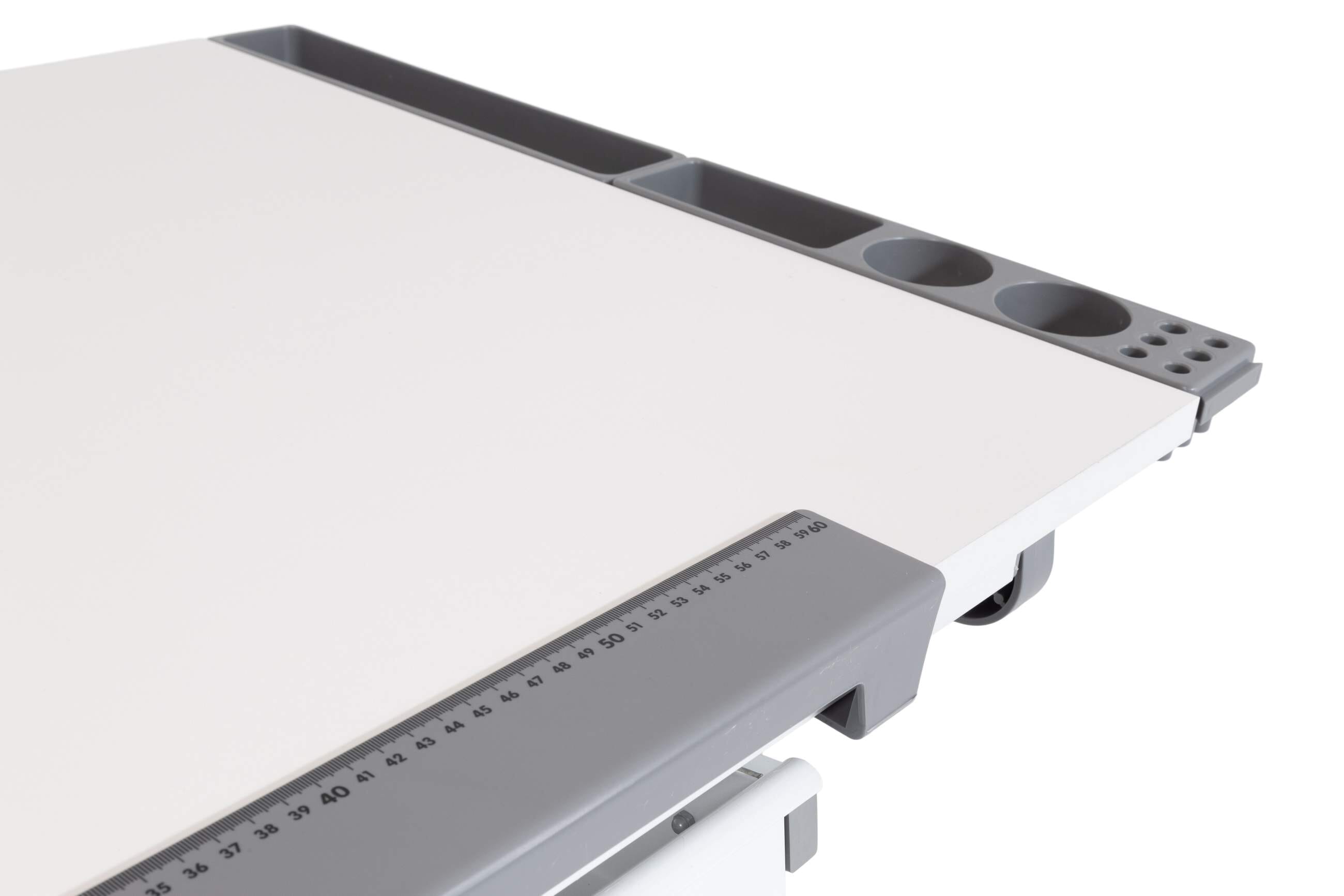 Sie kann waagerecht stehen oder in einem bestimmten Neigungswinkel. Eine abnehmbare Stopperleiste mit Millimeterscala verhindert, dass das Papier Stifte wegrutschen kann. Schreibutensilien lassen sich in der Metallschublade unterbringen. Außerdem gibt es Ablagen für Schreibutensilien und das Handy, die Sie beidseitig anbringen können.