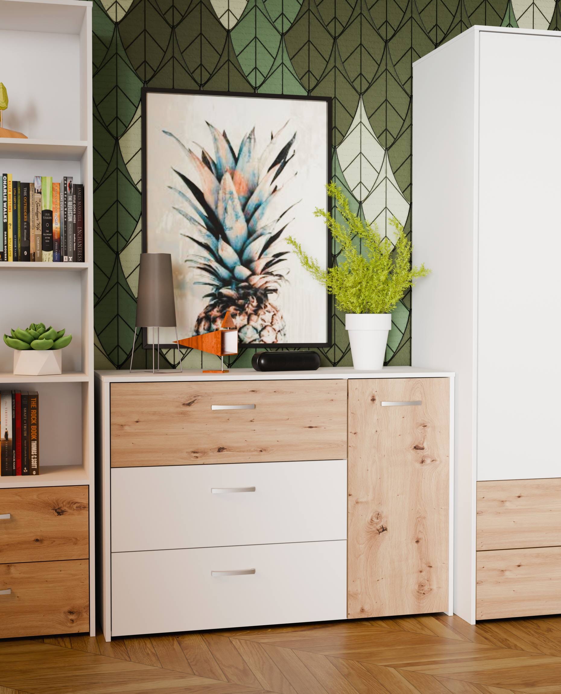 Sideboard CULGOA Kommode 3 Schubladen und 1 Tür, Artisan Eiche / Weiß