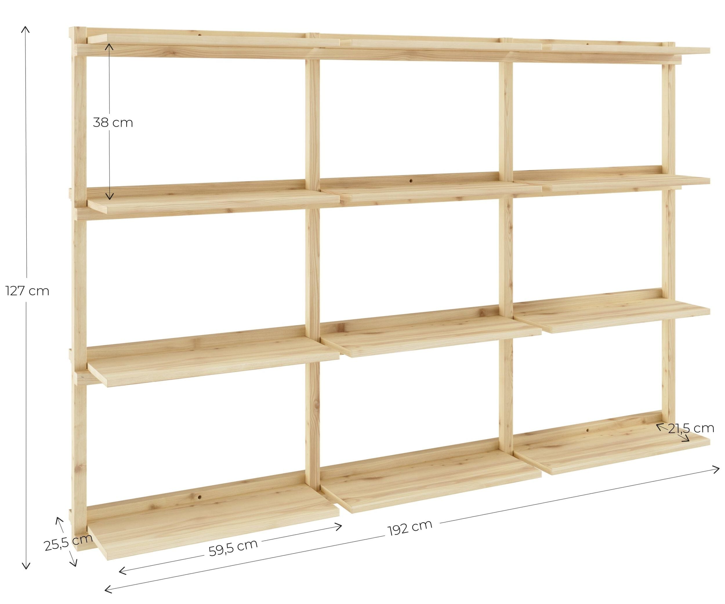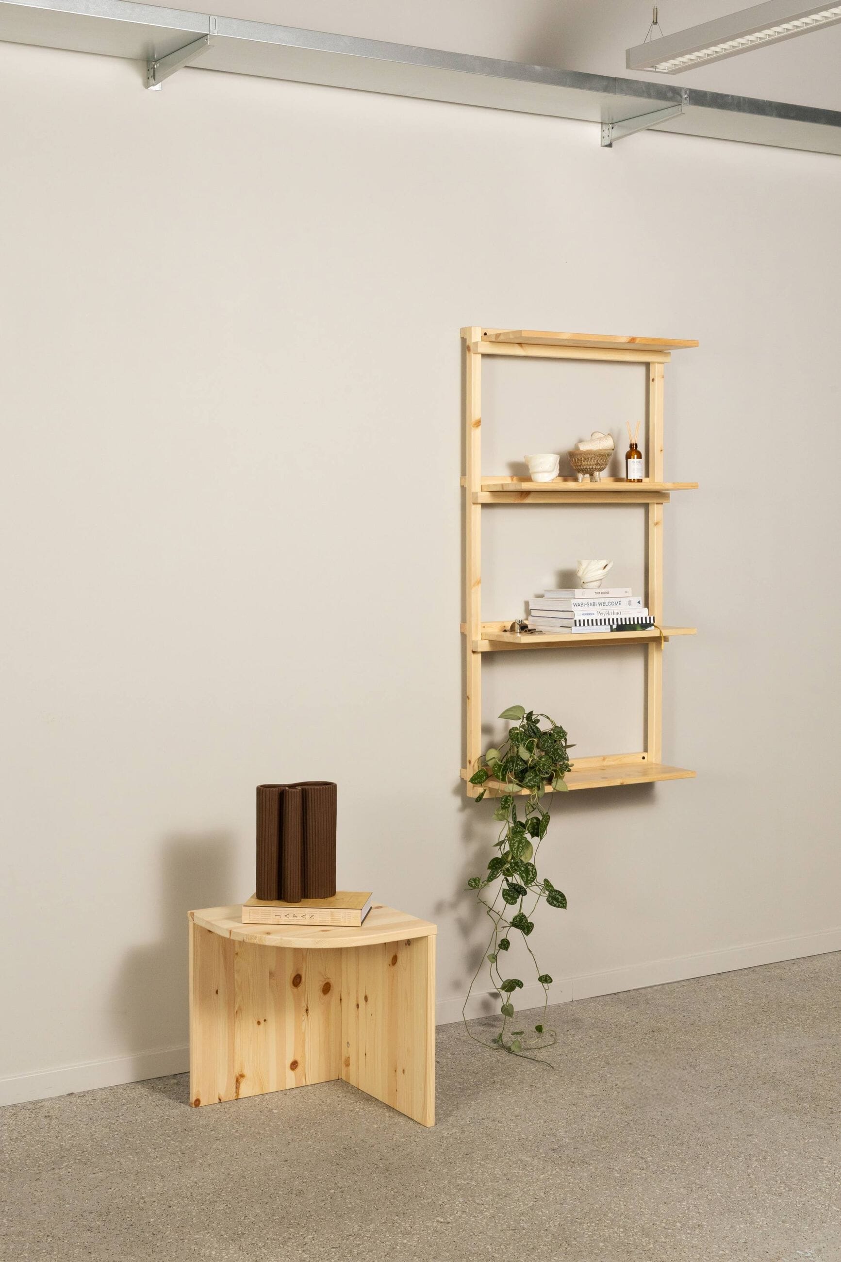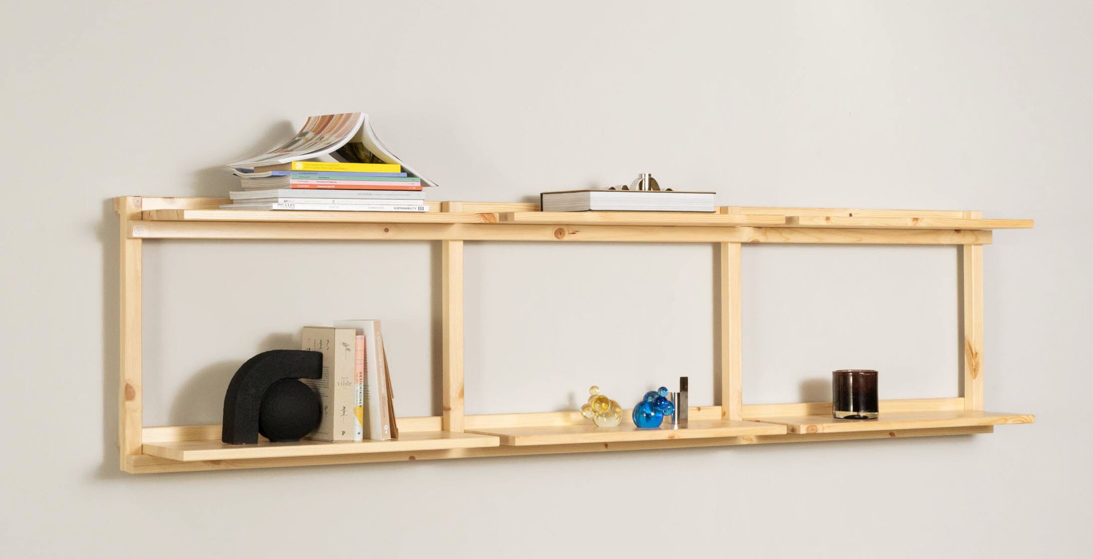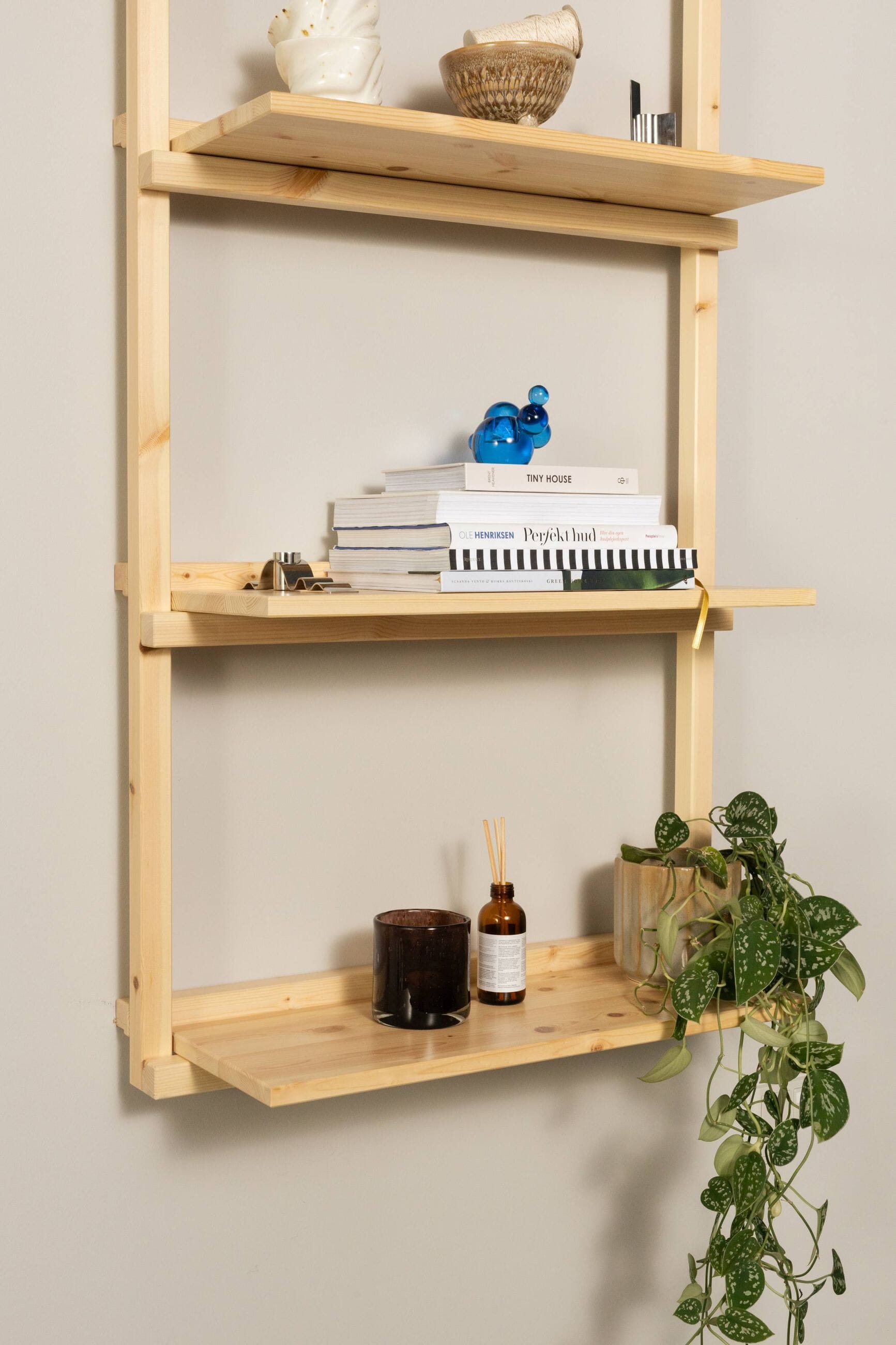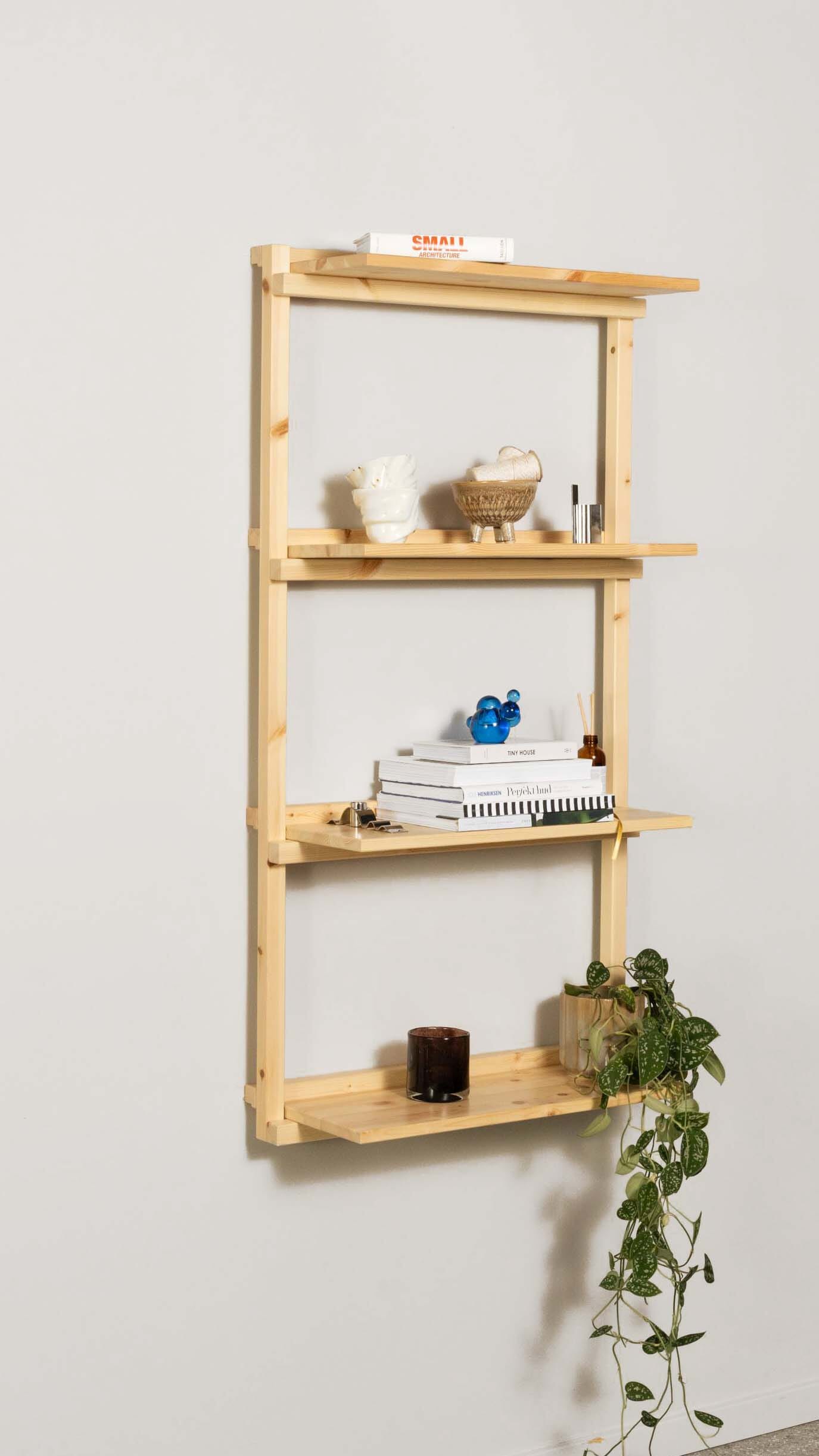 Nutze die Holzregale aus massivem Kiefernholz für Bücher, Pflanzen oder Dekorationsgegenstände – und erschaffe eine leichte, dynamische Optik.
