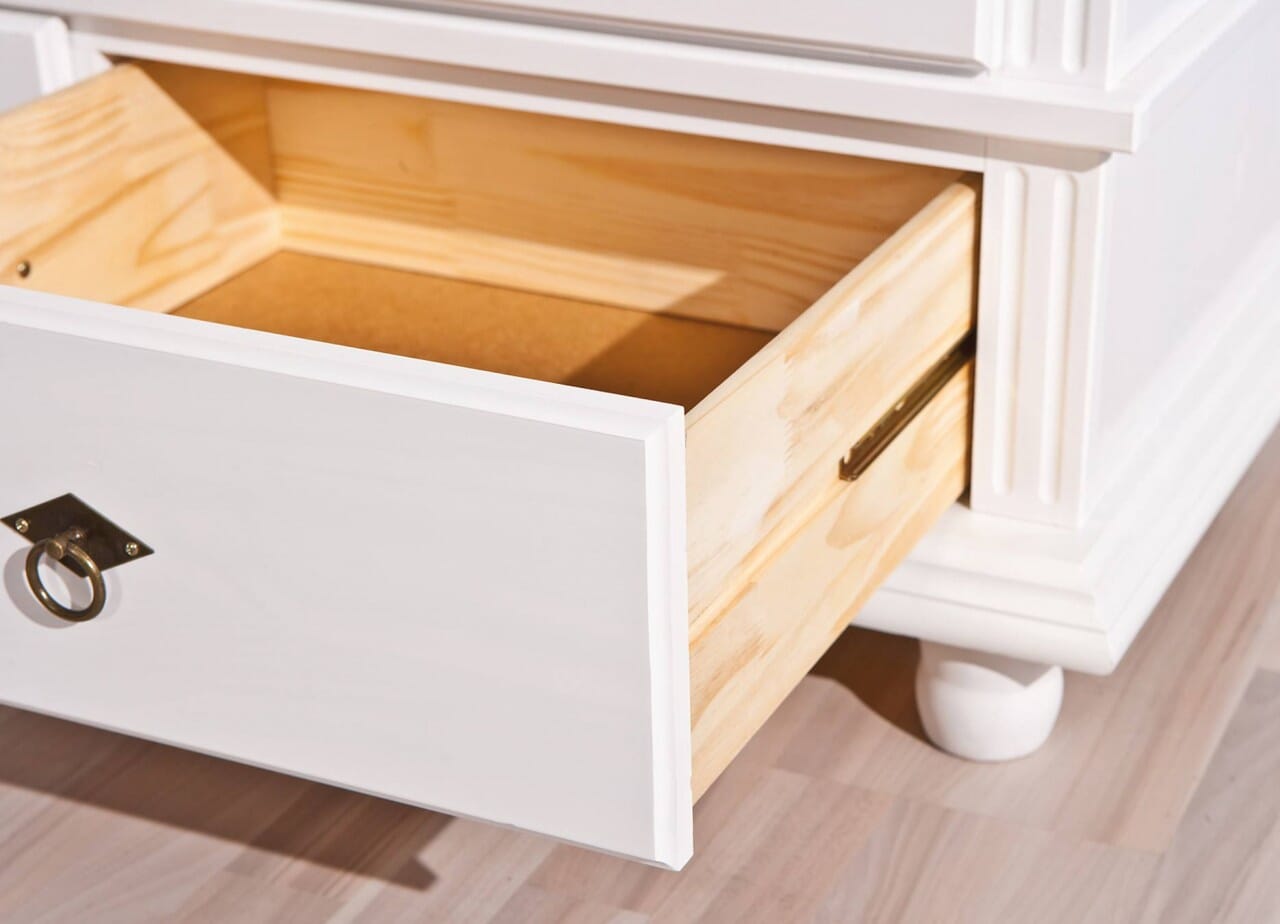 Die Türen sind ganz im schlichten Kassettendesign gehalten. Dahinter verbirgt sich die Brillanz eines wahren Raum-Künstlers. Die inneren Werte von DANZ verbergen zwei große Türen, die eine sinnvolle und praktische Einteilung vorweisen können. Und damit noch nicht genug: Den unteren Abschluss bilden zwei praktische Schubladen. Sie gleiten auf leichtgängigen Metallauszügen aus dem Korpus heraus und verleihen dem weißen Kleiderschrank den letzten optischen Schliff.