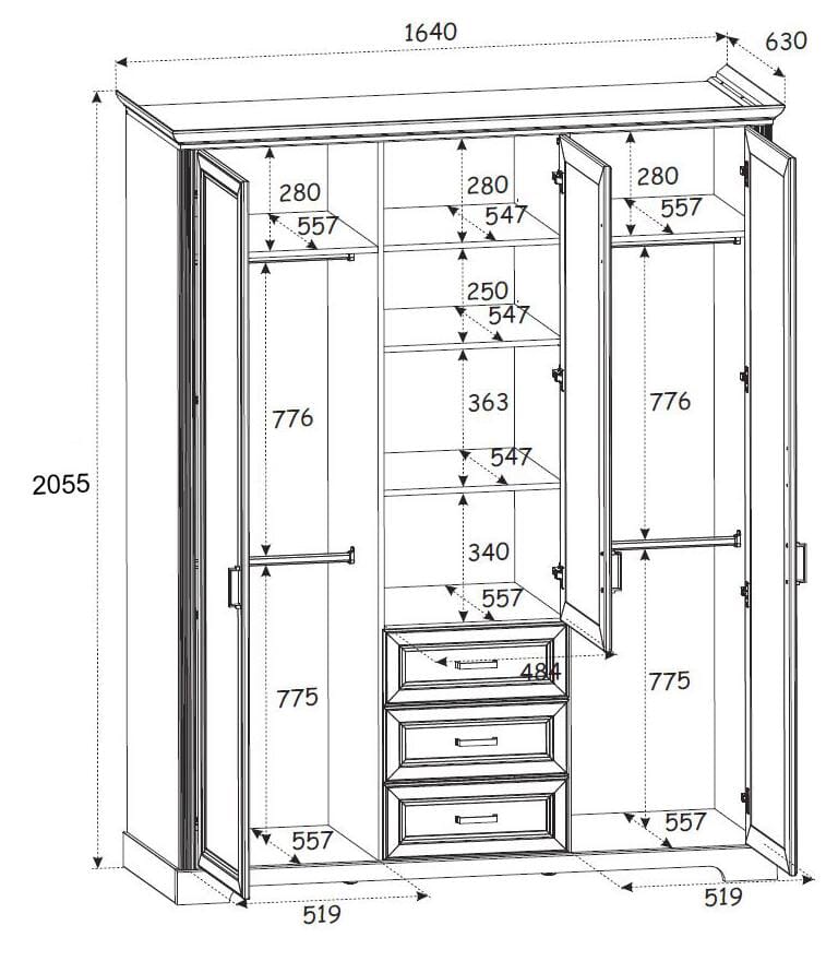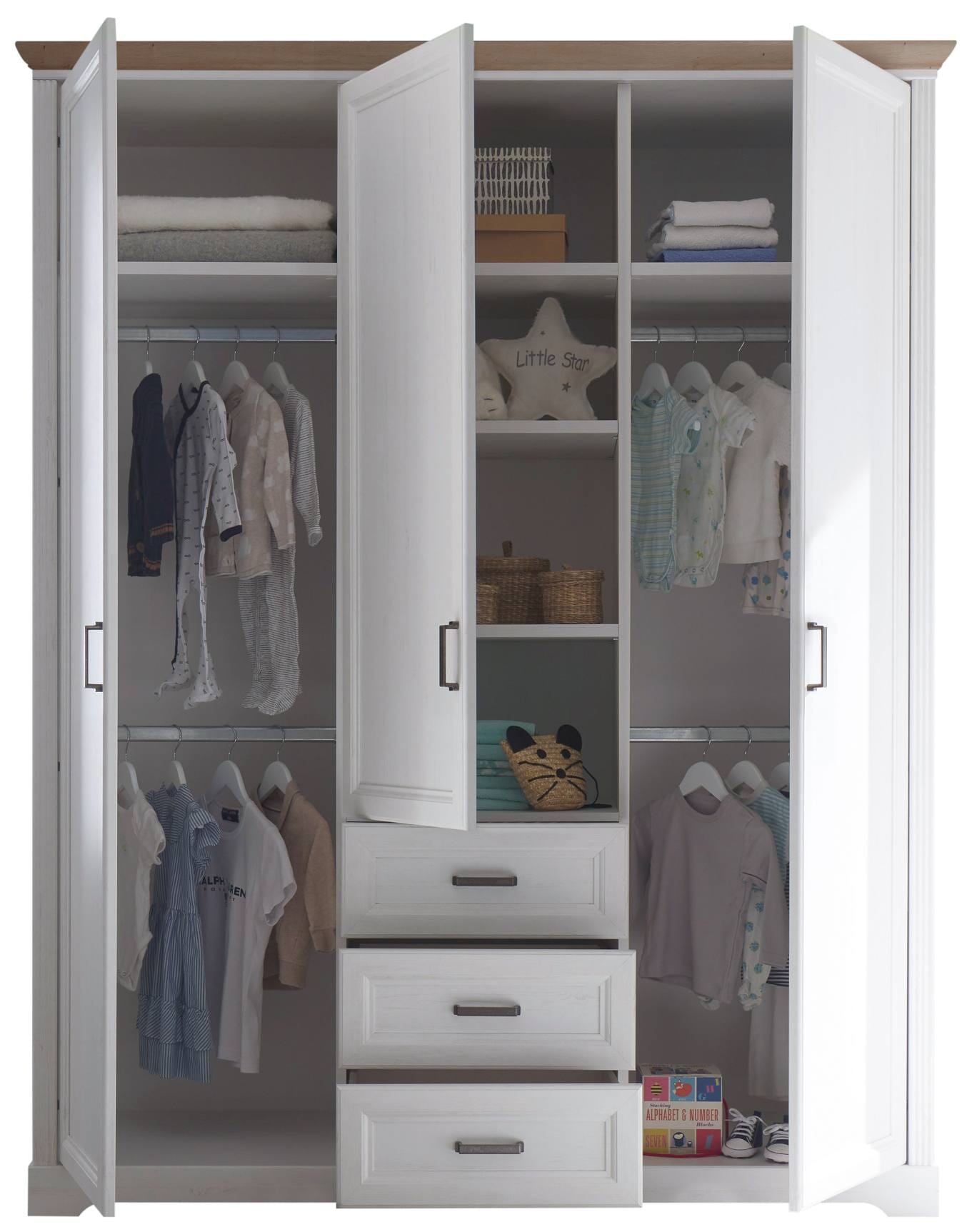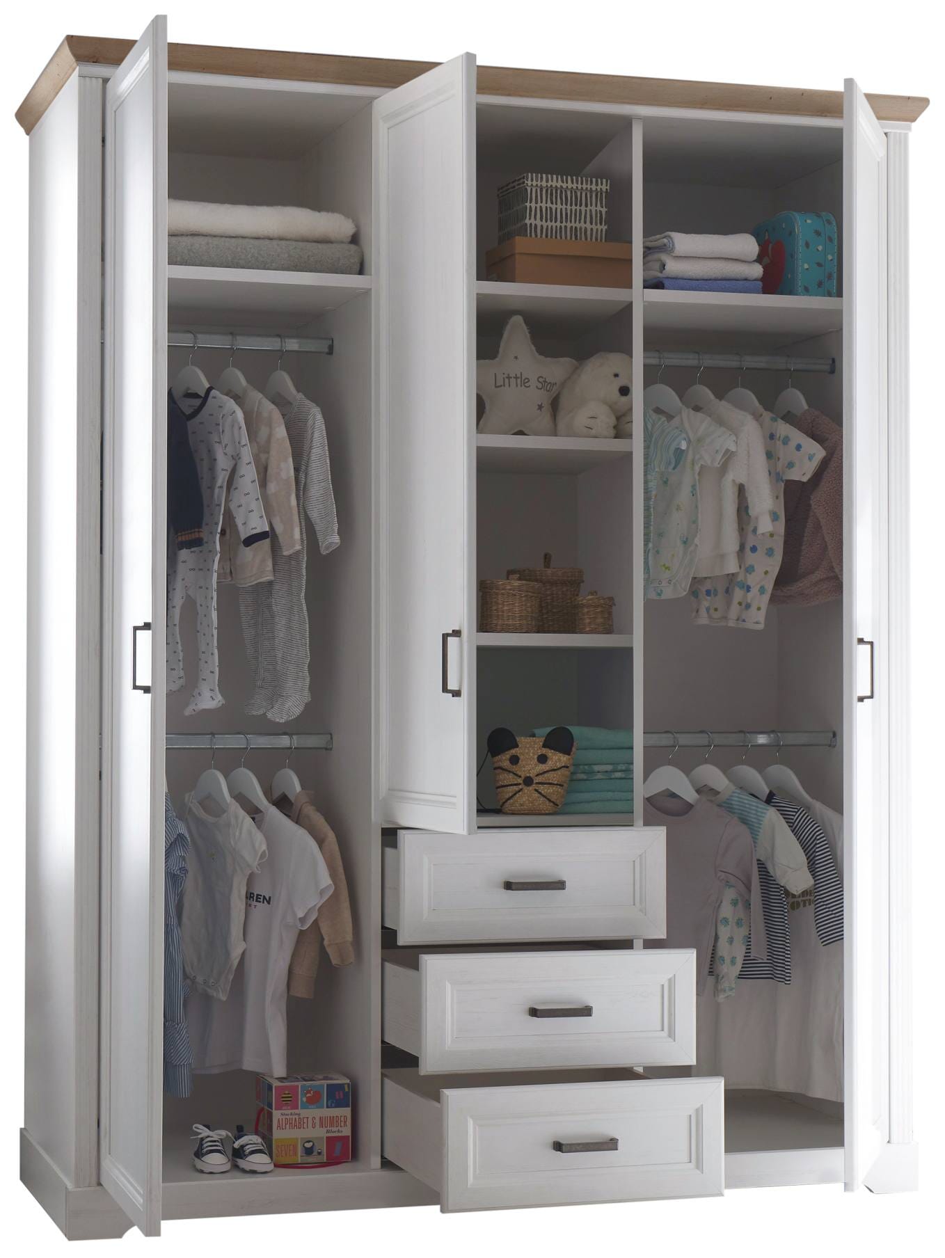 Für Ordnung sorgen kann das Modell aber auch. In seinem Inneren sind Fächer und Kleiderstangen satt vorhanden, die sich von allein füllen werden. Und die drei Schubladen werden Sie sicherlich auch gleich verplant haben.