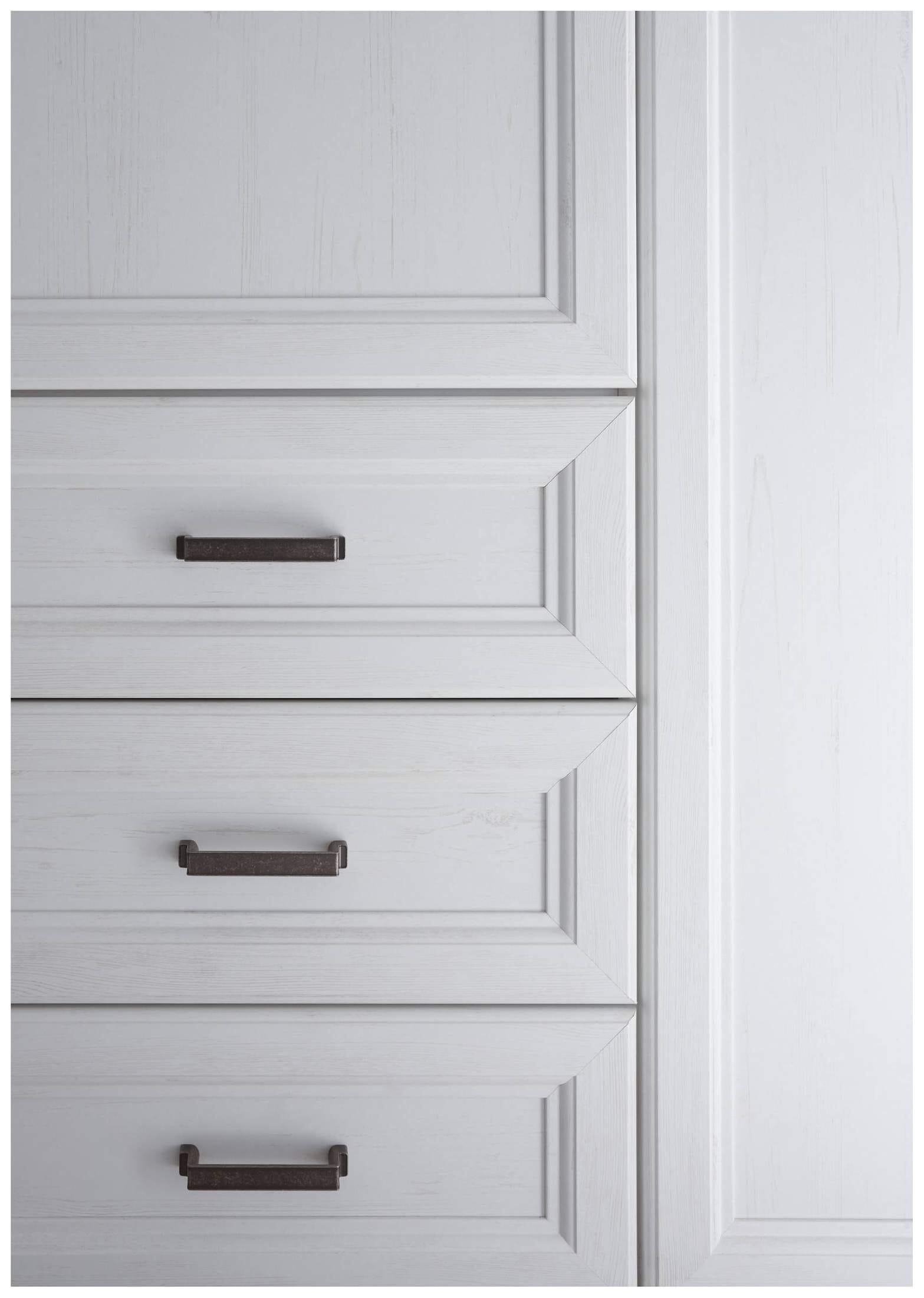 Der Kleiderschrank Schlafzimmerschrank JASMIN ist eine Art wahr gewordener Traum in Weiß, der auch ansonsten hartgesottenen Menschen dieses Lächeln auf die Lippen spielt. Alles an diesem Schrank ist gefällig. Dazu trägt auch das farblich abgesetzte Kranzprofil bei. Selbst die Griffe haben Charme. Denken Sie sich schon einen schönen Platz aus für dieses Wundermöbel im Landhausstil.