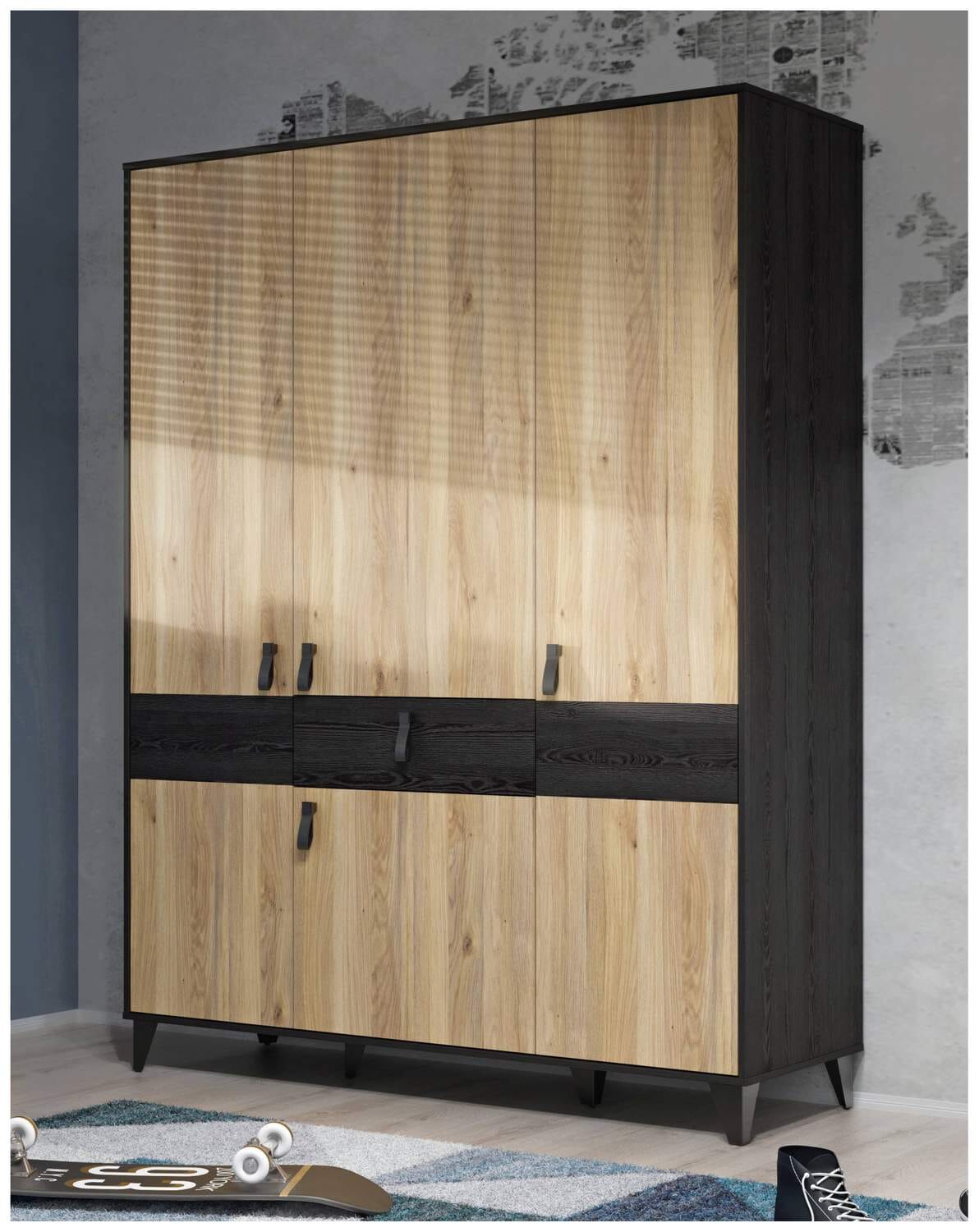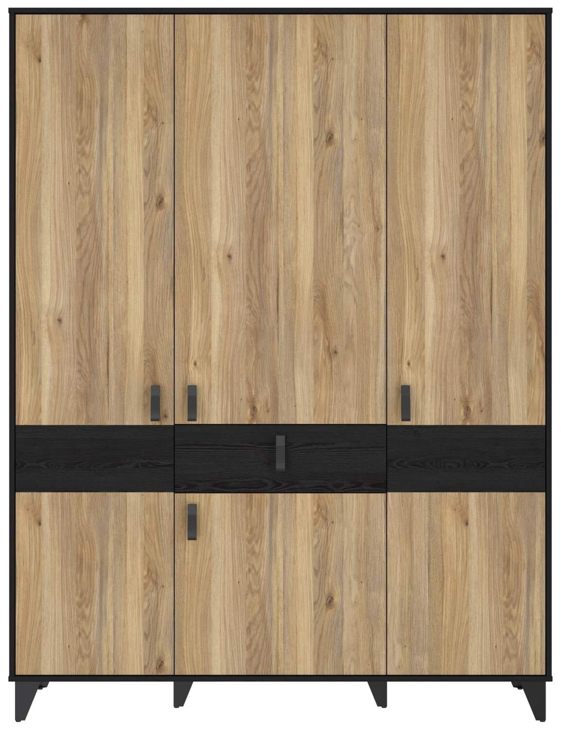 Robust ist dieser Schrank natürlich auch, wenn schon denn schon. Beschichtete Spanplatte , helle Mauvella Eiche in Kombination mit der schwarzen Cabezone Eiche Nachbildung, sind das typische der Kollektion LYA. Metallbeine und Kunststoffgriffe runden das Äussere ab.