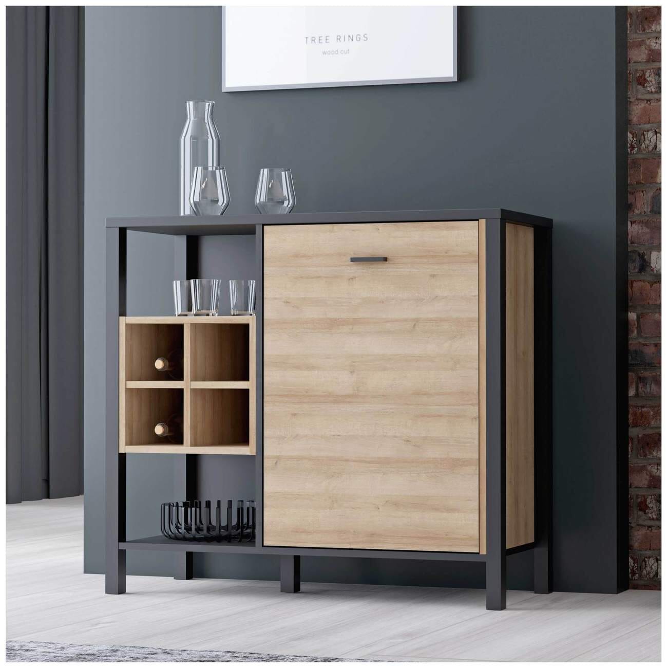 Die Kombination von hell und dunkel, offen und geschlossen ergibt ein harmonisches Gesamtbild. Rahmen, Füße, Ober- und Rückseite sind in tiefem Schwarz gehalten, während Tür, Seiten und ein Teil des offenen Fachs in edler Riviera-Eiche erstrahlen. Der fast industrielle Look der HighRock findet vor allem bei Puristen und Fans moderner, geradliniger Designs Anklang.