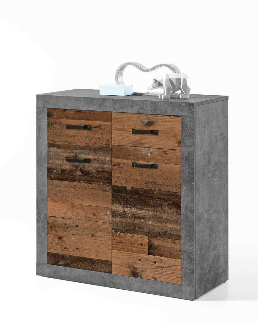 Hinter der Doppeltür und in den zwei Schubladen haben Sie dann Ihre kleinen Geheimnisse. Hüten Sie sie gut. Als Rahmen kommen Old Wood Vintage und eine schicke Betonoptik ins Spiel. So haben Sie was zu gucken und zu räumen. Dieses Prachstück kommt im Flur genau wie im Wohnzimmer gut zur Geltung.