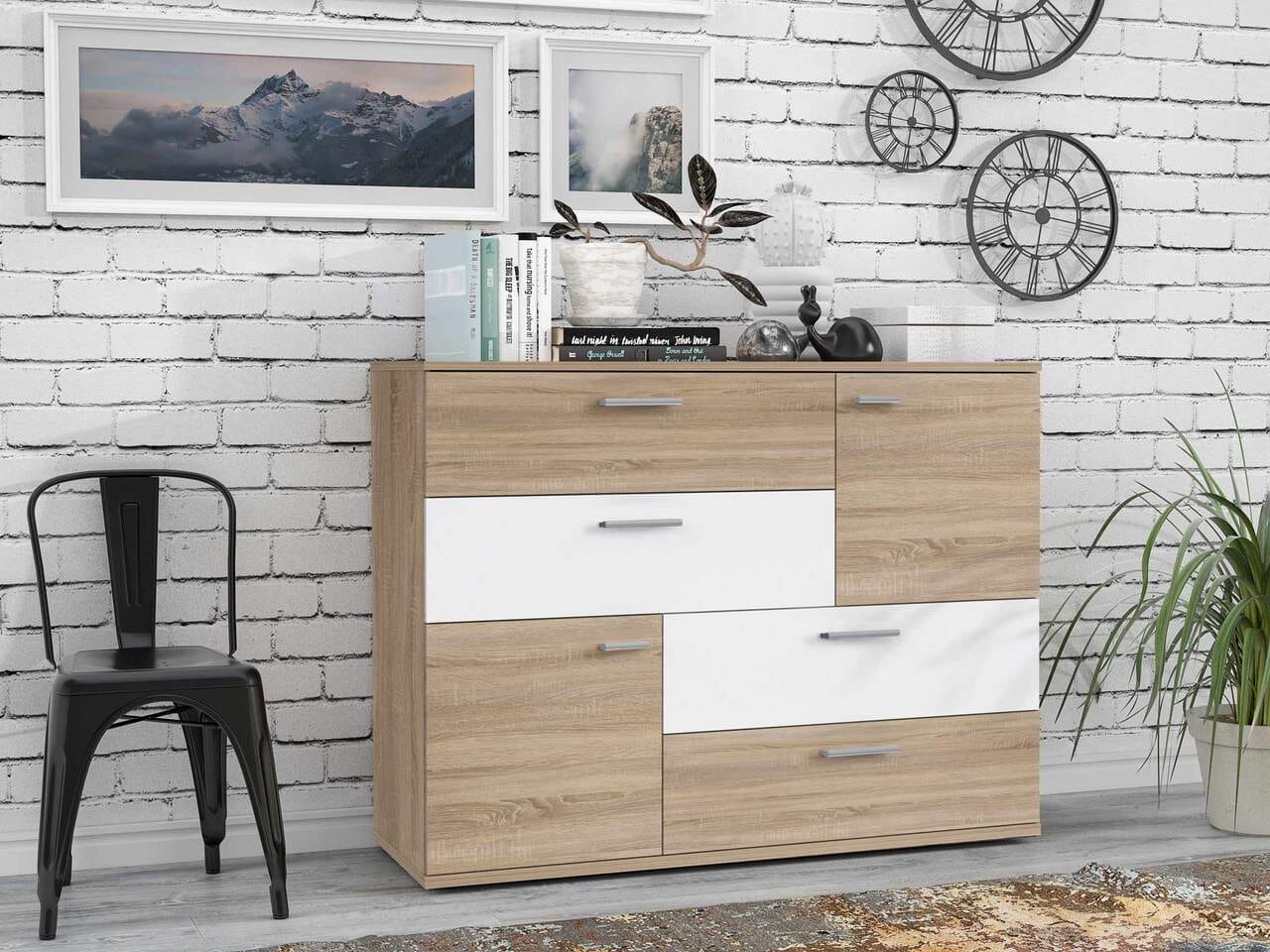 Kommode SKIVE, mit 2 Türen und 4 Schubladen, Optik: Sonoma Eiche / Weiß