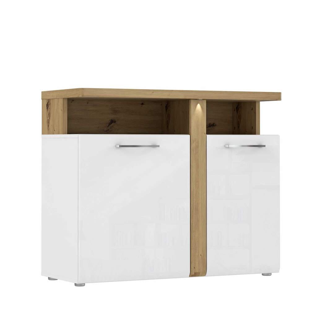 Glanz und Behaglichkeit bringt die Kommode TULUZA in Ihr Heim. Warme Holztöne der Artisan Eiche Nachbildung in Verbindung mit weißen Hochglanzfronten machen dieses Möbelstück zu einem dezenten Blickpunkt in Ihrem Wohnbereich. Chromfarbene Metallgriffe und Möbelfüße aus silbernem Kunststoff heben die schlichte und moderne Linie dieser Kommode noch einmal weiter hervor.