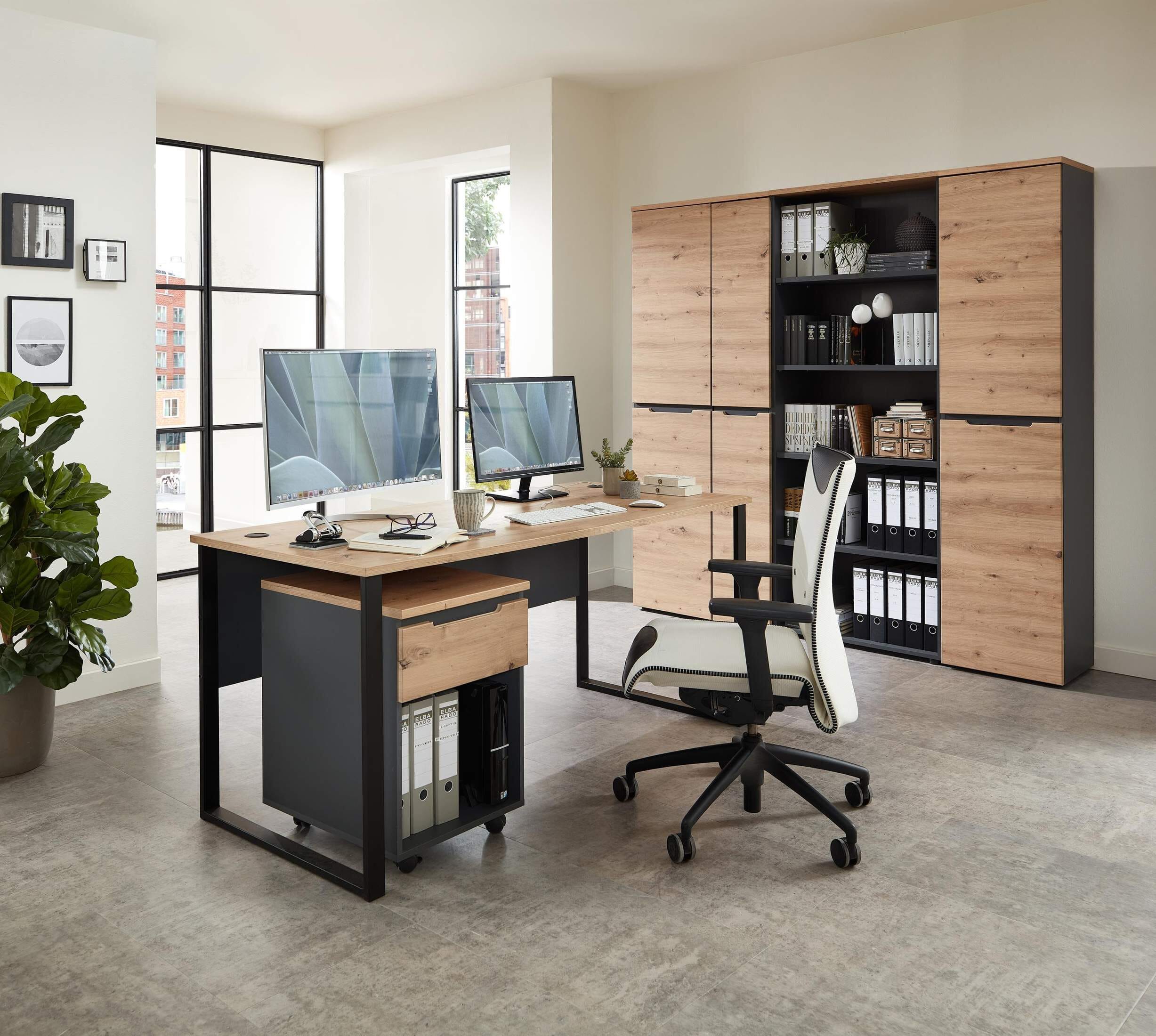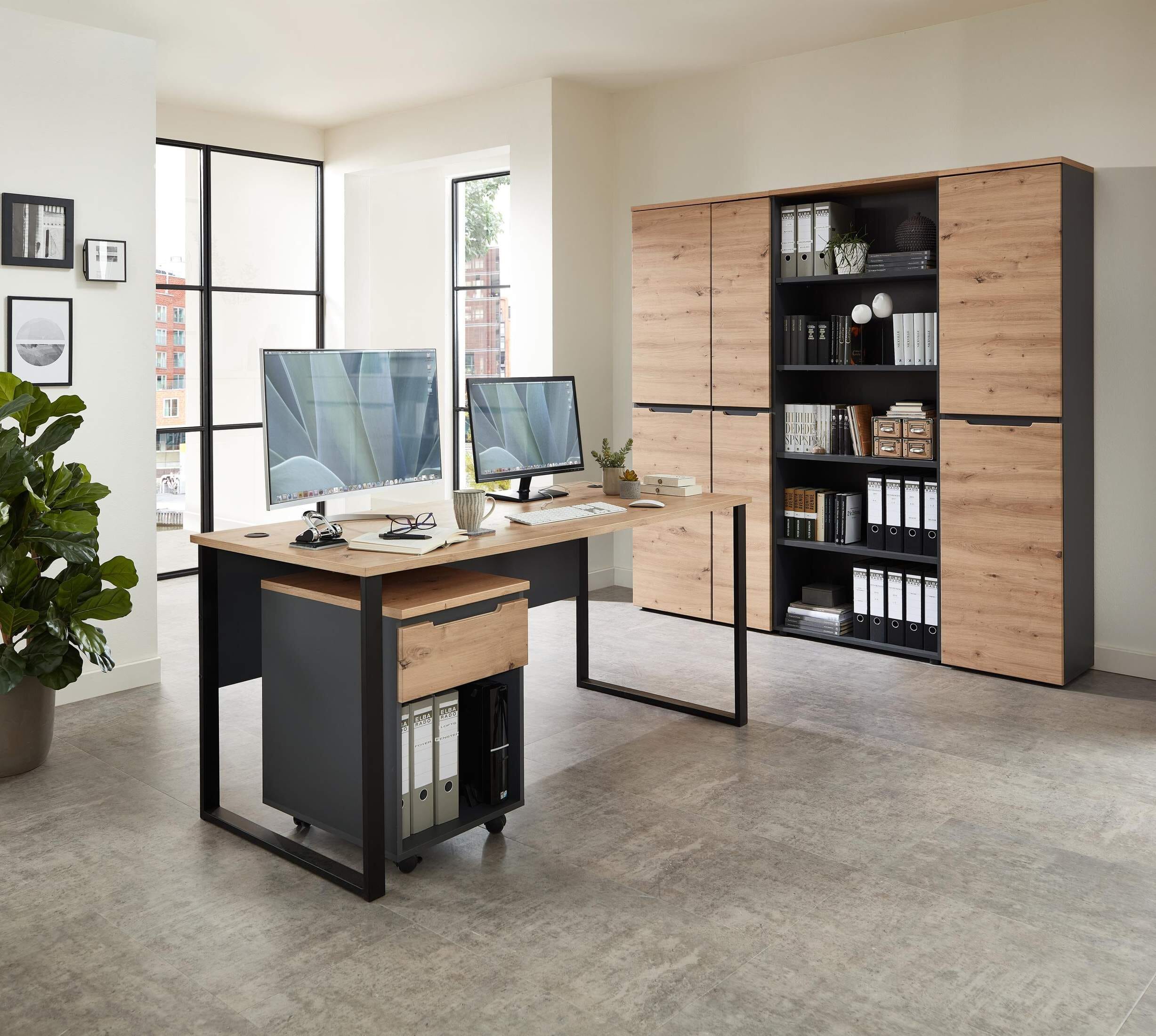 Das Büroset MEMPHIS mit Fronten in Artisan Eiche Nachbildung und Korpus in Graphit ist ein absolutes Highlight für Ihr Büro, die Farbgebung wirkt modern und natürlich zugleich.