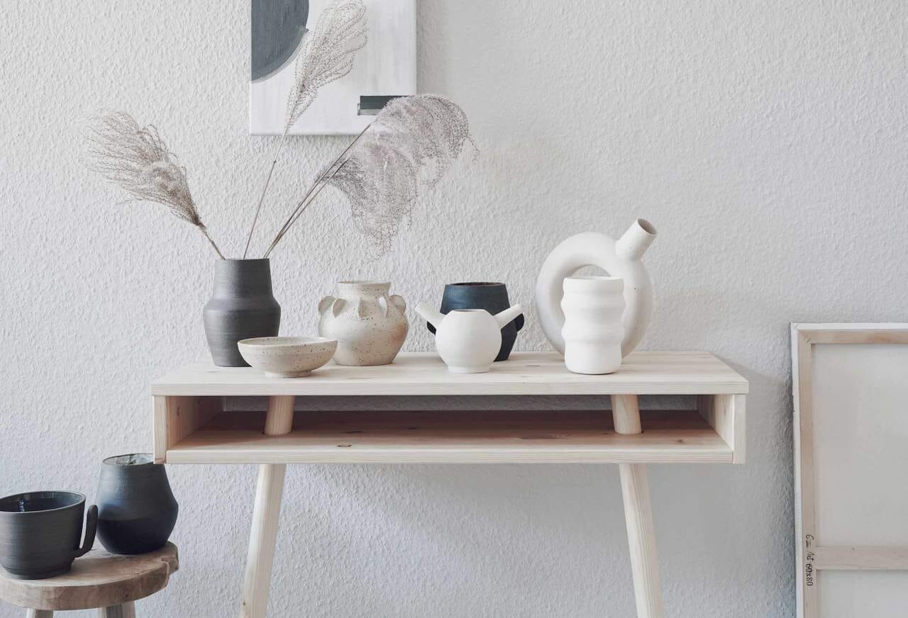 Das Material ist helles Kiefernholz, das lackiert wurde und so immun gegen Wasserflecken oder andere Unbilden ist. Das Holz hat dieses Frische, Skandinavische in der Anmutung, das die Laune hebt. Eins geht immer noch, denn dieses kleine Möbel nimmt kaum Platz ein, behauptet sich aber als optischer Knaller sehr gut.