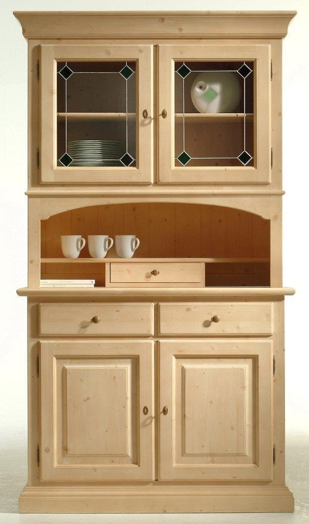 Das 2-teilige Buffet Brunico ist aus massiver Fichte gefertigt. Hinter den verglasten, verschließbaren Türen im Oberteil, befindet sich 1 Holz-Einlegeböden. Beide oberen Türen verfügen über eine wunderschöne Verglasung, mit sandgestrahltem dezentem Muster. Die offene Nische hat 1 kleinere Schublade. Im unteren Teil, des Buffets sind 2 Schubladen und 2 Türen mit gefräster Holzfüllung. Dahinter findet sich 1 Fachboden. Alle Beschläge bestehen aus antik gearbeiteten Messing. Beide Schubladen sind klassisch geführt, OHNE Metall-Auszug.