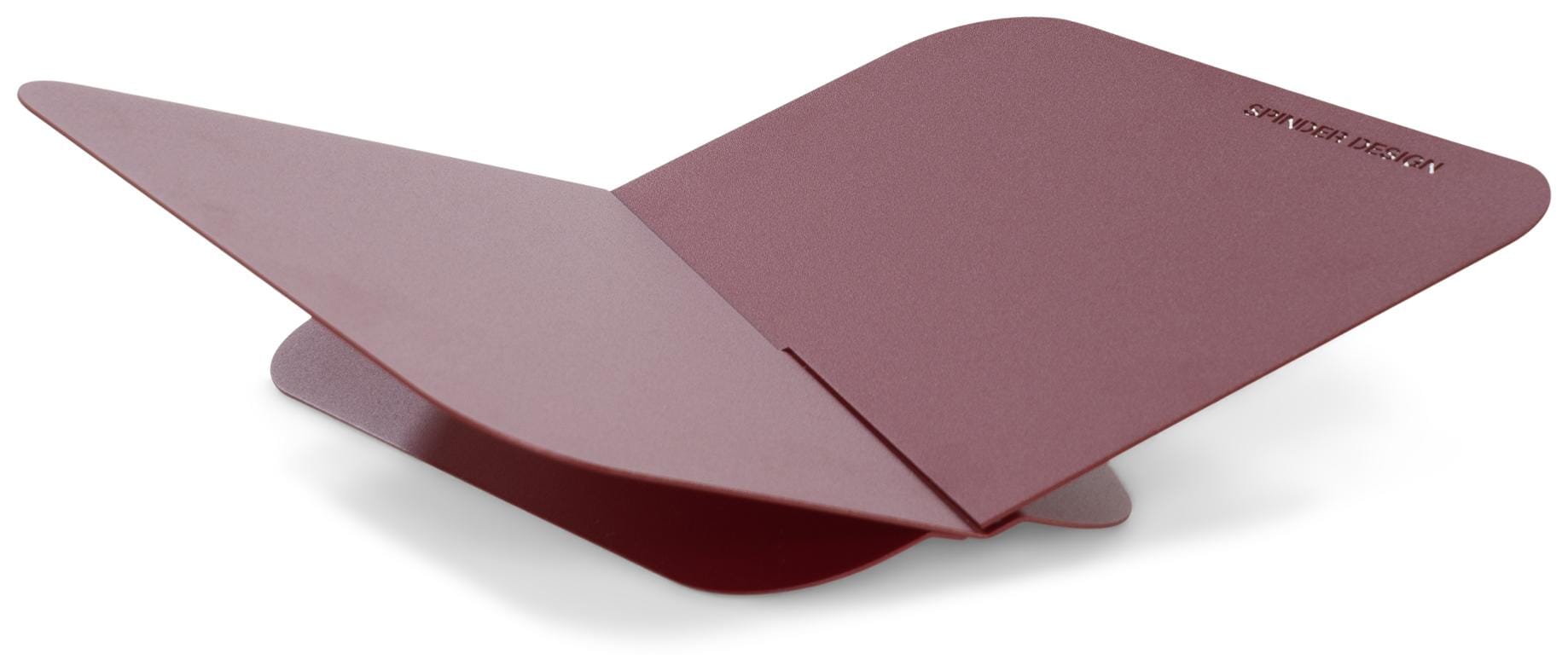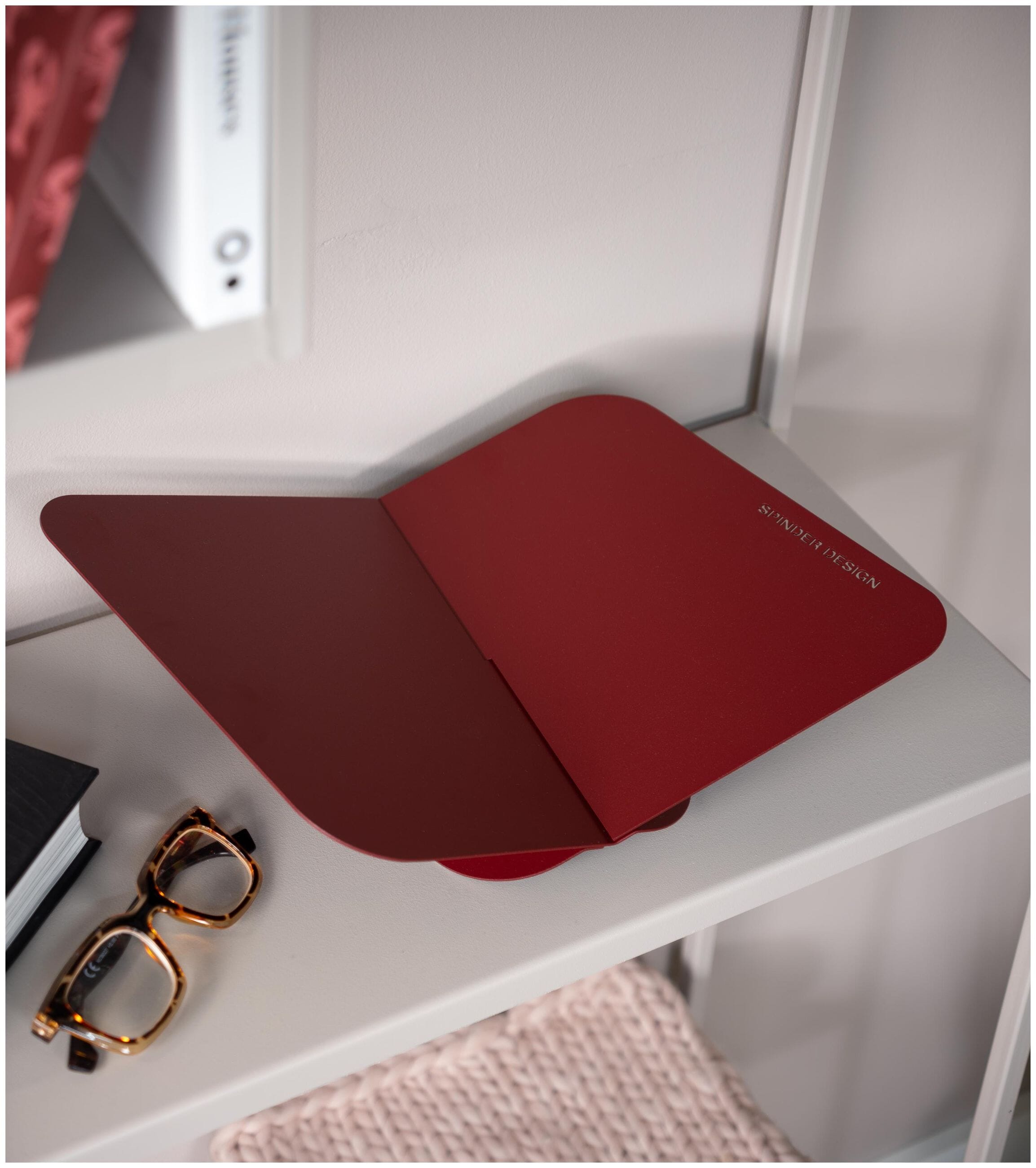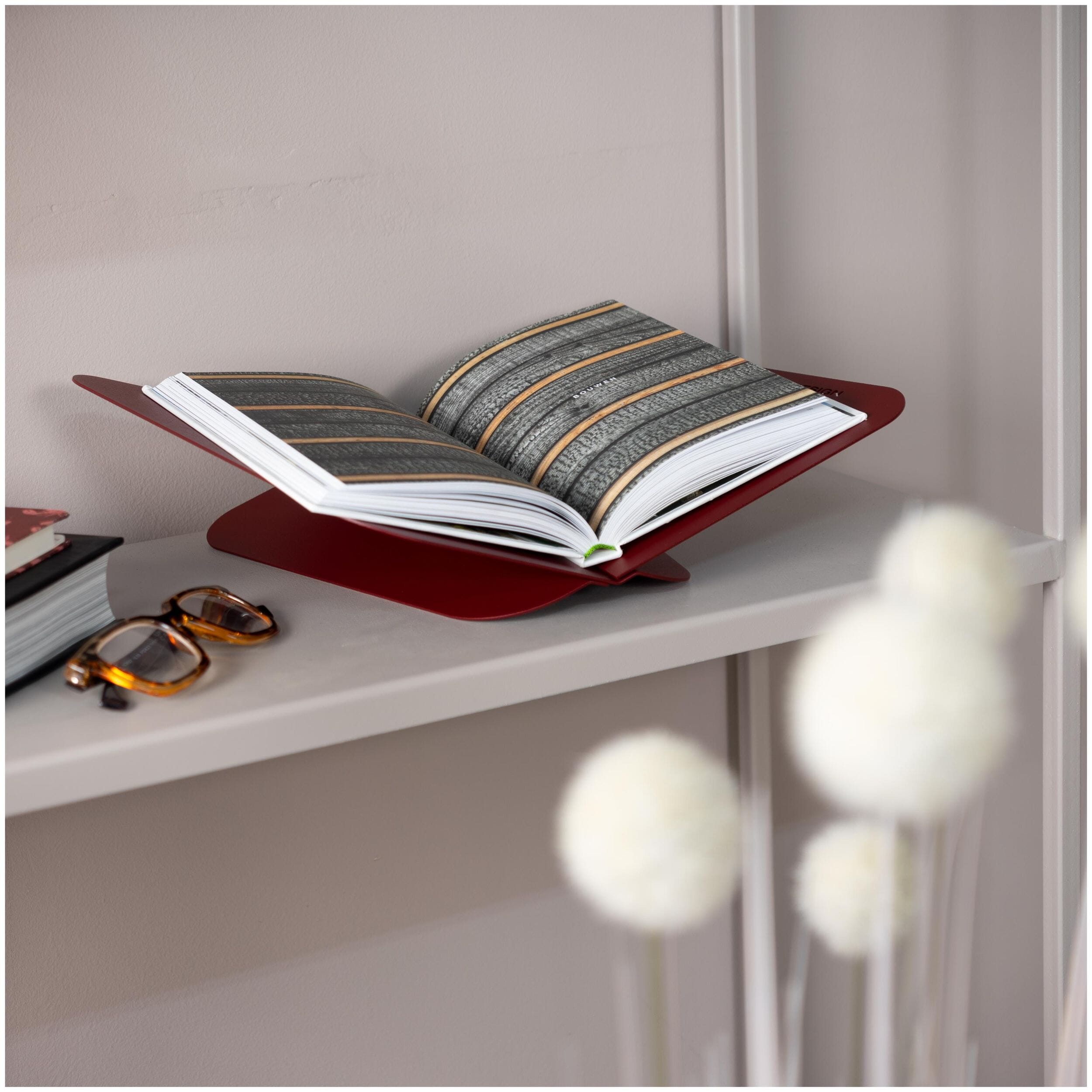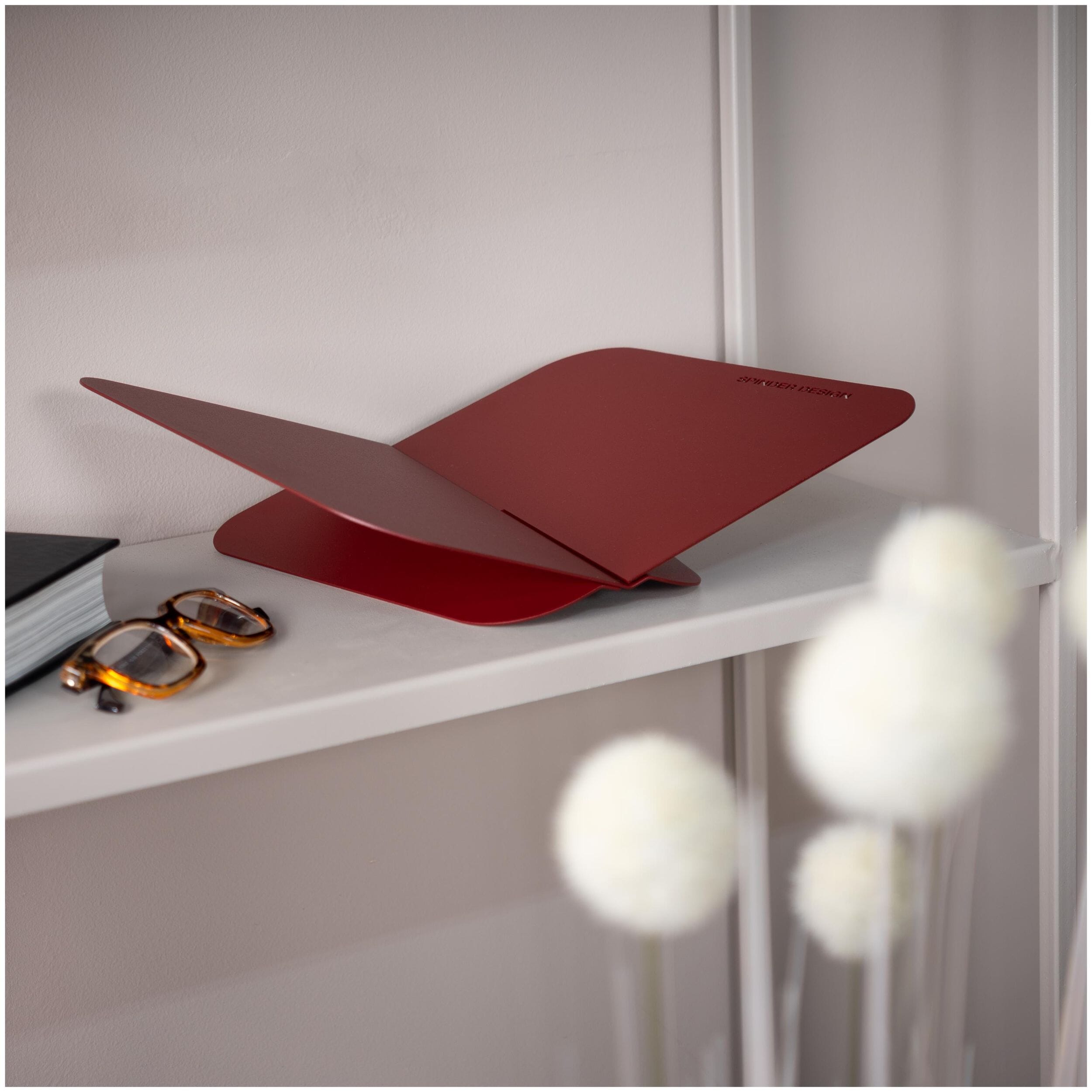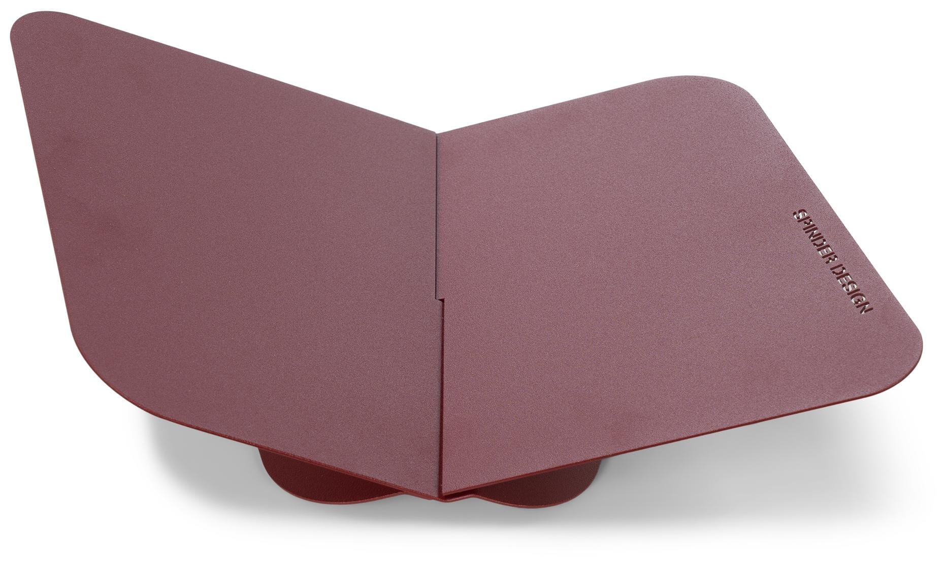 Entdecken Sie den eleganten ATALANTA Buchständer von Spinder Design in der stilvollen Farbe Burgundy. Perfekt, um Ihre schönsten Coffeetable-Bücher stilvoll zu präsentieren!
