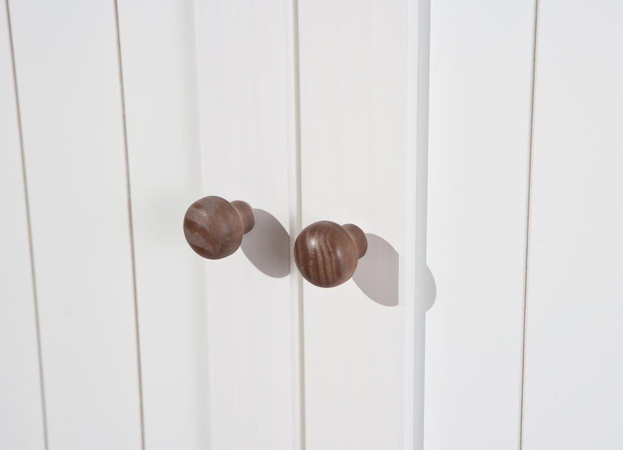 Die Oberfläche wurde so behandelt, dass Sie sich um nichts kümmern müssen, denn sie ist wasserabweisend und damit auch pflegeleicht. Als hübsche Extras kommen die farblich abgesetzten Holzknöpfe sowie die Füllungen, die in einer das Äußere aufwertenden Brettoptik gehalten sind, hinzu. Dieses Möbel ist ein Stück Nostalgie mit allerhand praktischen Details.