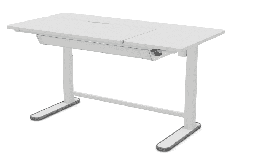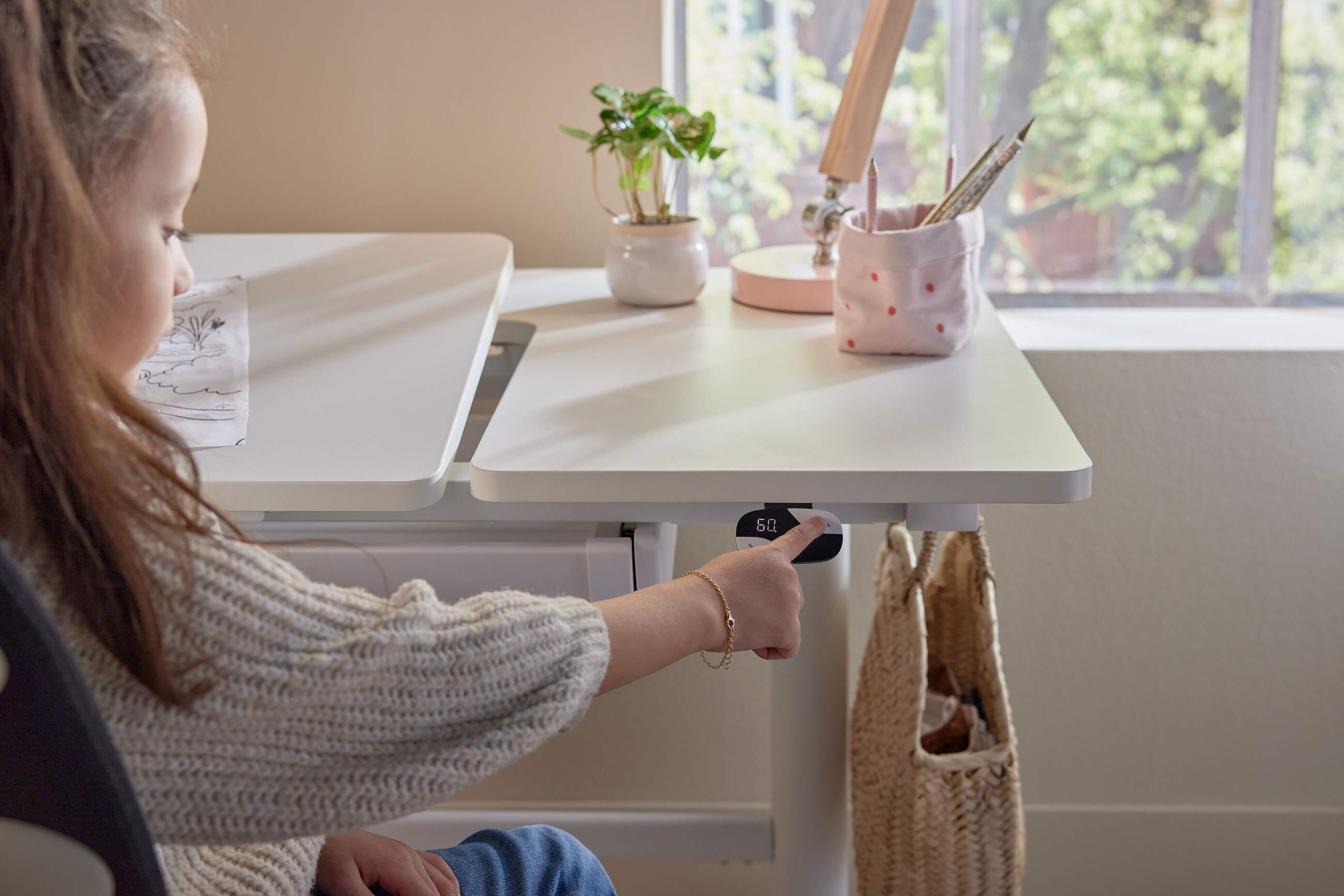 Der elektrisch verstellbare ERGO-Schreibtisch lässt sich mit dem linken Klappteil in der Höhe verstellen von 55 – 89 cm, über einen kleinen Knopf unterhalb der Tischplatte.