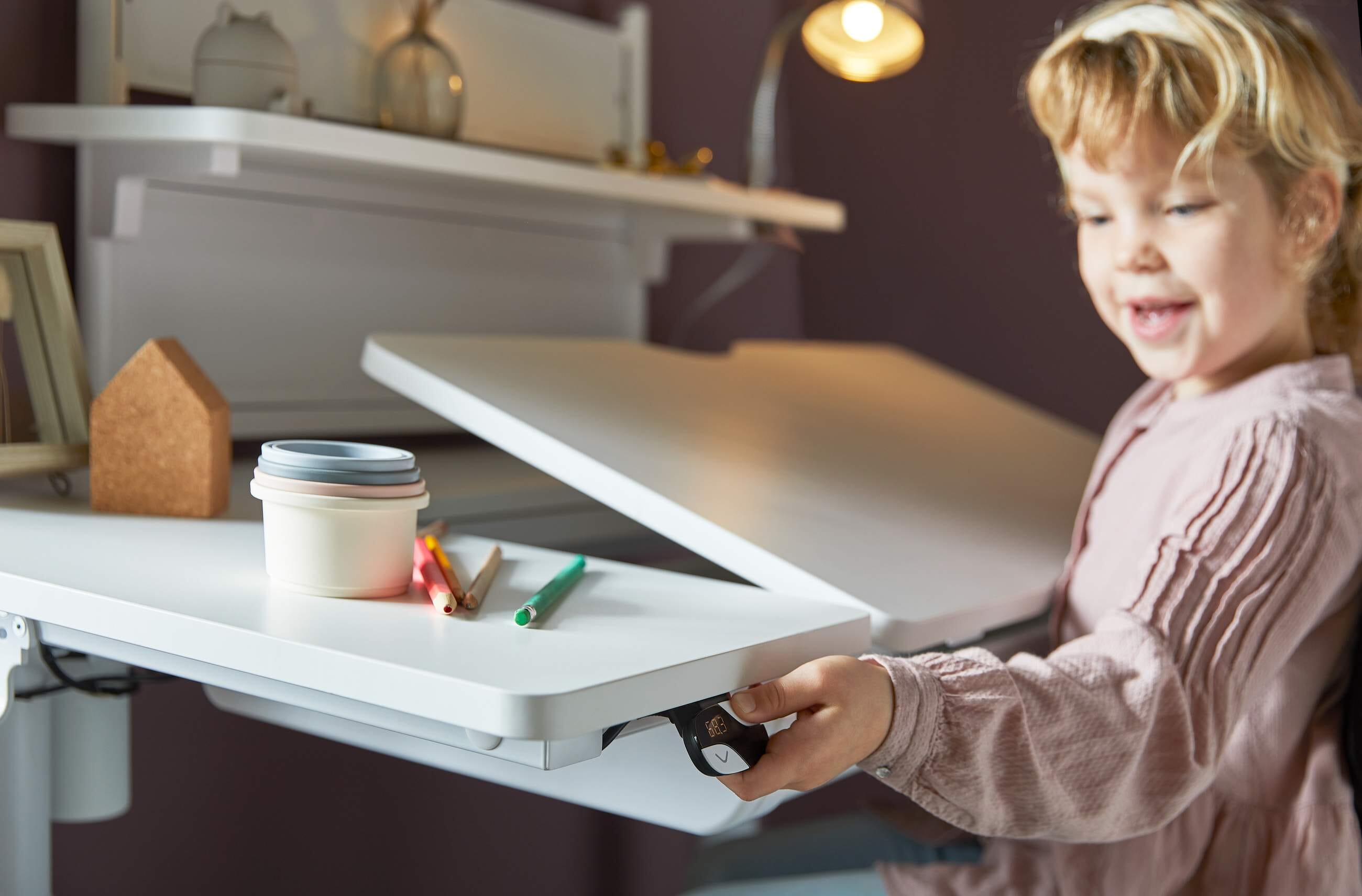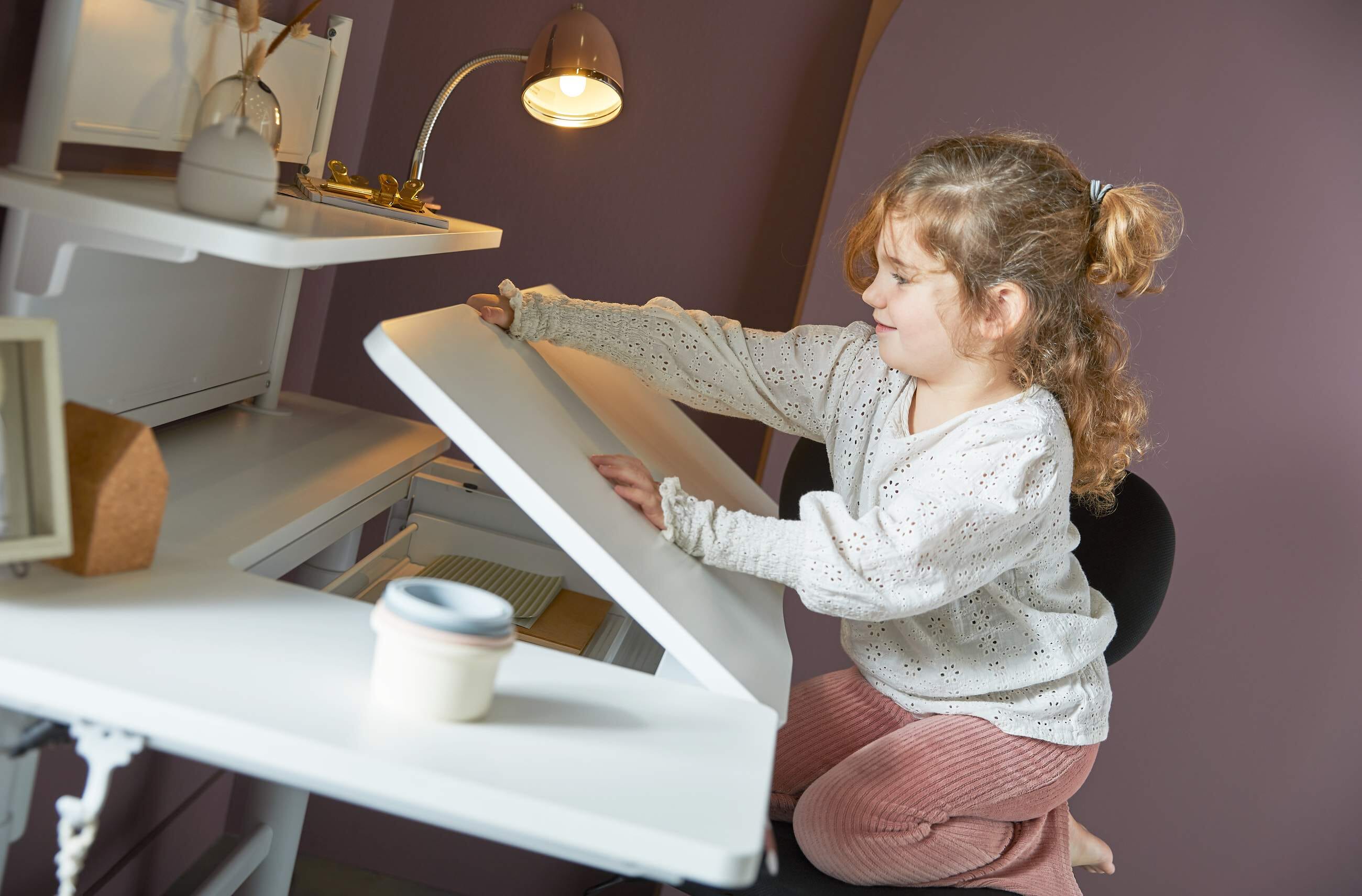 - Extra Sicherheit: Die neigbare Oberfläche hat nach innen einen zusätzlichen Sicherheitsabstand zu der feststehenden Schreibtischplatte, um das Einklemmen von Kinderhänden beim herablassen zu vermeiden.