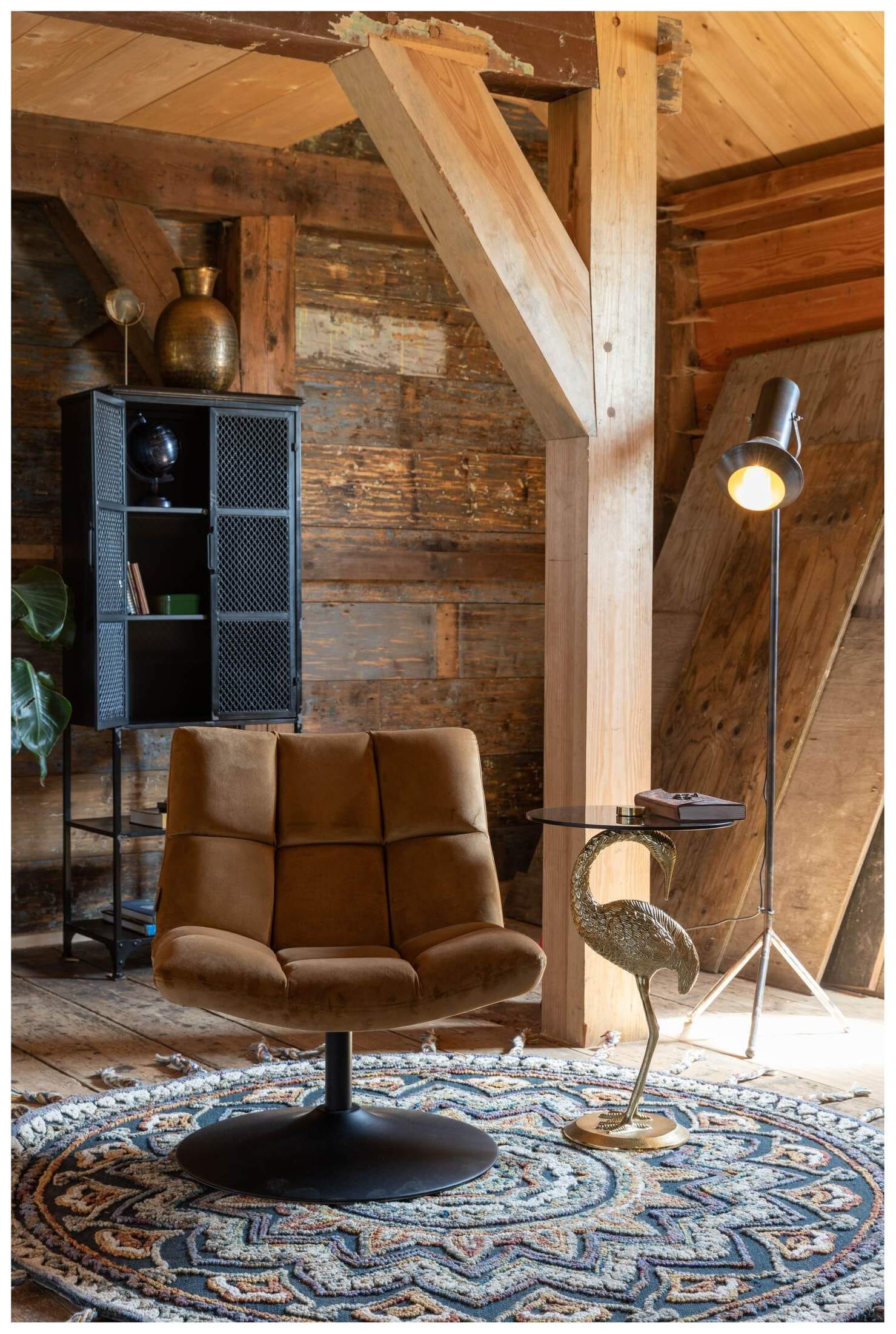 Goldener Samtstoff und ein schwarzer Stahlschwenkrahmen - diese beiden Komponenten ergeben einen Thron für chillige Menschen!