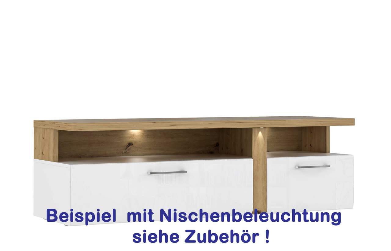 Das warme und helle Eichenholz strahlt Behaglichkeit aus und bildet gleichzeitig einen angenehmen Kontrast zur klaren Linie des schlichten Weiß. Ein in der Front eingelassener LED Mini-Spot macht dieses Lowboard zu einem besonderen Hingucker.