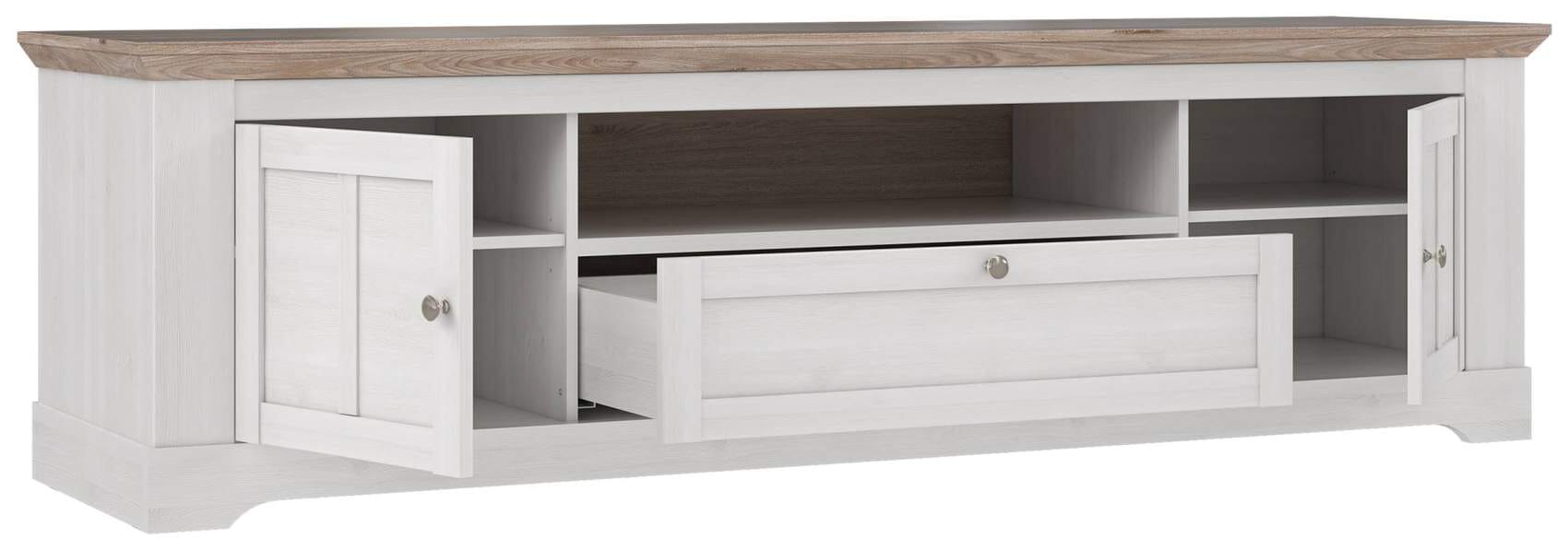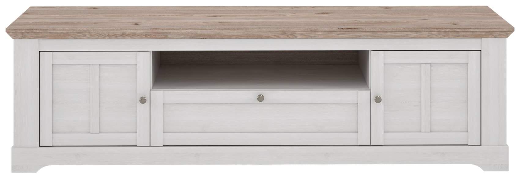 Das Lowboard zeigt sich in einem schönen Design. Die Fronten haben eine Schneeeiche Optik. Dazu passend ist die Oberplatte in Nelson Eiche gestaltet, sodass sich ein schöner Kontrast ergibt. Die brushed Nickel Metallgriffe runden den Gesamteindruck ab. Das schöne Möbelstück punkte also mit einer ansprechenden Optik und Stauraum.