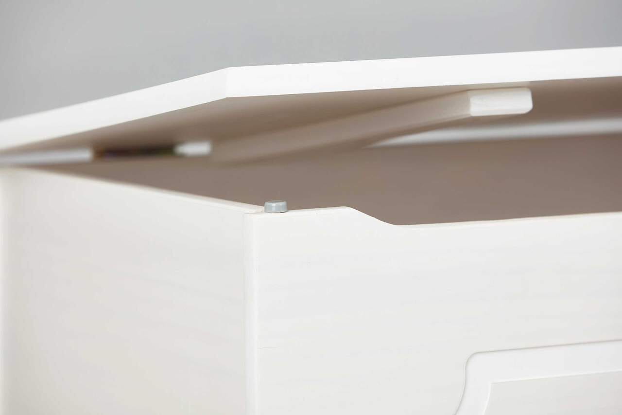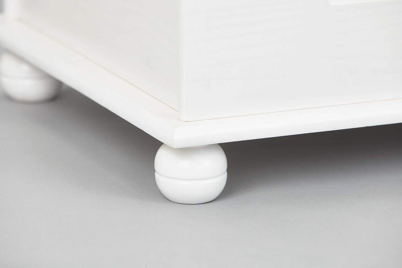 Sie klappen das gute Stück aus Kiefernholz dann einfach zu und haben Ihre Ruhe. Sie können diese Truhe in Weiß als Blickfang in den Windfang stellen oder als Highlight in Ihr Schlafzimmer. Sie macht sich überall super - denn Sie wissen, white rules okay! Und damit Sie auch wissen, was Sie unten noch erwartet: Es ist ein echtes Schmankerl, nämlich kleine hübsche Füße, die liebevoll gedrechselt wurden. Nostalgie - sie ist eben nie aus der Mode gekommen!