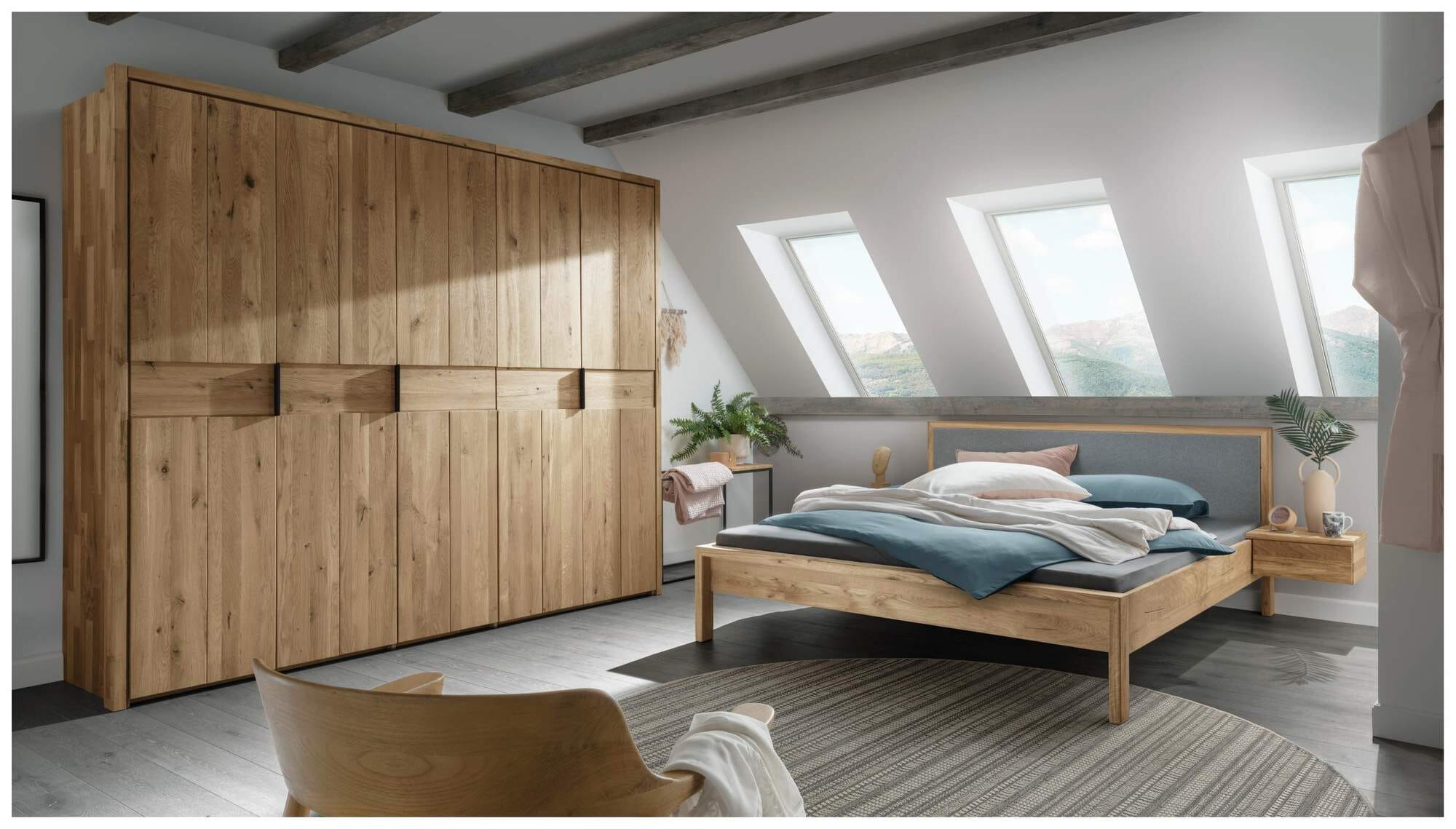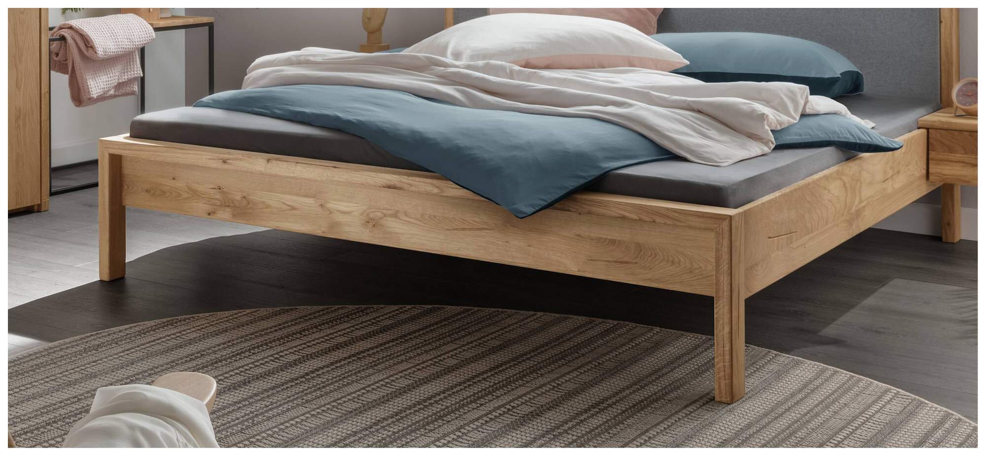 Massivholzbett AAGE 4 Wildeiche geölt Kopfteil mit Filzplatte grau