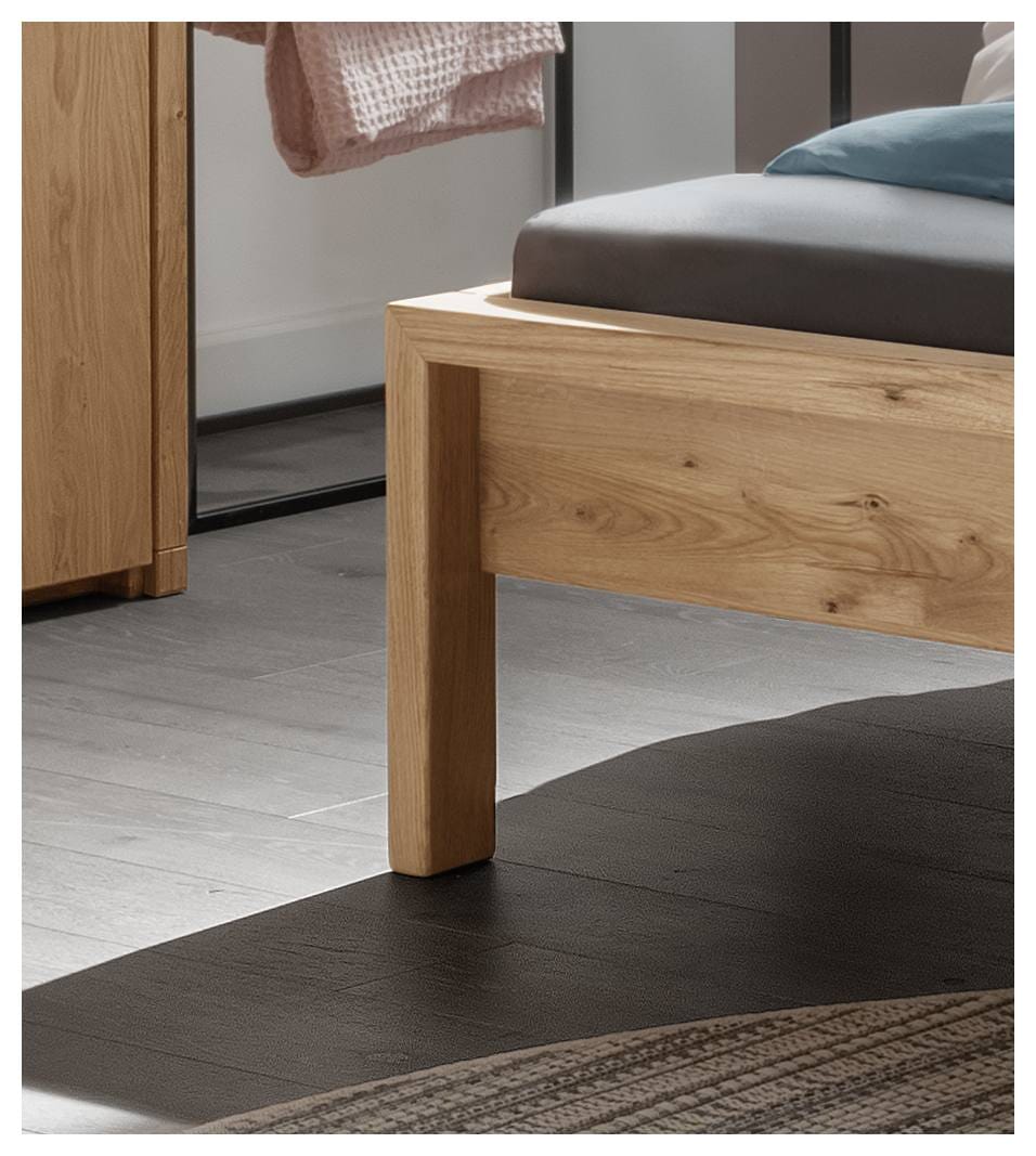 Mit dem Massivholzbett AAGE verwandeln Sie Ihr Schlafzimmer in einen Ort der Ruhe und Gemütlichkeit. Das besondere Naturmaterial Wildeiche verleiht dem Bett einen einzigartigen Charakter und eine unverwechselbare Maserung, die jeden Blickfang wert ist. Das graue Filzpolster im Kopfteil sorgt für zusätzlichen Komfort und eine harmonische Optik. Das niedrige Fußteil des Bettes gibt ihm eine moderne Note.