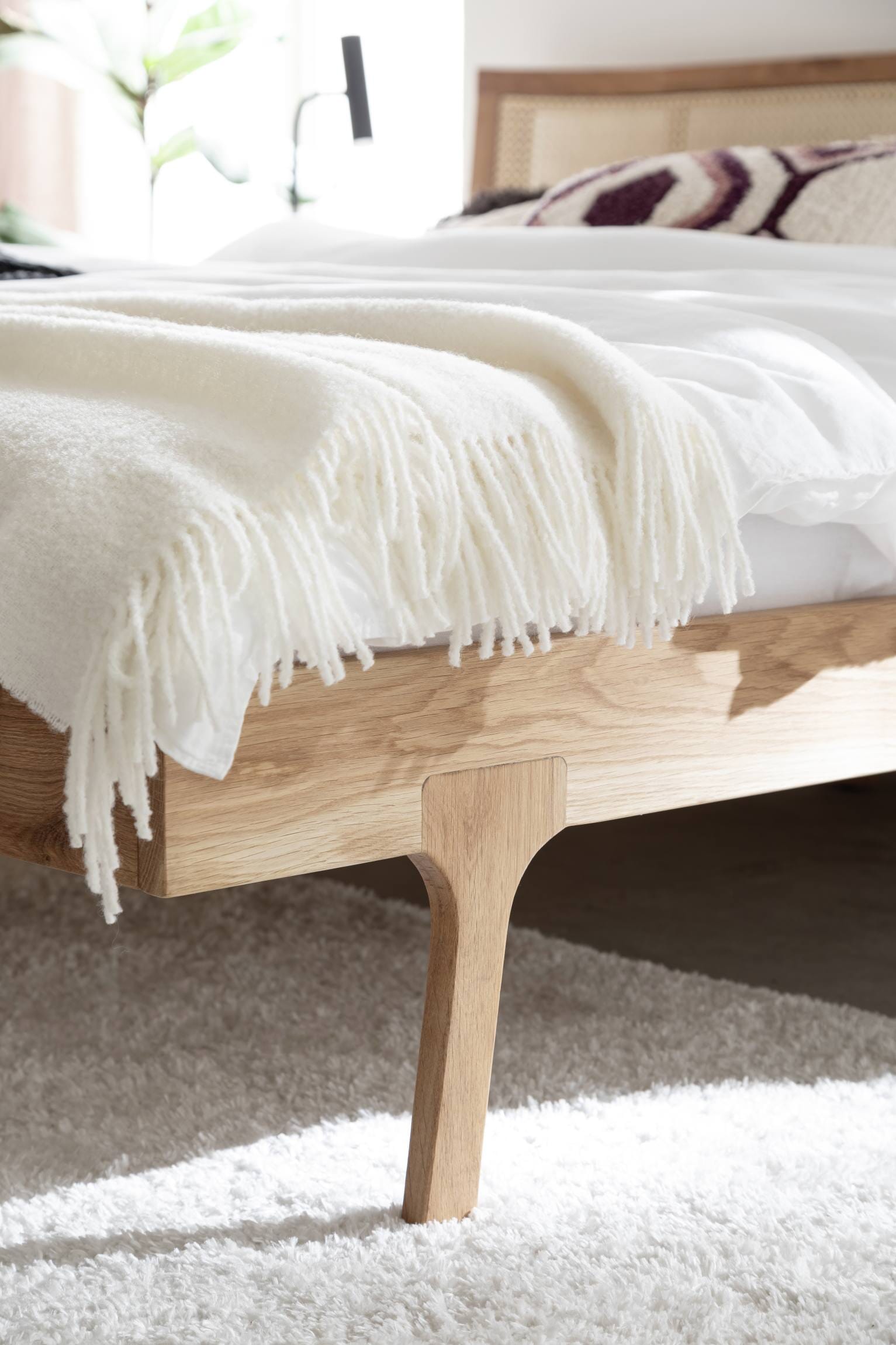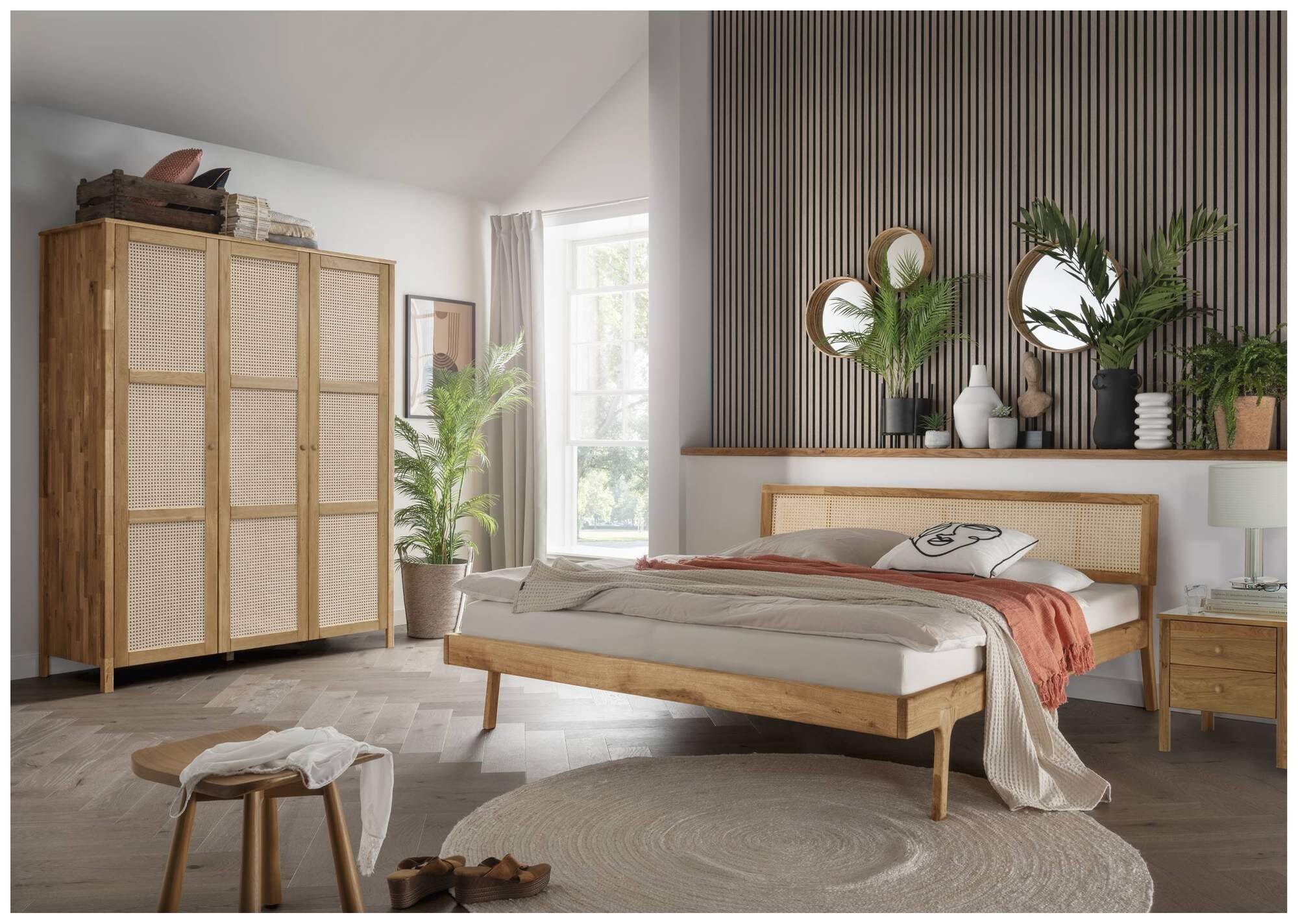 Im Massivholzbett FRIA schlafen Sie naturnah, denn es besteht aus massiver Wildeiche mit geölten Oberflächen. Sonst ist es eher von minimalistischem Charakter, zeigt jedoch mit dem Wiener Geflecht im Kopfteil eine weitere Besonderheit. Das detailreiche Flechtmuster im Vintage Stil rundet das Design des Doppelbettes perfekt ab, kommt sehr gut zur Geltung und verleiht ihm eine gewisse Leichtigkeit. Es erfüllt also auch dekorative Ansprüche, lässt sich gut mit Ihren vorhanden Möbeln kombinieren und mit farbiger Bettwäsche nach Ihren Wünschen gestalten.