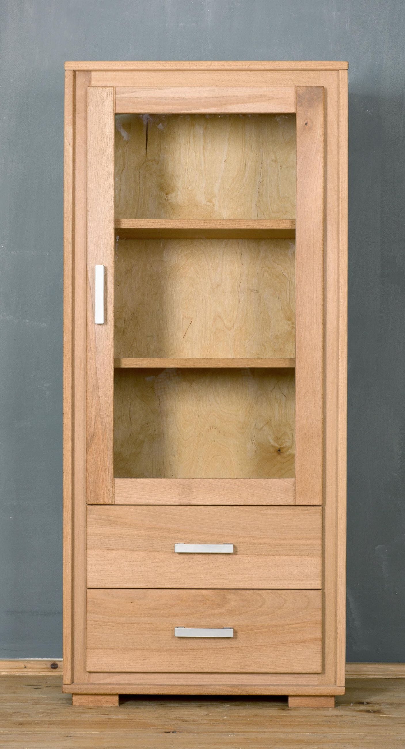 Die beiden Einlegeböden im Inneren lassen sich flexibel verstellen. Darunter befinden sich übereinander angeordnet zwei praktische Schubladen. Alle Fächer der Vitrine lassen sich mit edlen Metallgriffen öffnen und schließen. Dezente, niedrige Holzfüße runden die Optik passend ab. Der warme Holzton und die organische Oberflächenstruktur und Maserung der Kernbuche machen dieses Möbelstück zu etwas ganz Besonderem und verbreiten ein angenehmes Ambiente.