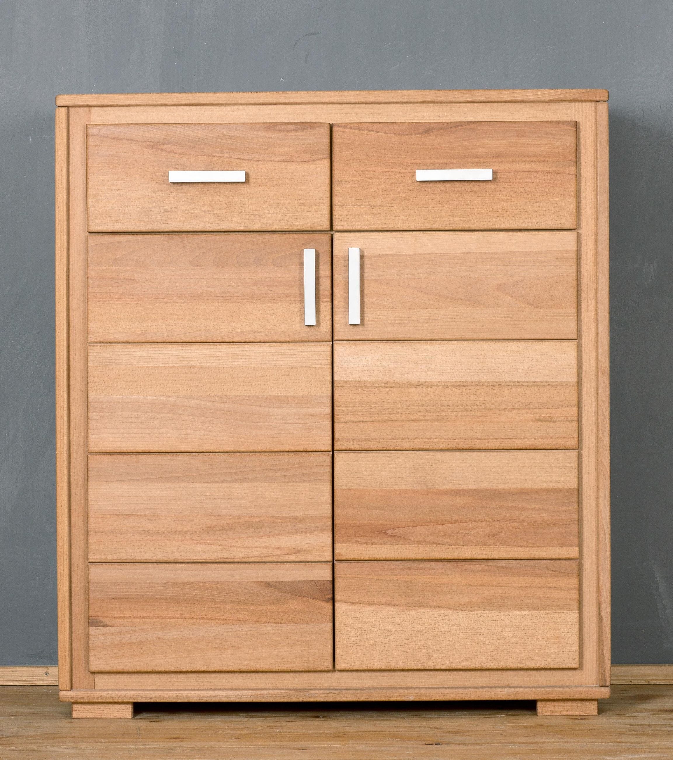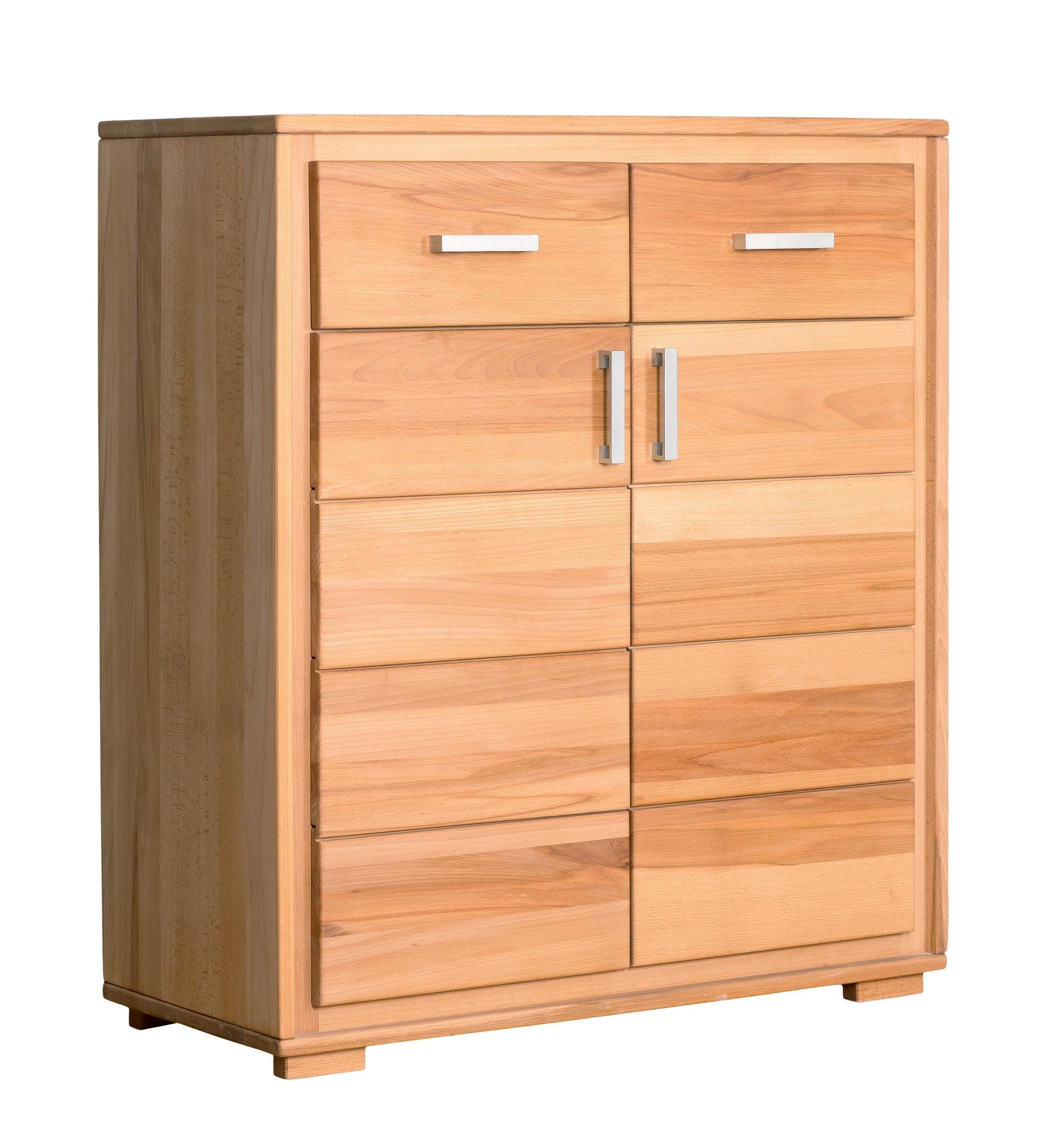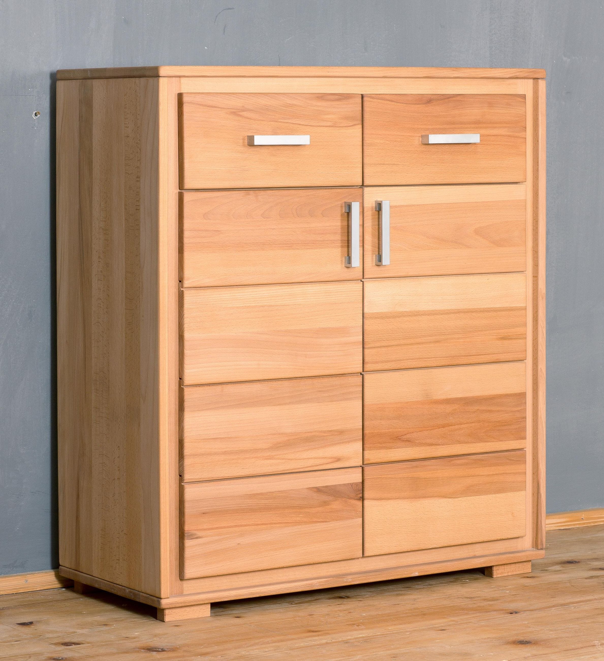 Eine raffinierte Optik in hochwertige Verarbeitung sind die Glanzpunkte der universell einsetzbaren Multi Kommode Genf aus massiver Kernbuche.