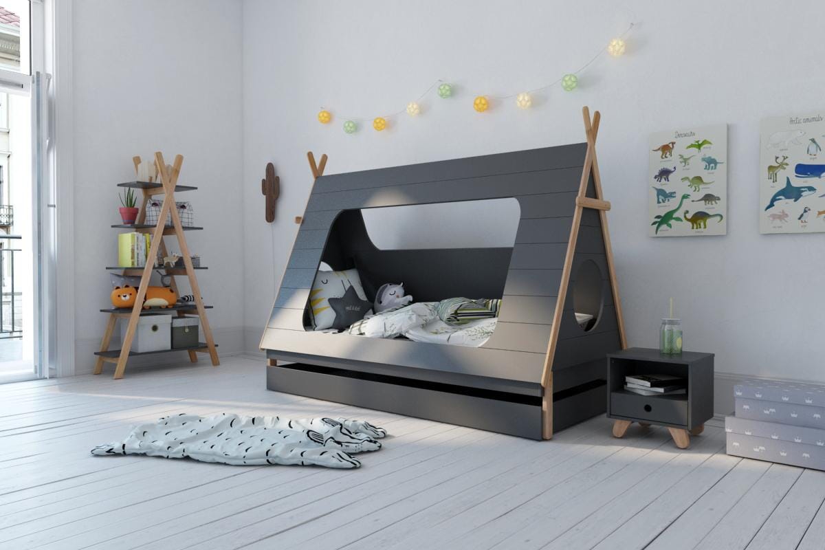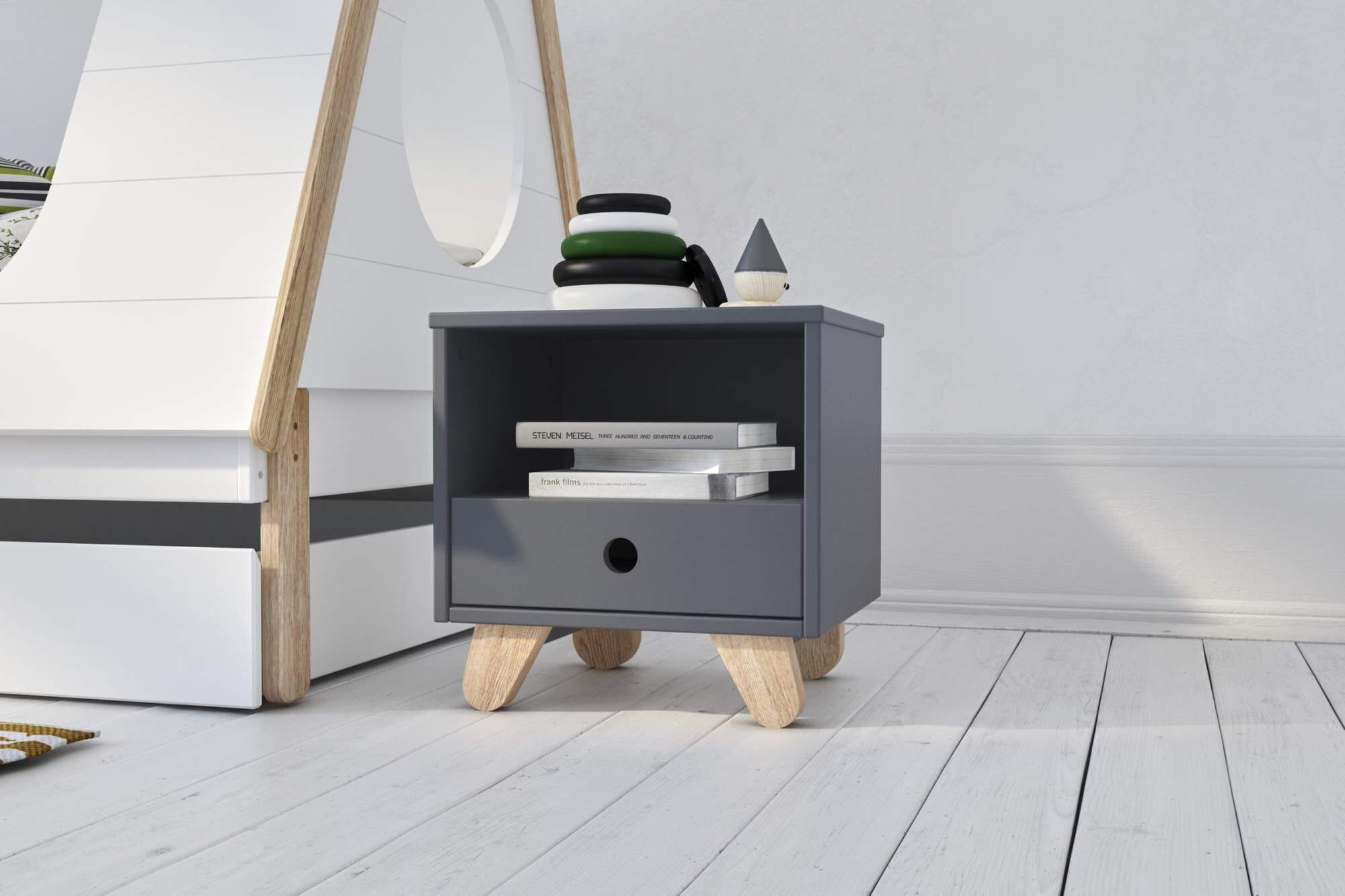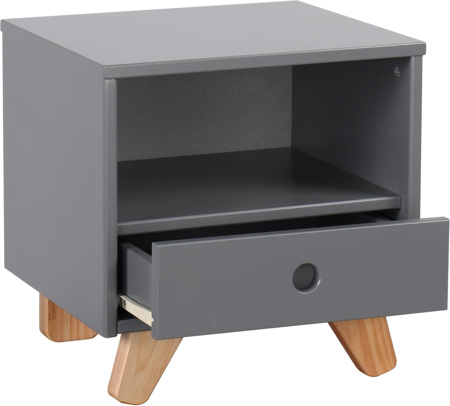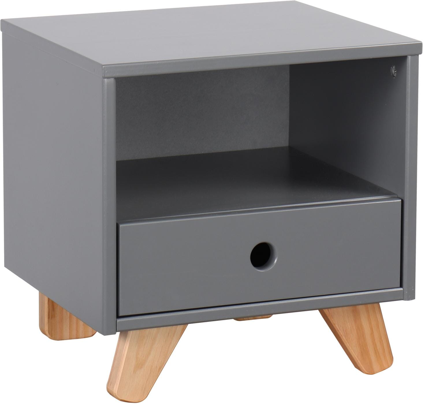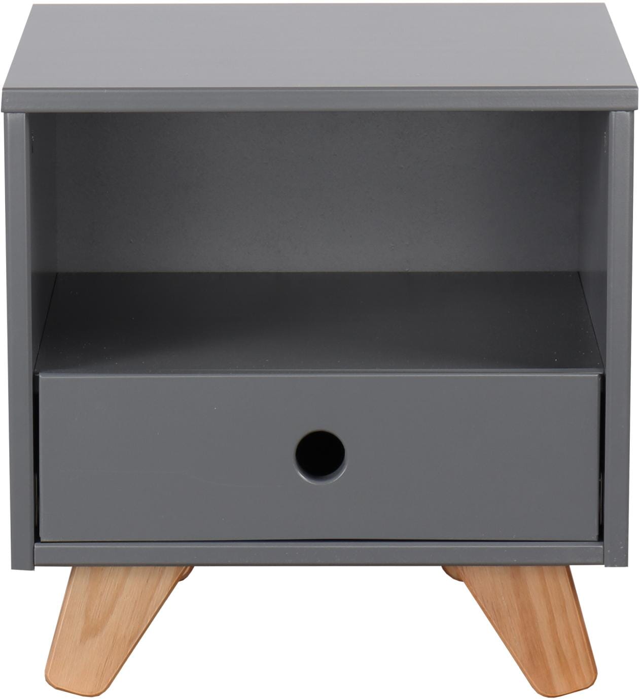 Die nordisch-moderne Farbkombination von grau lackiertem Korpus und naturbelassenem Holz machen die Nachtkommode zum Hingucker. Die Schlichtheit wird durch die grifflose Optik mit Grifflöchern noch zusätzlich unterstrichen.