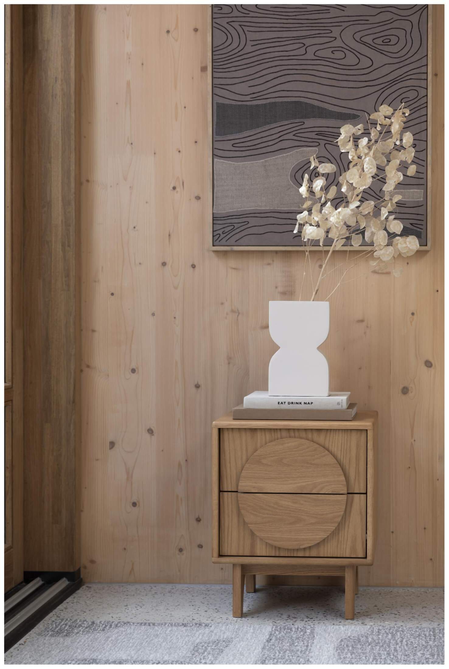 Mit der Nachtkommode GROOVE erhalten Sie einen zeitlosen Klassiker, der sich perfekt in jedes moderne oder traditionelle Interieur einfügt. Der MDF-Rahmen mit Eichenfurnier und die Beine aus massiver US-Eiche sorgen für ein robustes und langlebiges Design. Darüber hinaus sorgt die natürliche Nitrozellulose-Lackierung für einen warmen und natürlichen Look. Mit zwei Schubladen bietet die Kommode GROOVE eine praktische und schicke Lösung, um Ihre Accessoires zu verstauen.