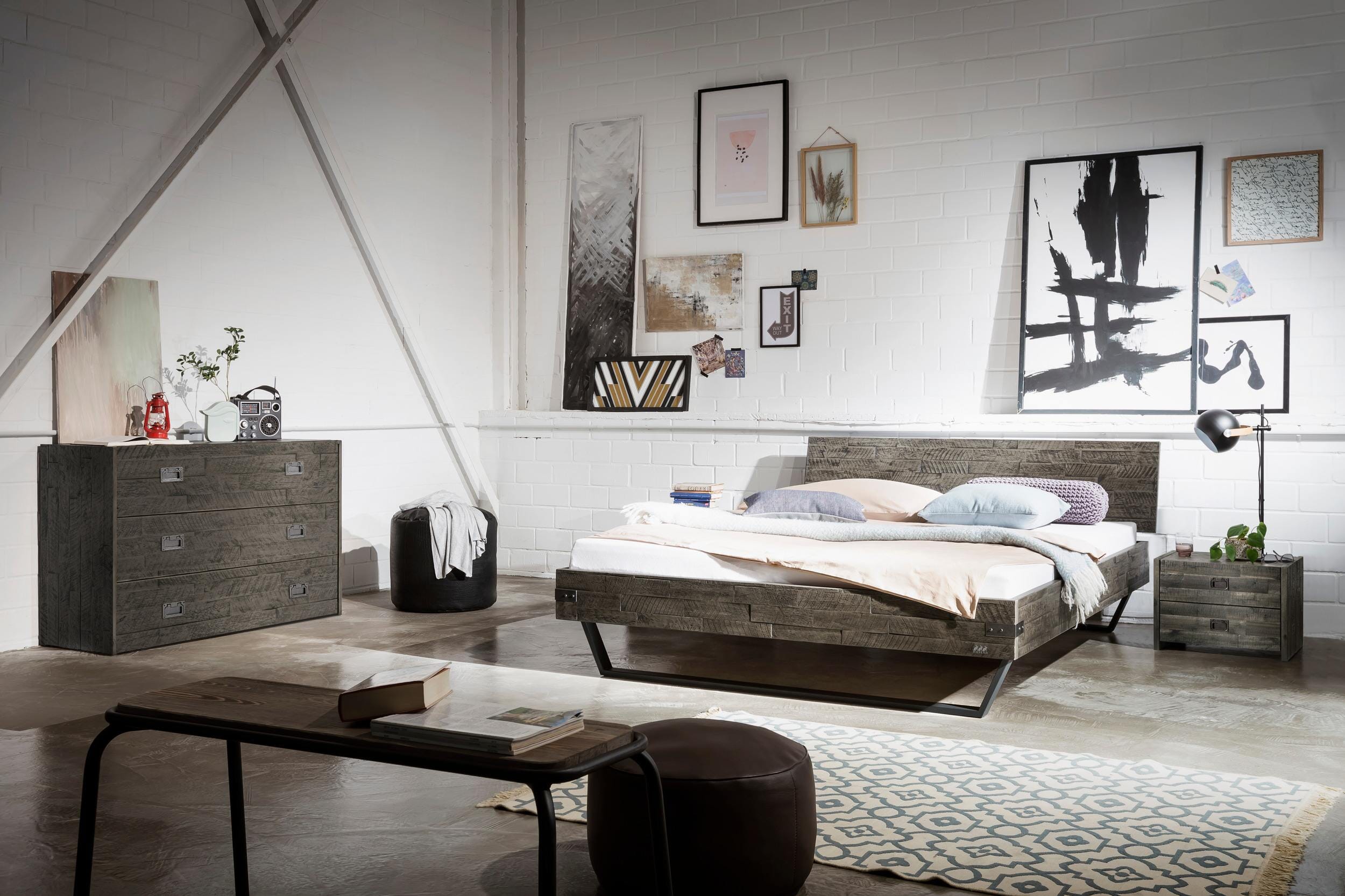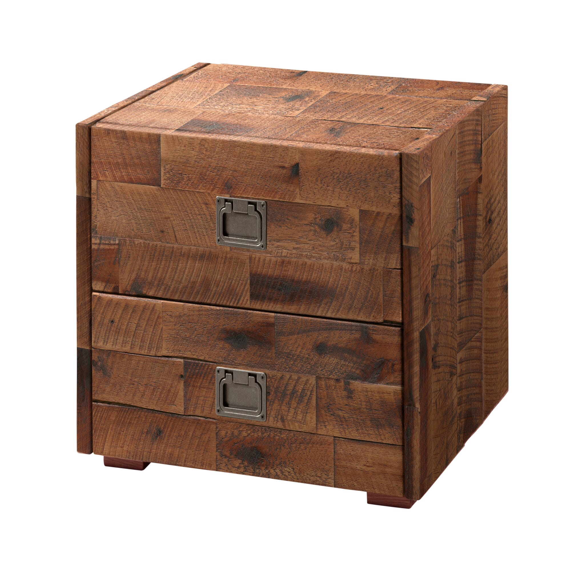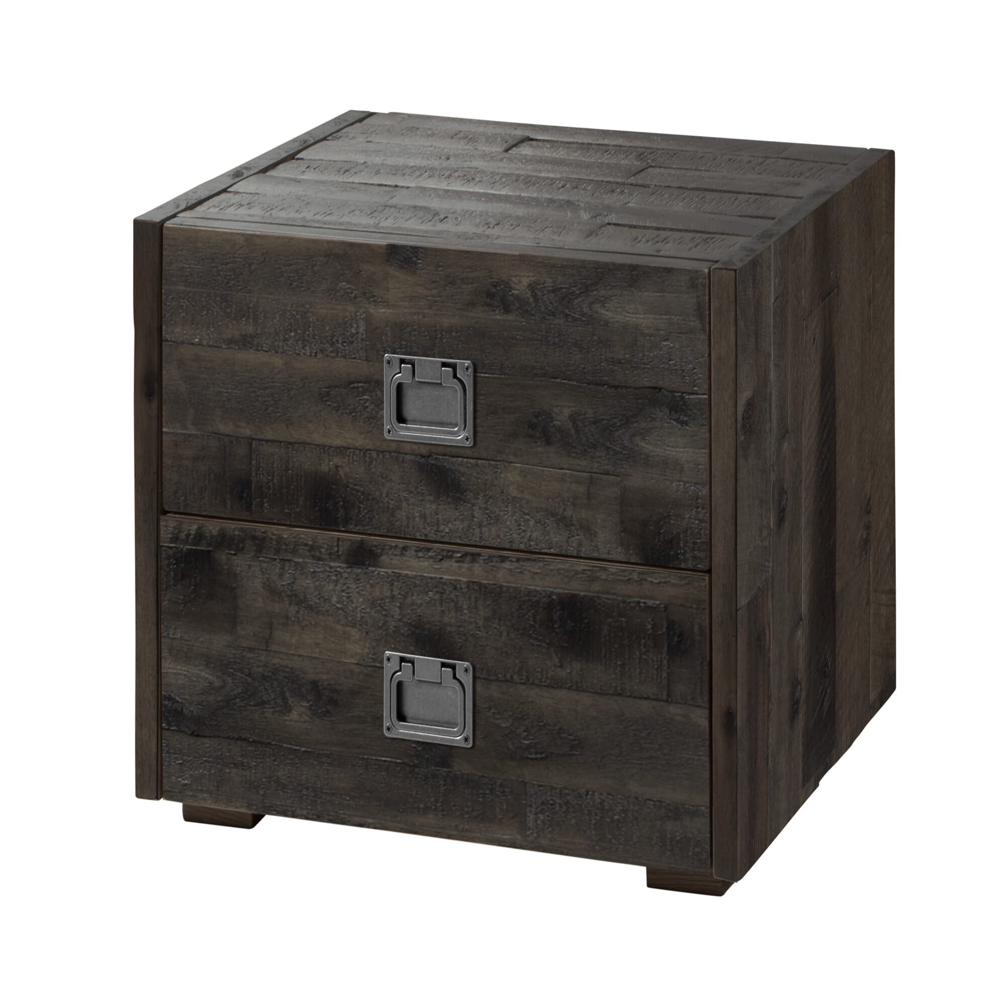Der Nachttisch Lica bietet mit seinen grossen Schubladen genügend Stauraum. Die versenkbaren Metallgriffe im Used-Look harmonieren dabei perfekt zum Industrial-Style. Die Oberfläche des Massivholzes wird unregelmässig verleimt, dadurch entsteht der einzigartige Factory-Look.