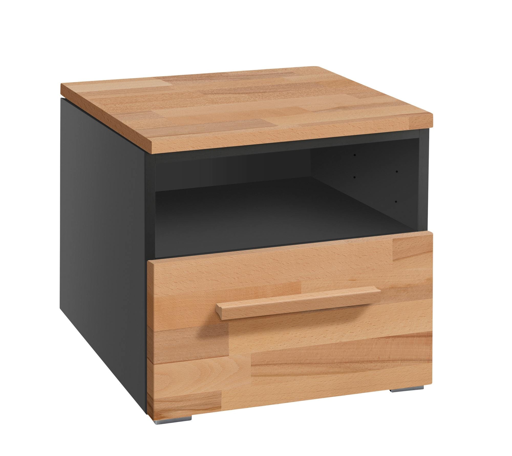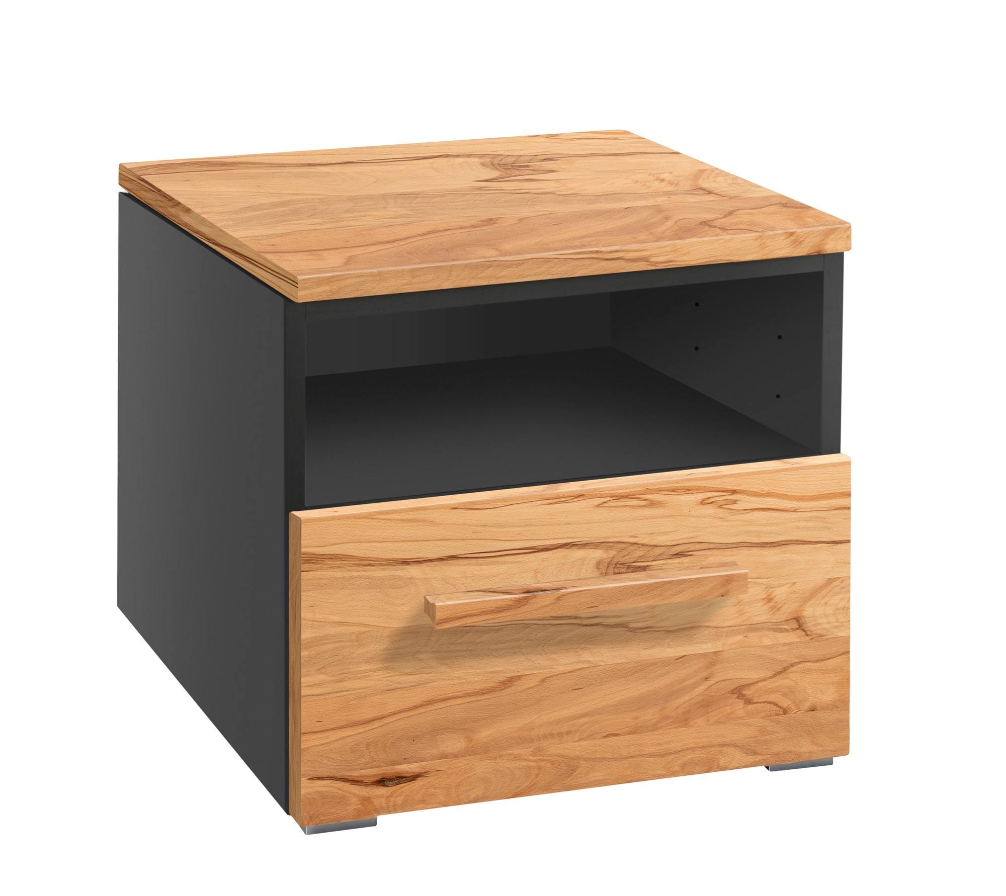 Offen und geschlossen – mit diesem spannenden Gegensatz kann ONIA die Herzen erobern. Dabei kuschelt sich die kleine Nachtkommode ganz dicht an das Bett. Bettlektüre, Lampe, Wecker und vieles mehr können Sie in und auf diesem tollen Nachtkästchen verstauen. Der Korpus ist, wahlweise in Weiß oder Anthrazit foliert. Die Oberseite und die Front kommen in Kernbuche oder in Wildbuche daher.