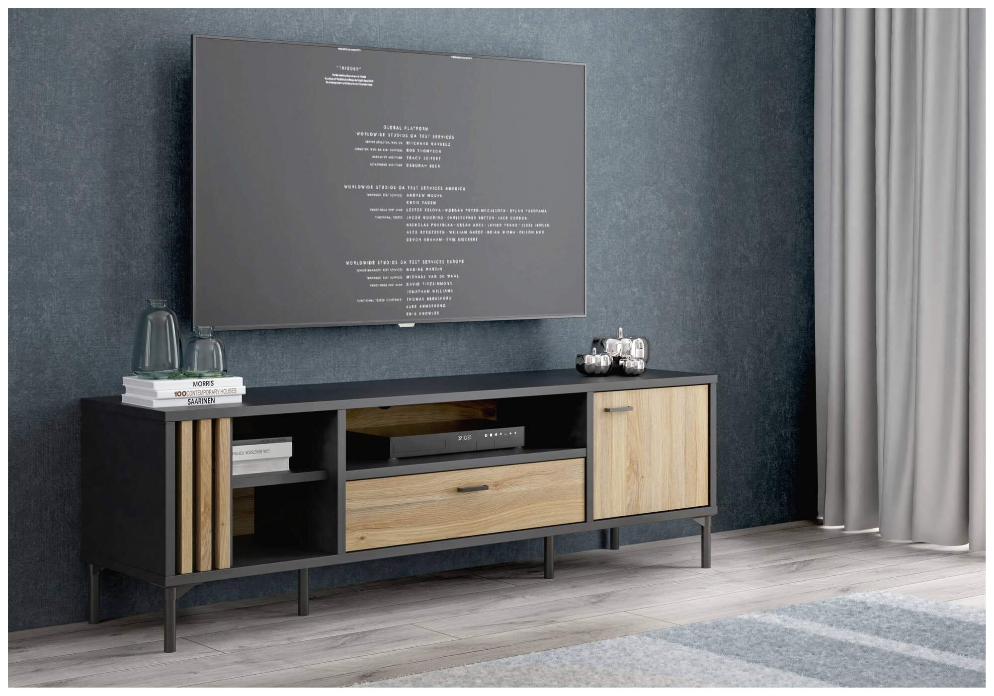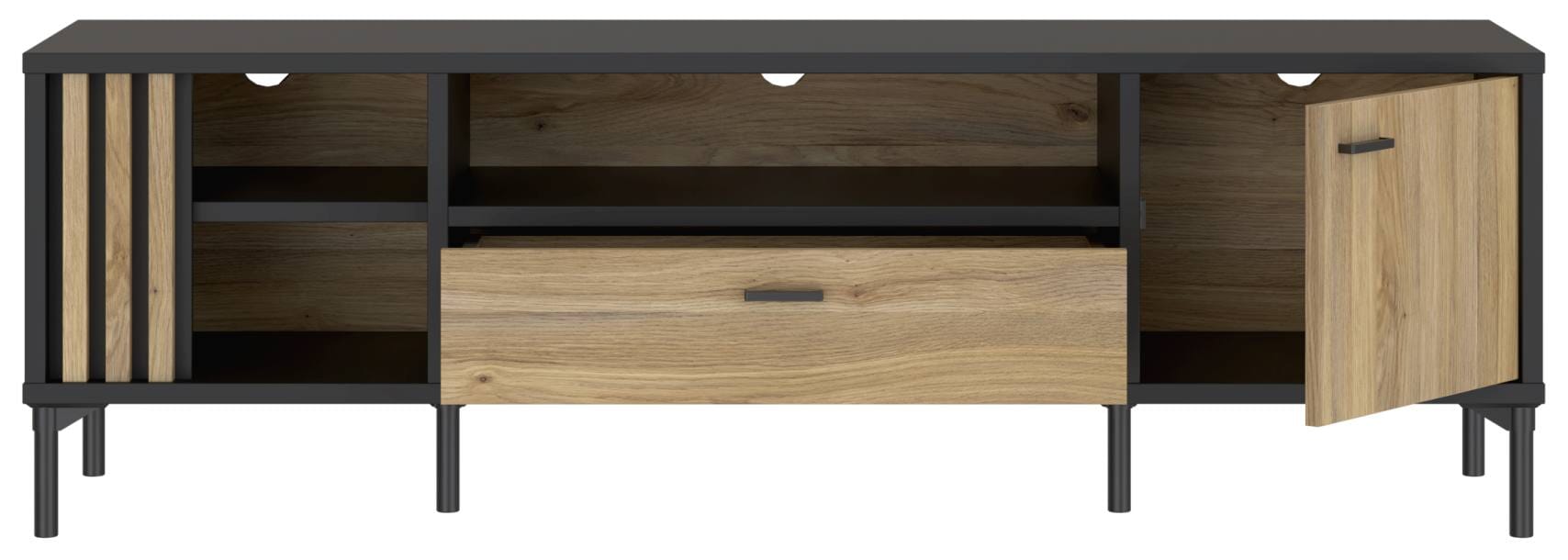 Die Beschreibung lässig und cool allein trifft es noch nicht. Das TV-Board Lowboard JOAKIMIS ist beides, sowohl cool als auch gemütlich. Das macht die schöne Mischung aus Schwarz mit hellem Holz, naturnaher Mauvella Eiche Nachbildung, und den wirklich smarten Beinen, ebenfall in schwarz, aus.