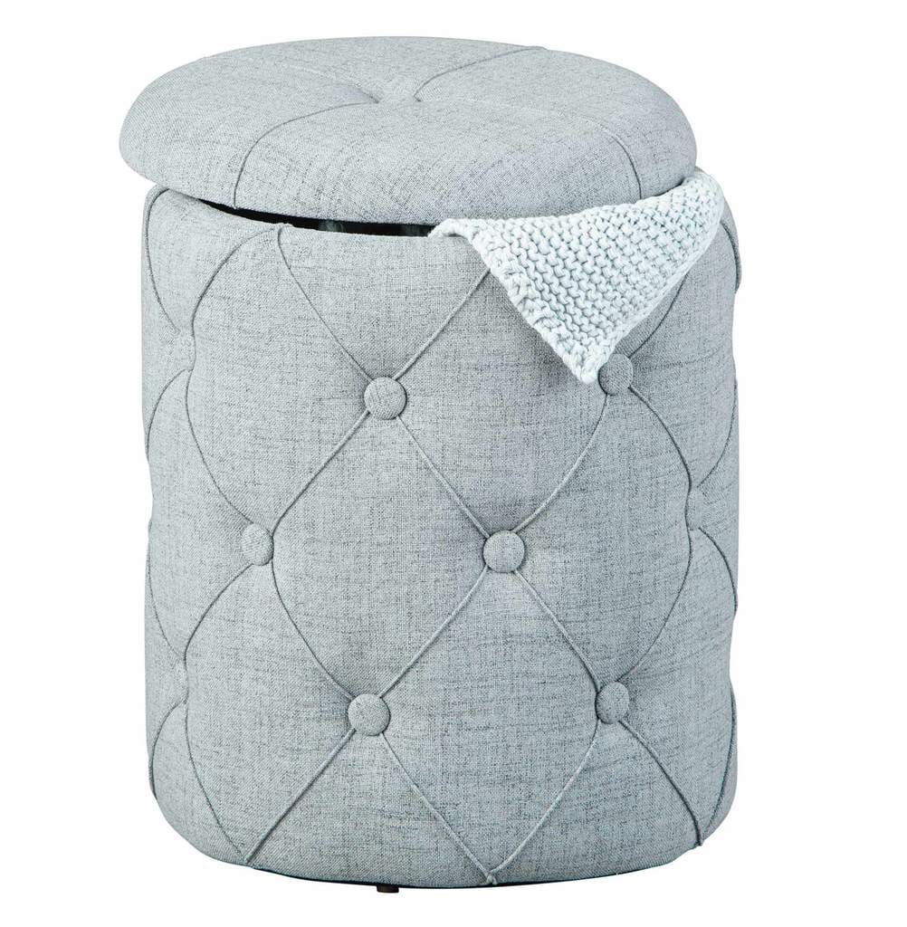 Die gemütlich wirkende Form lässt Sie mit Freude Platz nehmen auf diesem Hocker. Bevor Sie das tun, betrachten Sie den Stoffbezug ausführlich. Ein eleganter Grauton ist eine gute Wahl, der passt immer.